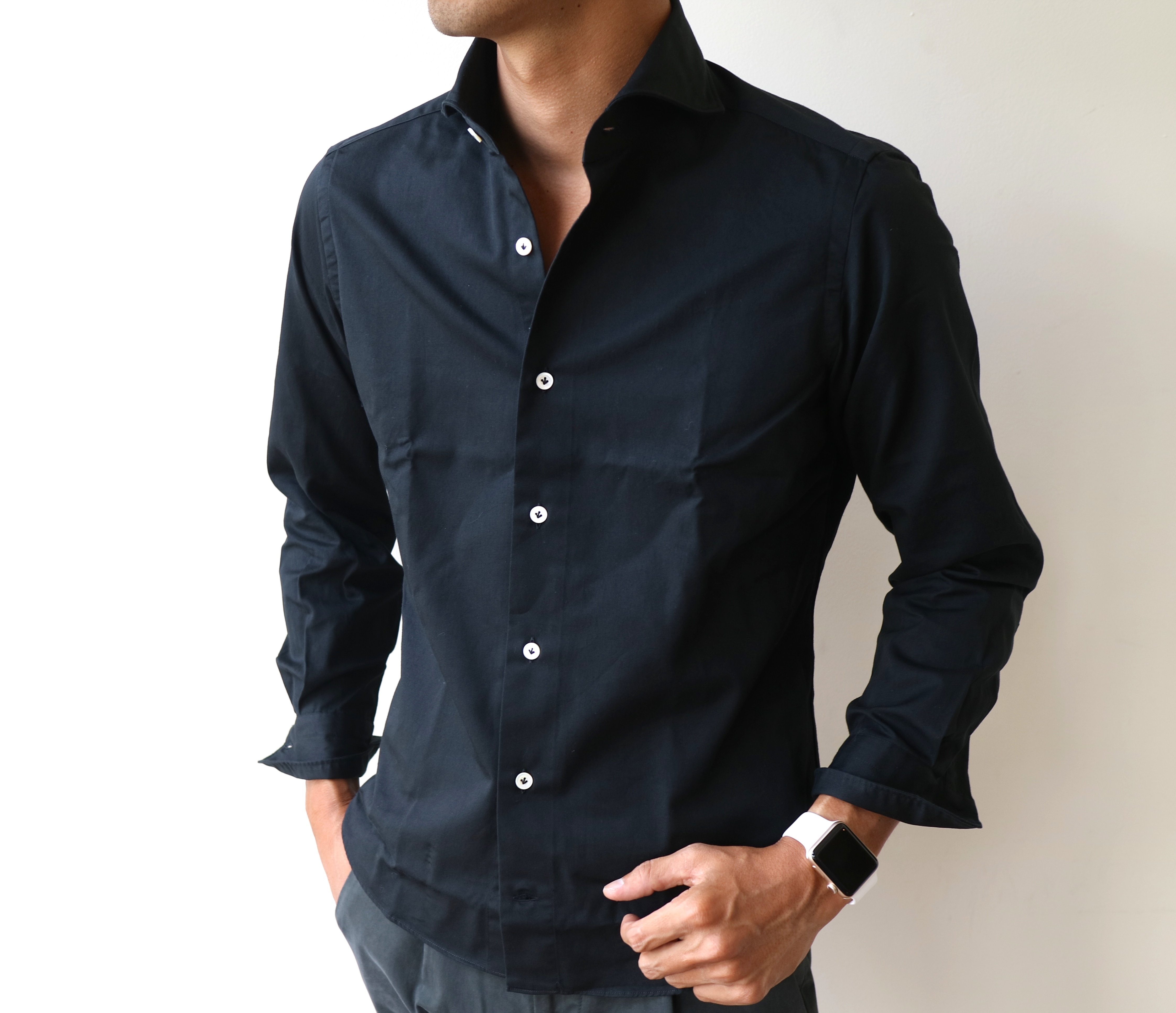 オックスフォード地のように、ナチュラルなシワを寄せながら、洗いざらしで着ると格好が良さそうです。定番のホワイトに、ほんの少しグリーンがかったネイビー、カジュアルで意外と使いやすいブラック。3色、短丈の「VINCI FIT/ヴィンチ フィット」でご用意しました。モデルは身長183cm・体重67kg・胸囲94cmで、サイズ39を着用しております。
