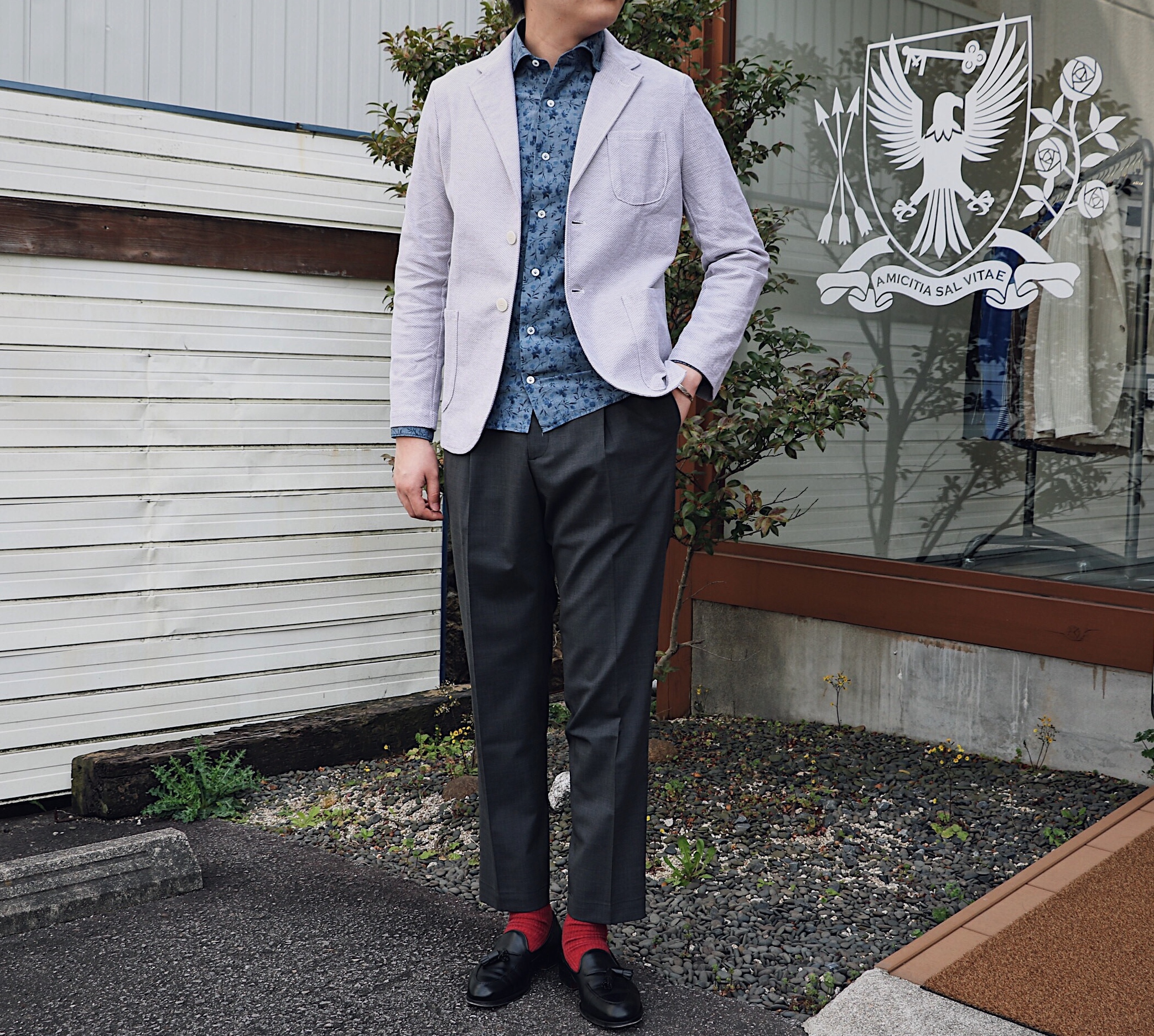 まずは、爽やかなライトグレイ。giannettoのフラワー柄シャツと合わせてみました。伸縮性がある生地を採用していますので、ストレスはなく軽快な動きも可能。カーディガン感覚で羽織れるイージージャケットです。サイズ感は、タイト過ぎず、ちょうど良い絞り具合になっていますので、ラフに着用するにはピッタリなサイズ感です。