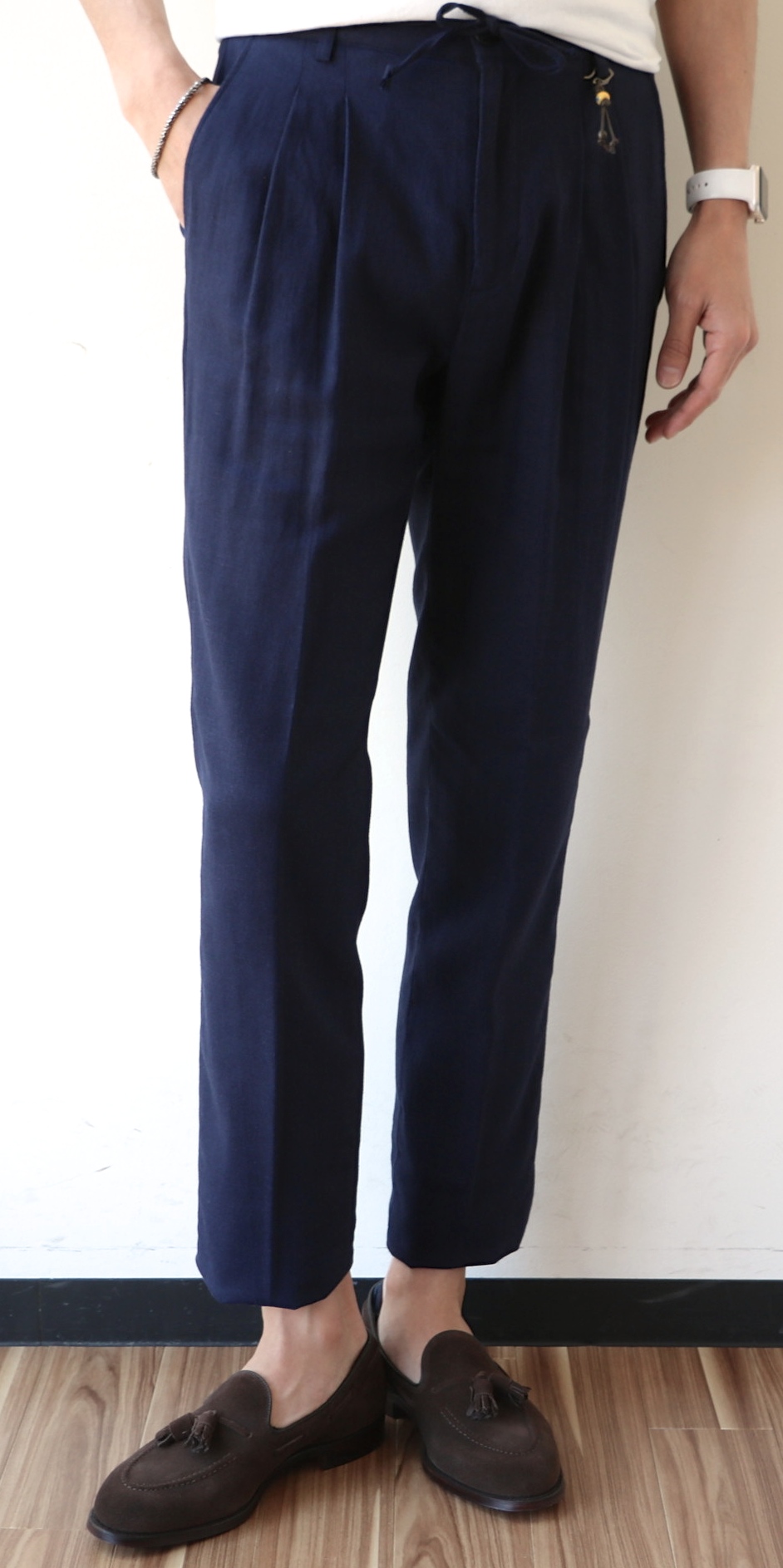 共生地のパンツは、リラックス感のあるシャーリングパンツ。軽やかな生地とよくマッチする形です。一方で、ツープリーツが入り、イタリア的クラシック風な味付けも、デザインに反映されております。また、ベルトループも付いていますので、いざという時ベルトも装着可能です。