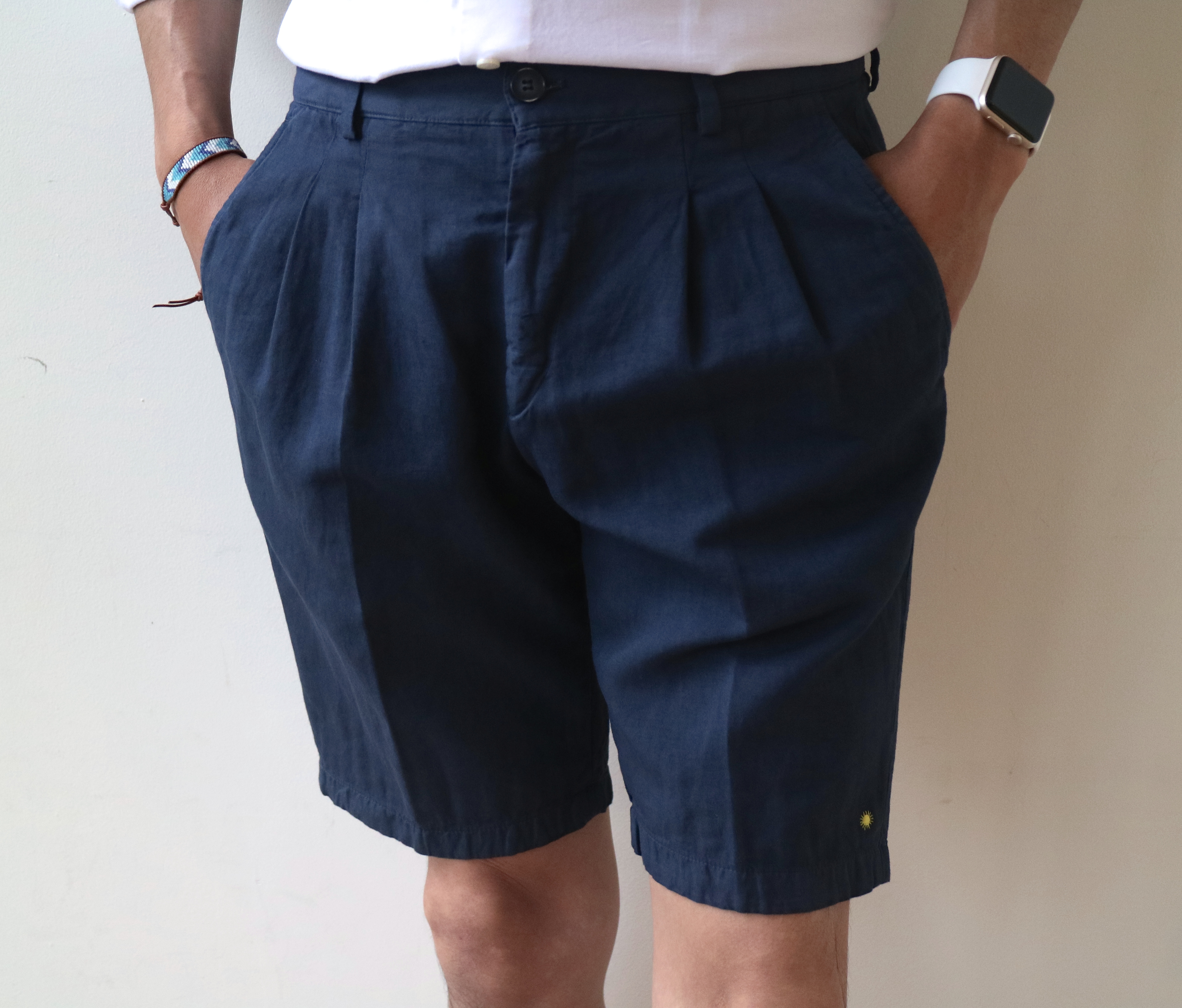 MODEL:「ERIC」リネンコットン ガーメントダイ プリーツ入りショートパンツ