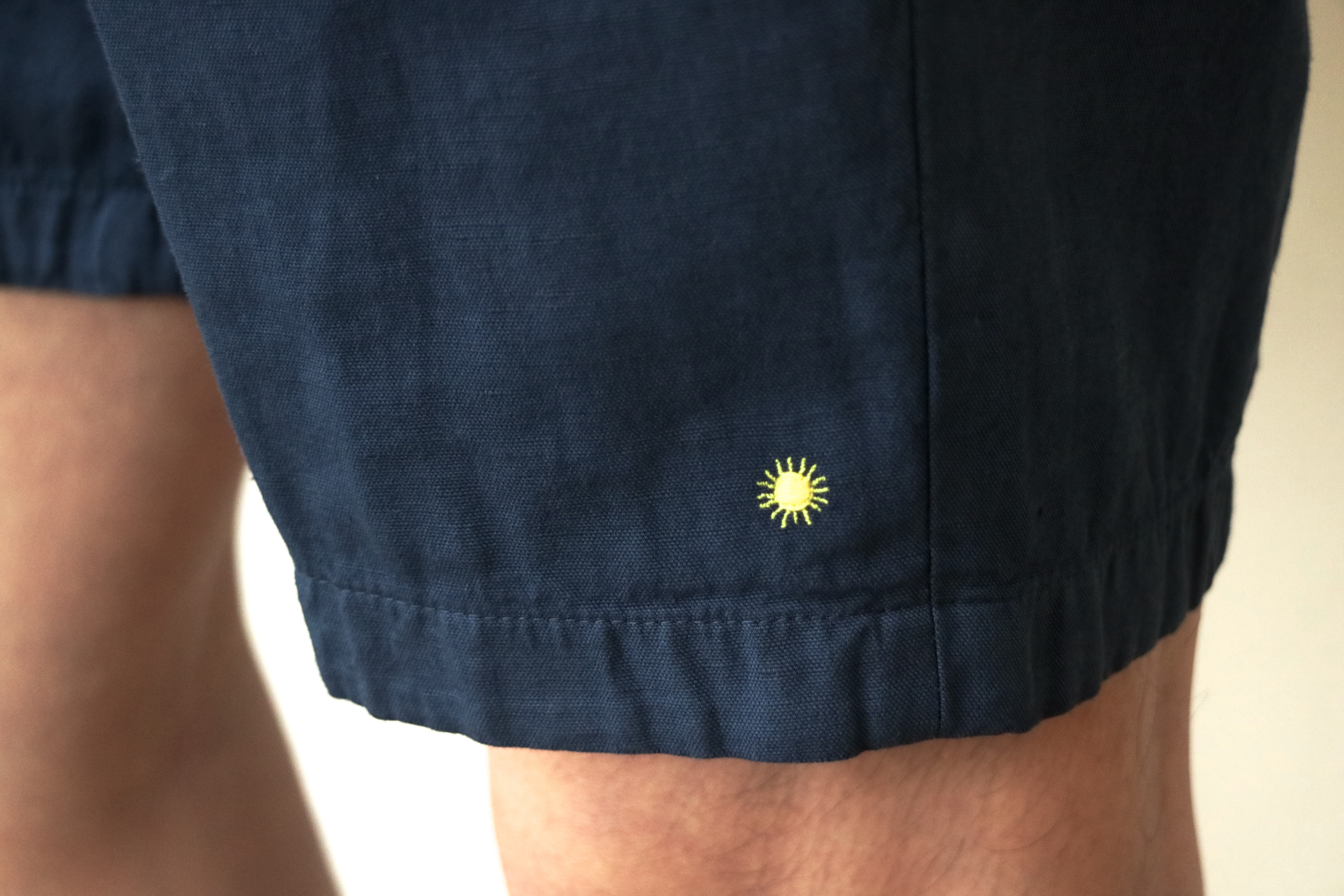 太陽のマークは、こんなところに。生地はリネンコットン。リネンのシワ感とコットンのシャキッと感の良い所取りで、季節感をアピールできます。