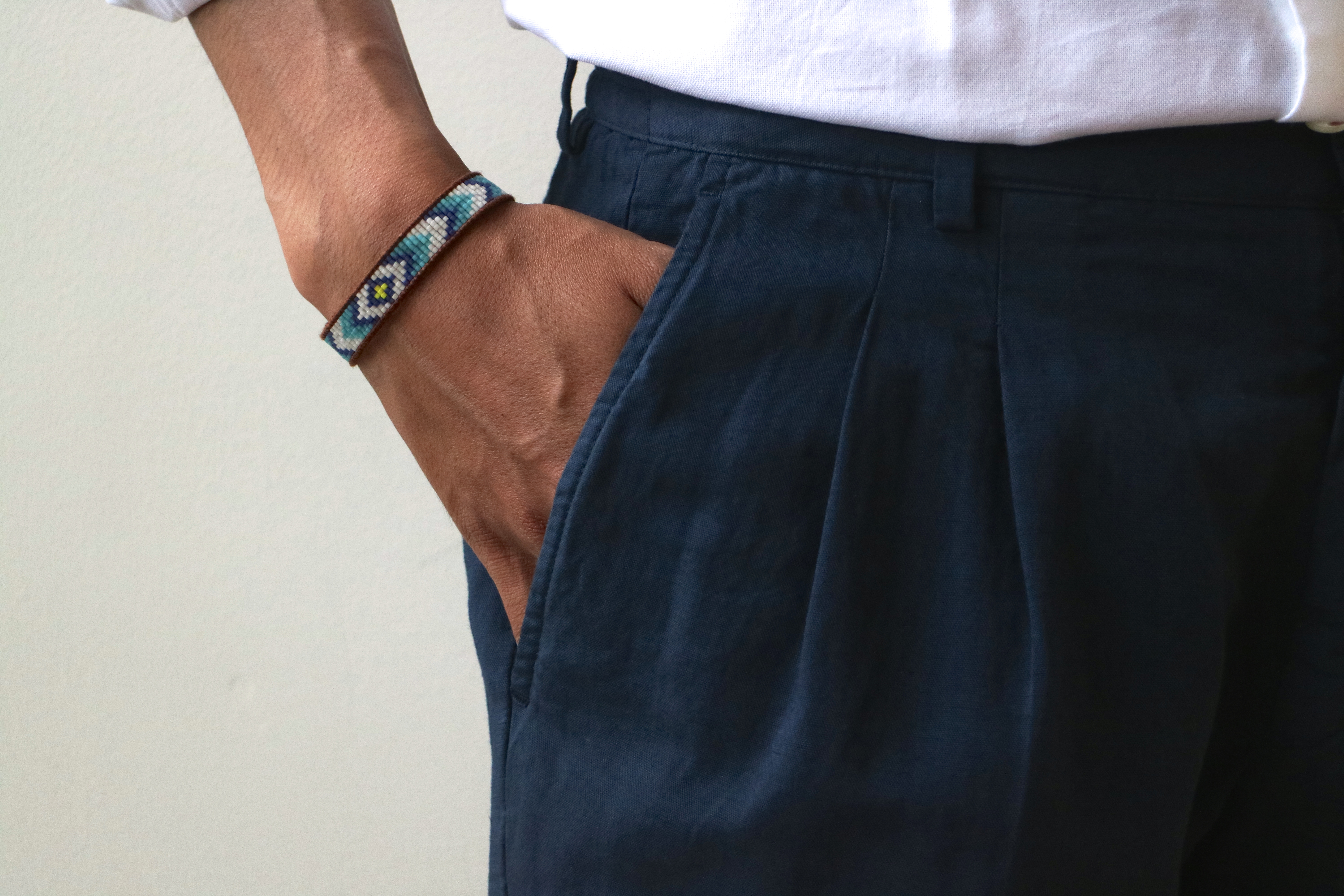 シャツ生地があれば、コートでもパンツでも作ってくれるジャンネット。ただ、それぞれが秀逸なデザイン・サイジングで仕上がっていることも、きちんとお伝えしなくてはいけません。ジャンネット・パンツに関しては、シャツ生地ということもあり、ややリラックス寄り。写真のように、股上深め&太ともゆとりアリで、裾にかけて緩やかにテイパードがかかります。肌と生地の間に程度な隙間が生まれ、穿きやすい,気持ち良い&涼しい...と好意的な感想が生まれてくるはず。シアサッカーの生地とは、抜群の相性を見せてくれるのです。