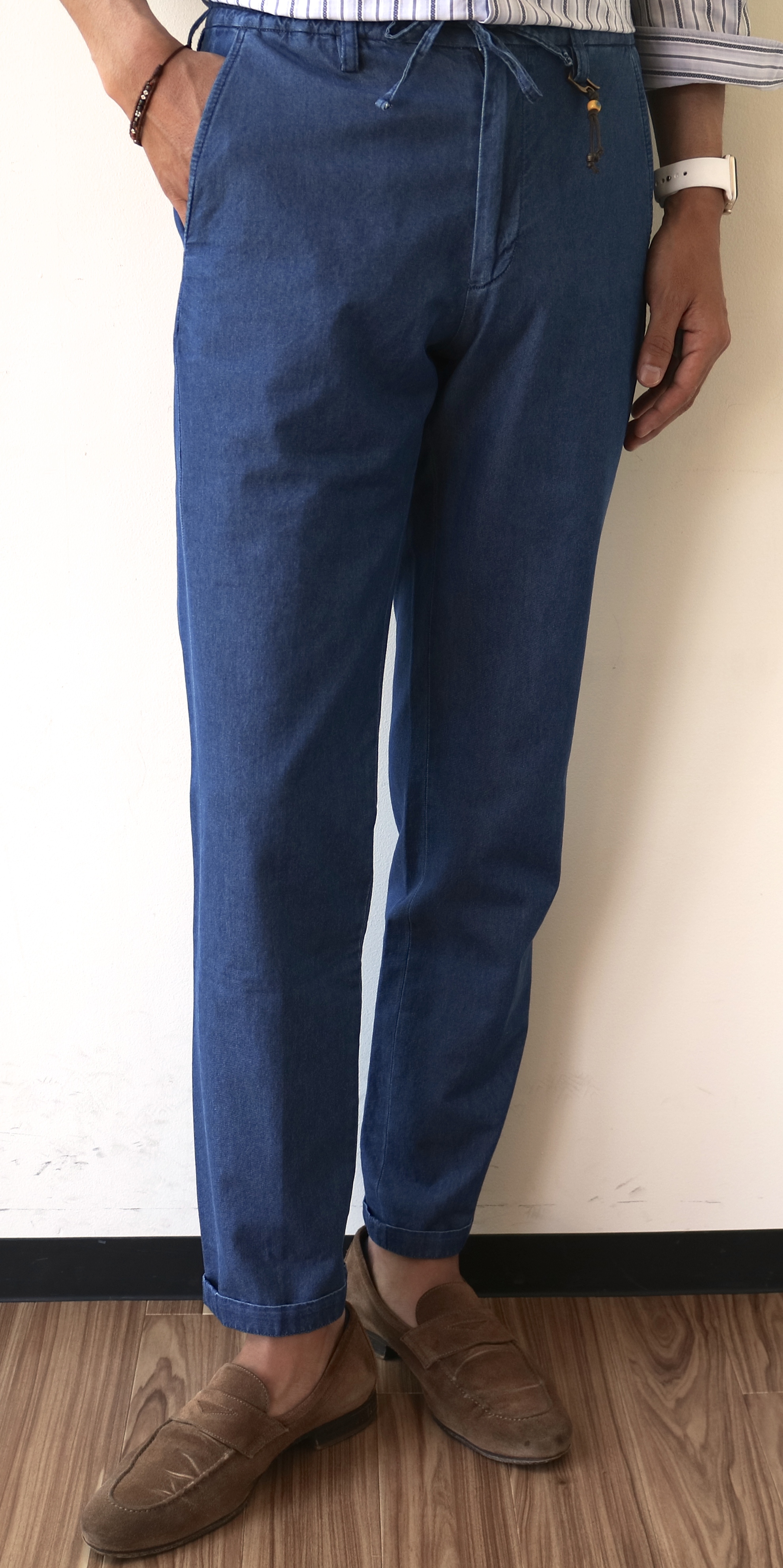 デニム生地を使ったパンツもございます。こちらはドローコード付き。ウエストの後ろ半分はやはりゴムが仕込まれております。