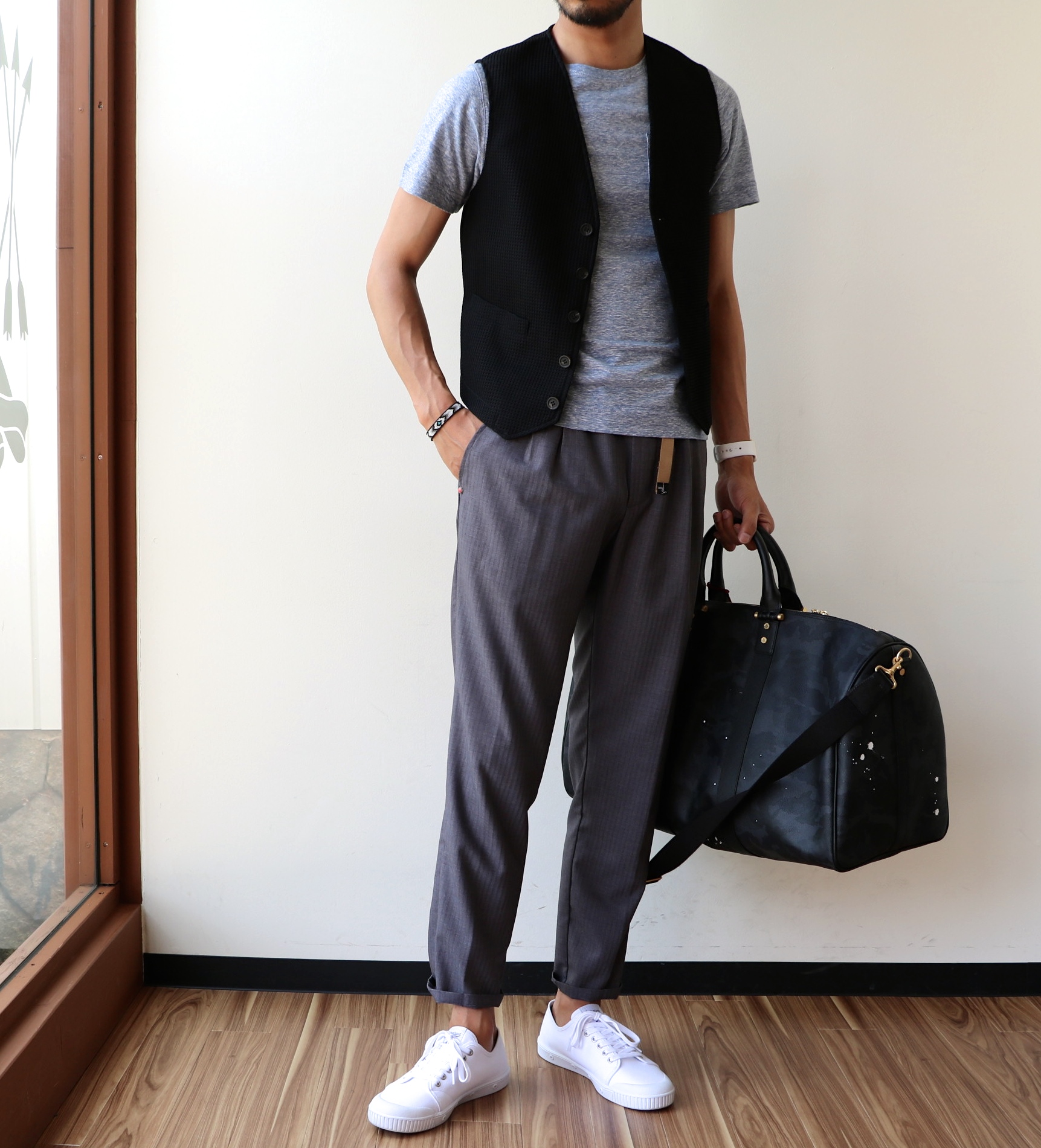 Tシャツ+ジレ。真夏に実践したい合わせ方です。リネンコットンのCIRCOLO 1901のTシャツに、Giannettoのシアサッカー・ストライプパンツ。最後にコーディネートを締めるのが、黒のジレ。そう言えば...、