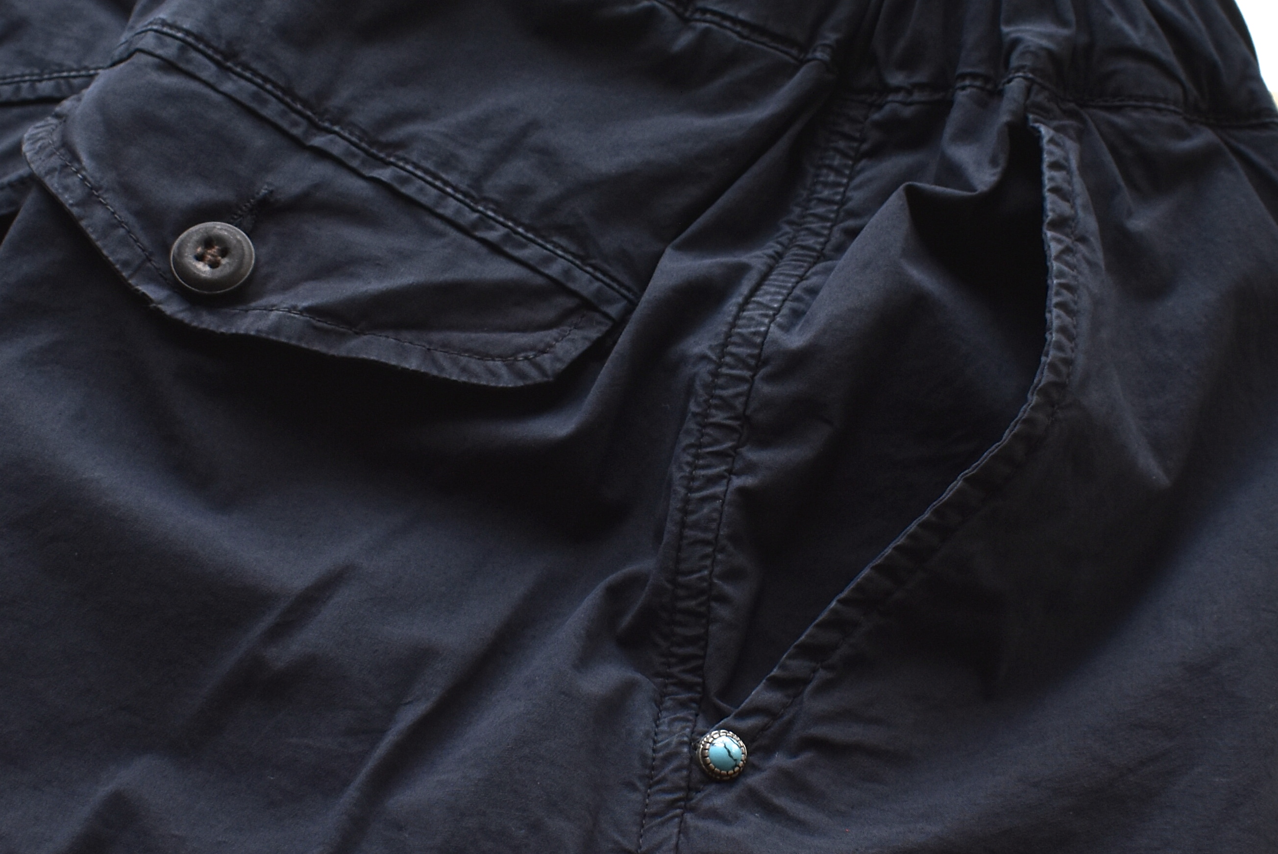 生地は、打ち込みのしっかりしたタイプライターの生地で、ガーメントダイ。麻の混紡はありませんが、パリっとして、これはこれで涼しい生地感。右ポケット下のターコイズは、ショートパンツでも同様のようです。