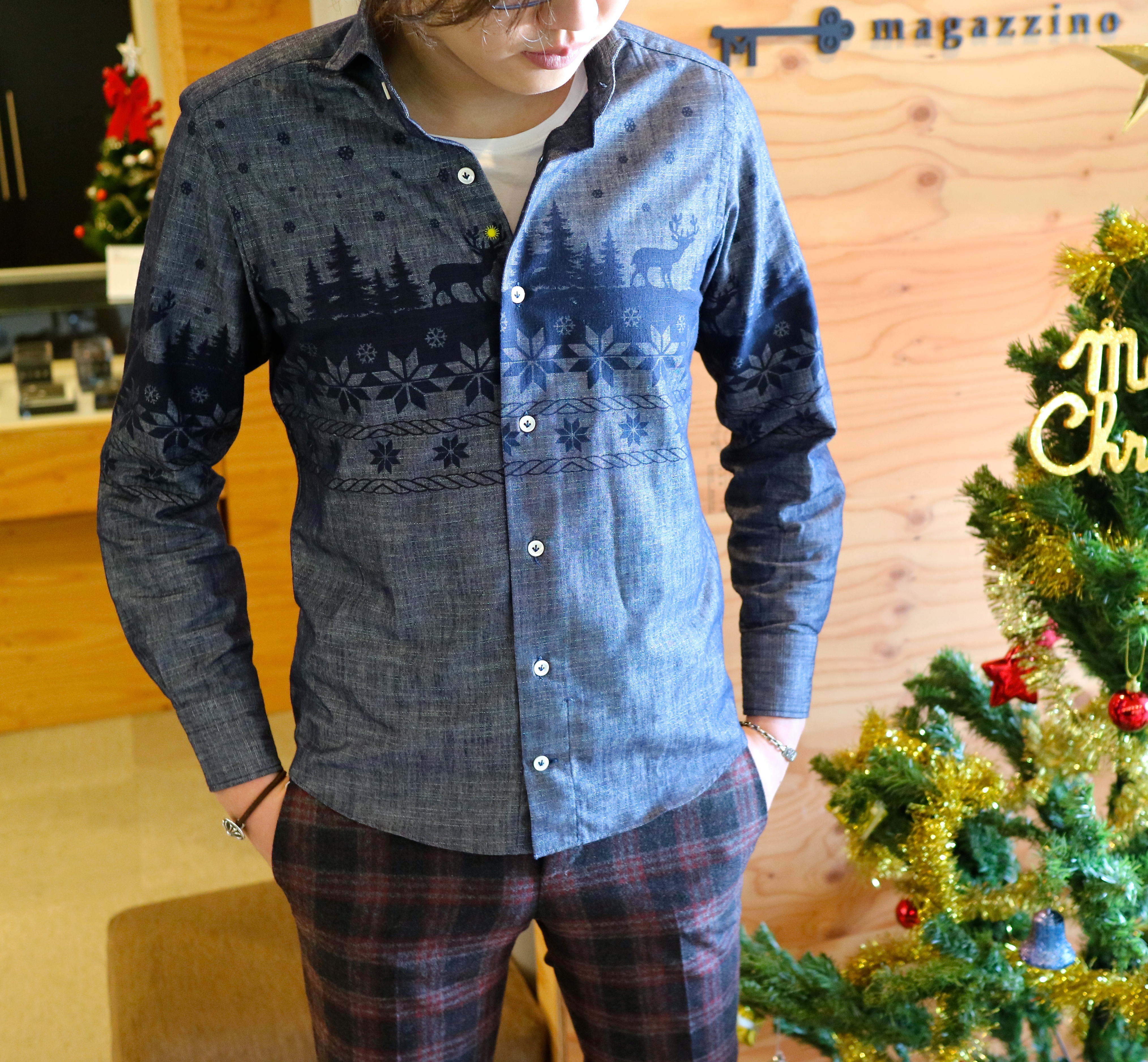 SHIRT:【Giannetto /ジャンネット】「VINCI FIT」トナカイモチーフ ノルディック柄シャツ