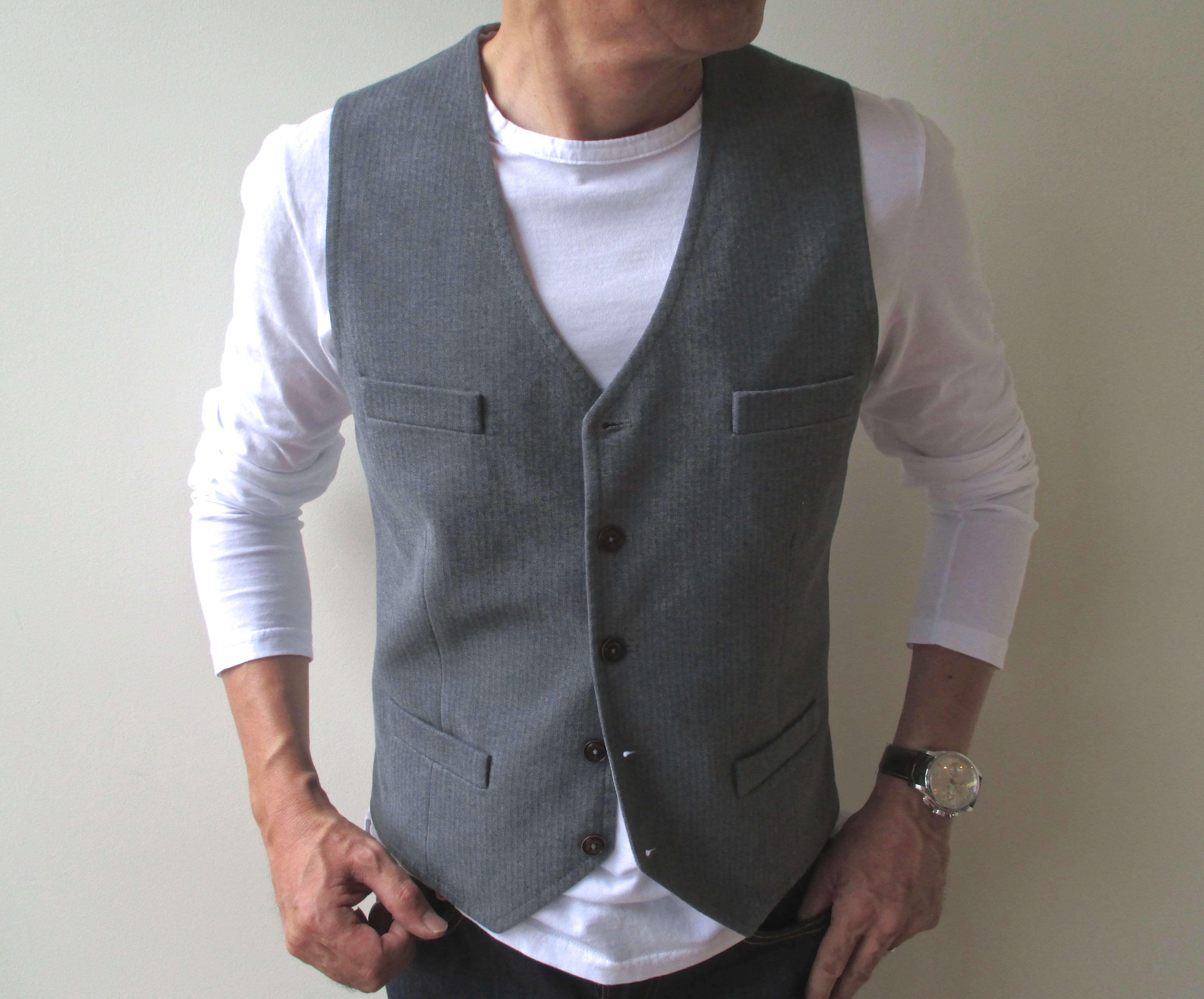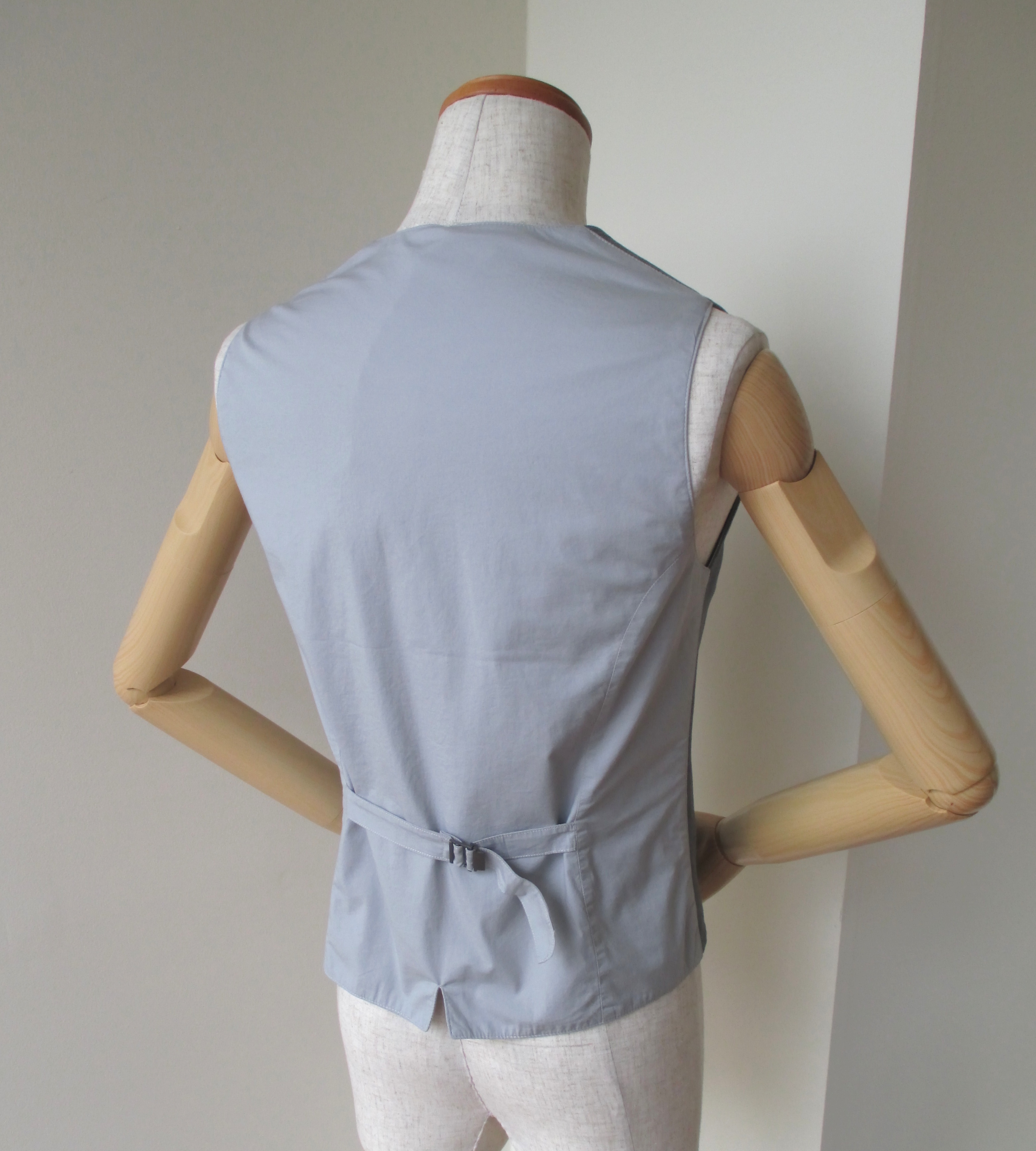 続いてジャケットと共地のジレです。シャツやカットソーの上に羽織ってアウター的に使うもよし、ジャケットやブルゾンの中に着用してインナー的に使うもよし、の便利アイテムのジレ。後身頃にはアジャスターも付属し、こちらも外見はクラシック。なのですが、表地も後身頃もストレッチ素材。イージーな着心地は、やはり健在です。