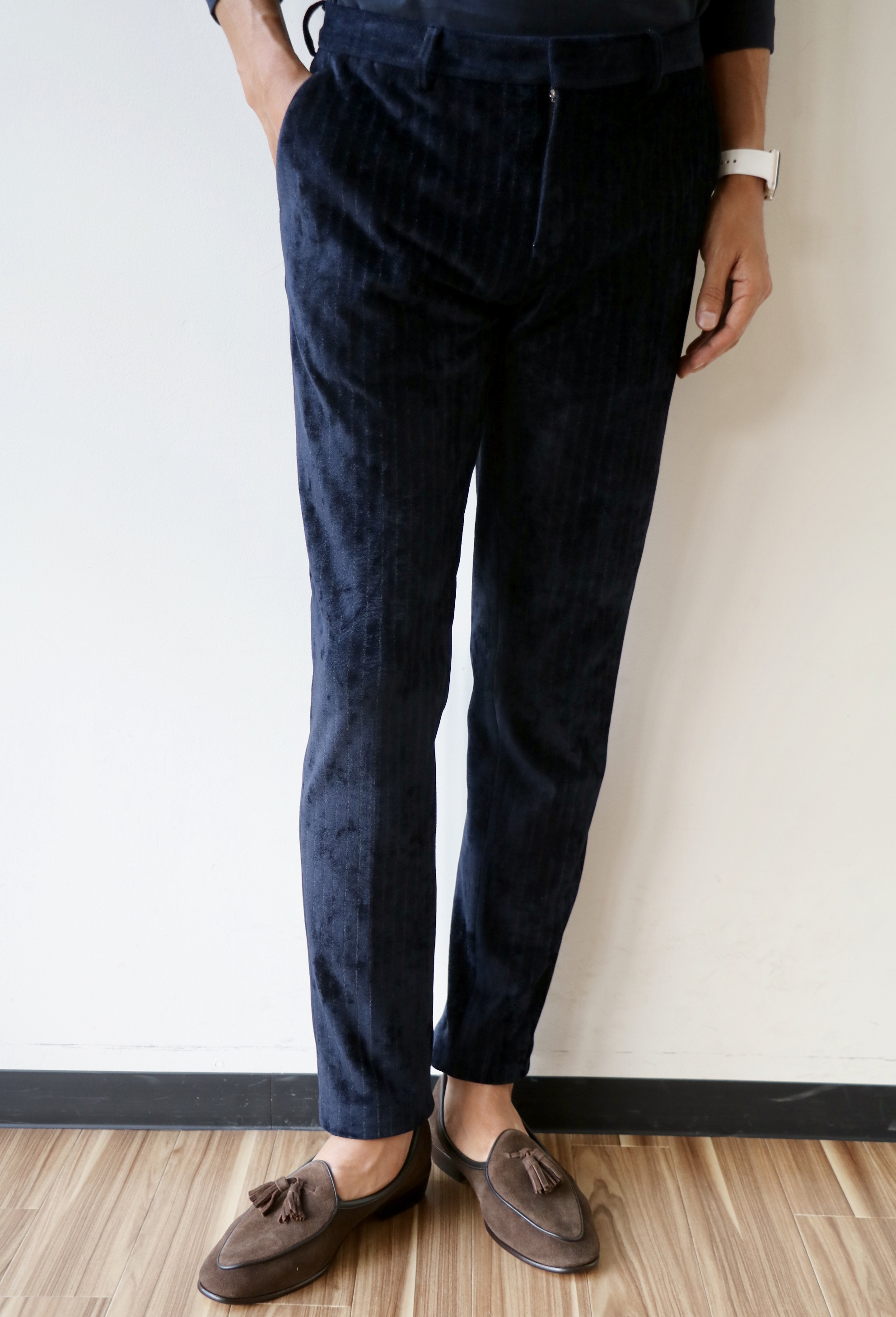 無造作に浮かび上がる光沢は、ベルベットの生地。薄いイエローのストライプと絶妙にマッチし、セクシーな雰囲気に。ネイビーと呼びましたが、ミッドナイトブルーと言った方が良さそうです。