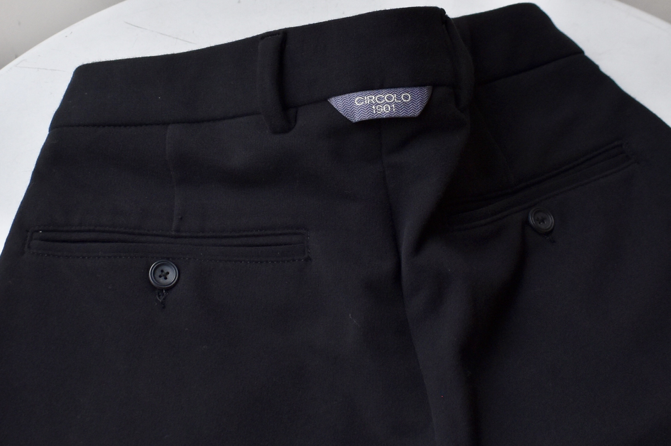 さて、本題でありますが、一捻りあるネイビーのセットアップです。光沢があり、ムーディー。【CIRCOLO 1901/チルコロ】から面白い提案です。