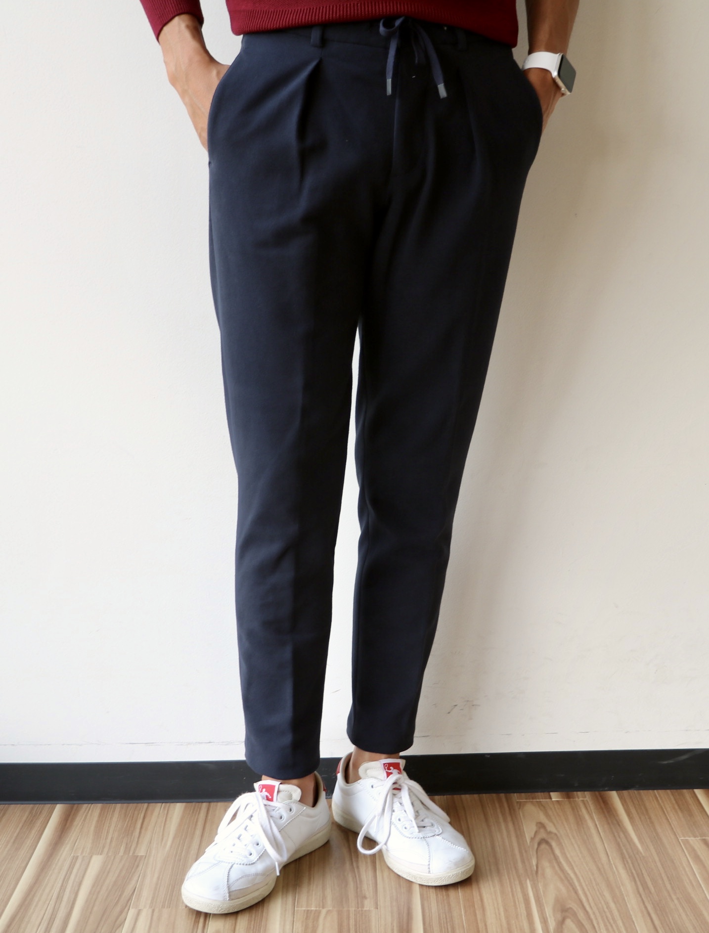 選んだのは、ドローコード付きの細身なシルエット。浅めのワンプリーツは、ほとんど飾りのようなイメージです。