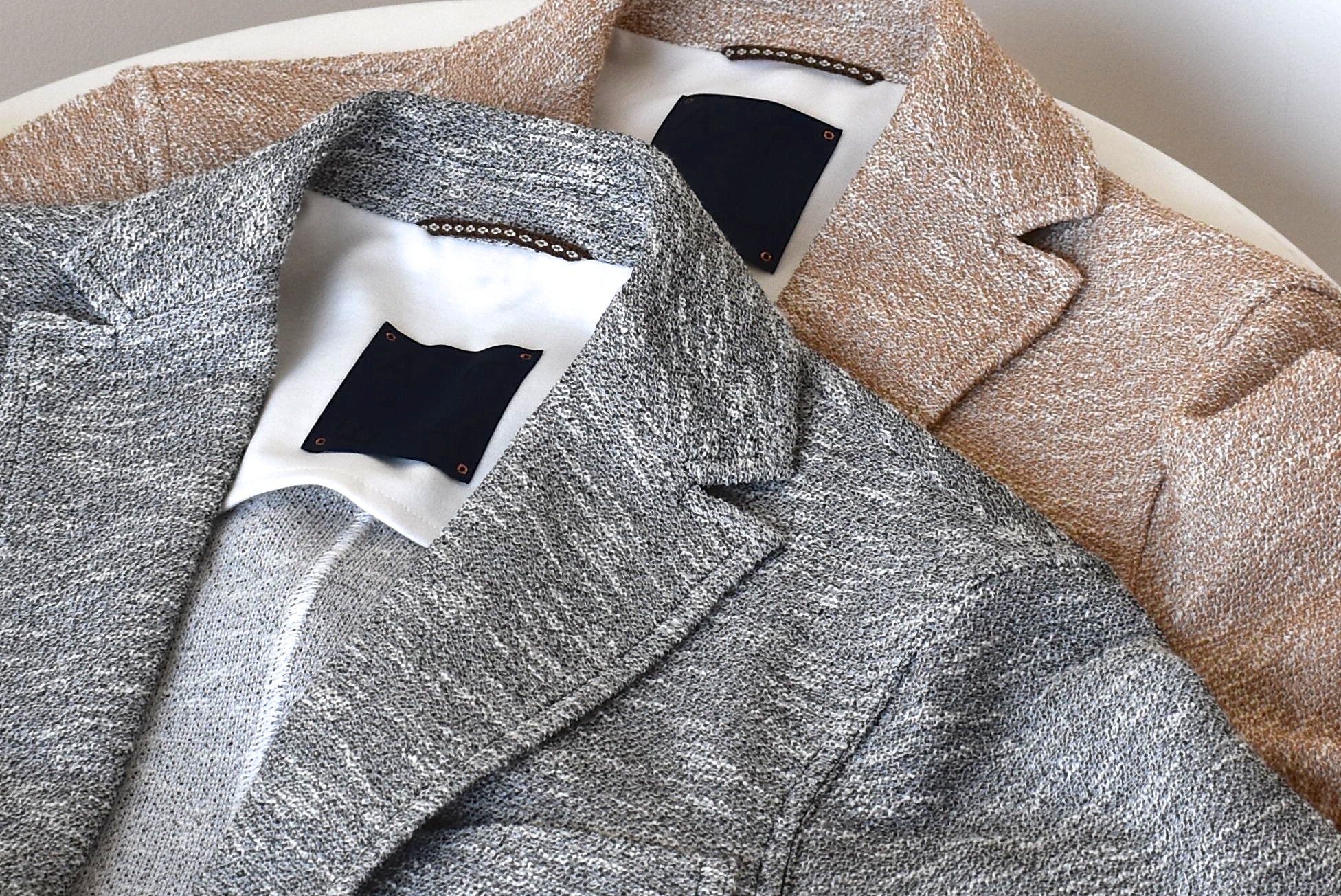 率直に言って、ザラザラして気持ちの良い手触り。生地に触れた際、これこそ夏に着たいジャケットだ!!...そう電撃が走りました。両色ともメランジがかった、ライトグレイとベージュをご用意しております。