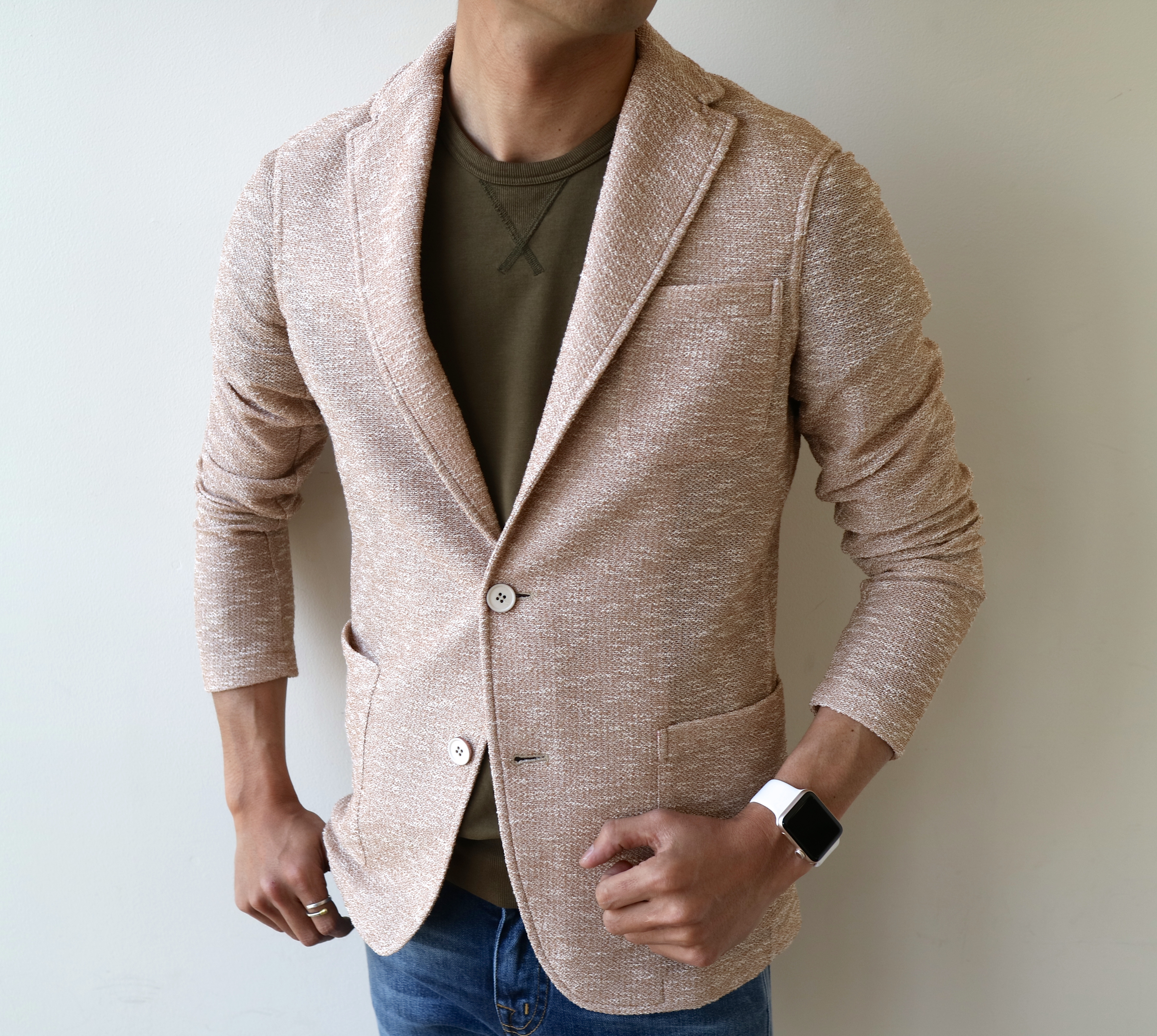 ホワイトジャケットほど照れず、自然に春らしさ・夏らしさを演出できる色味ではないでしょうか。デニムやネイビー・ブラックのアイテムと合わせると、すんなりと馴染むんじゃないかと思いますよ。