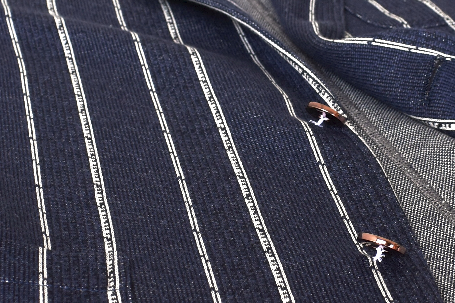 生地スワッチを引用しますが、オルタネート ピンストライプとあります。しかも、コッパーのエクスクルーシブ生地。凝った生地の匂いがプンプンします。