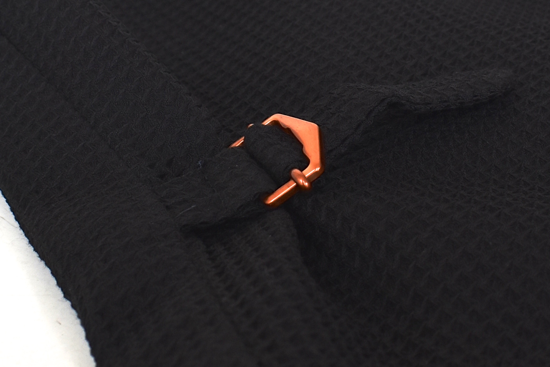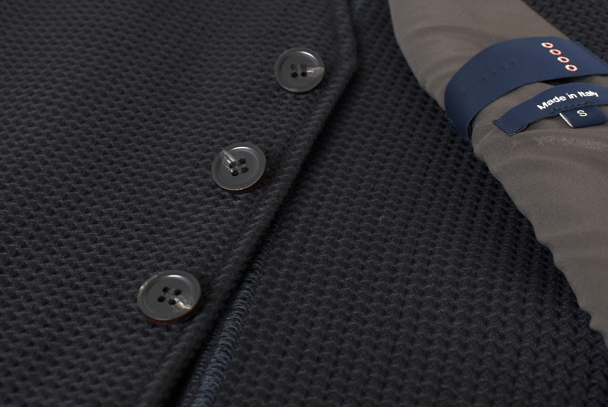 ウールコットンのワッフル織りは、適度にエレガントで、適度に表情の付く生地でしょう。クールなブラックには、最適な生地かもしれません。
