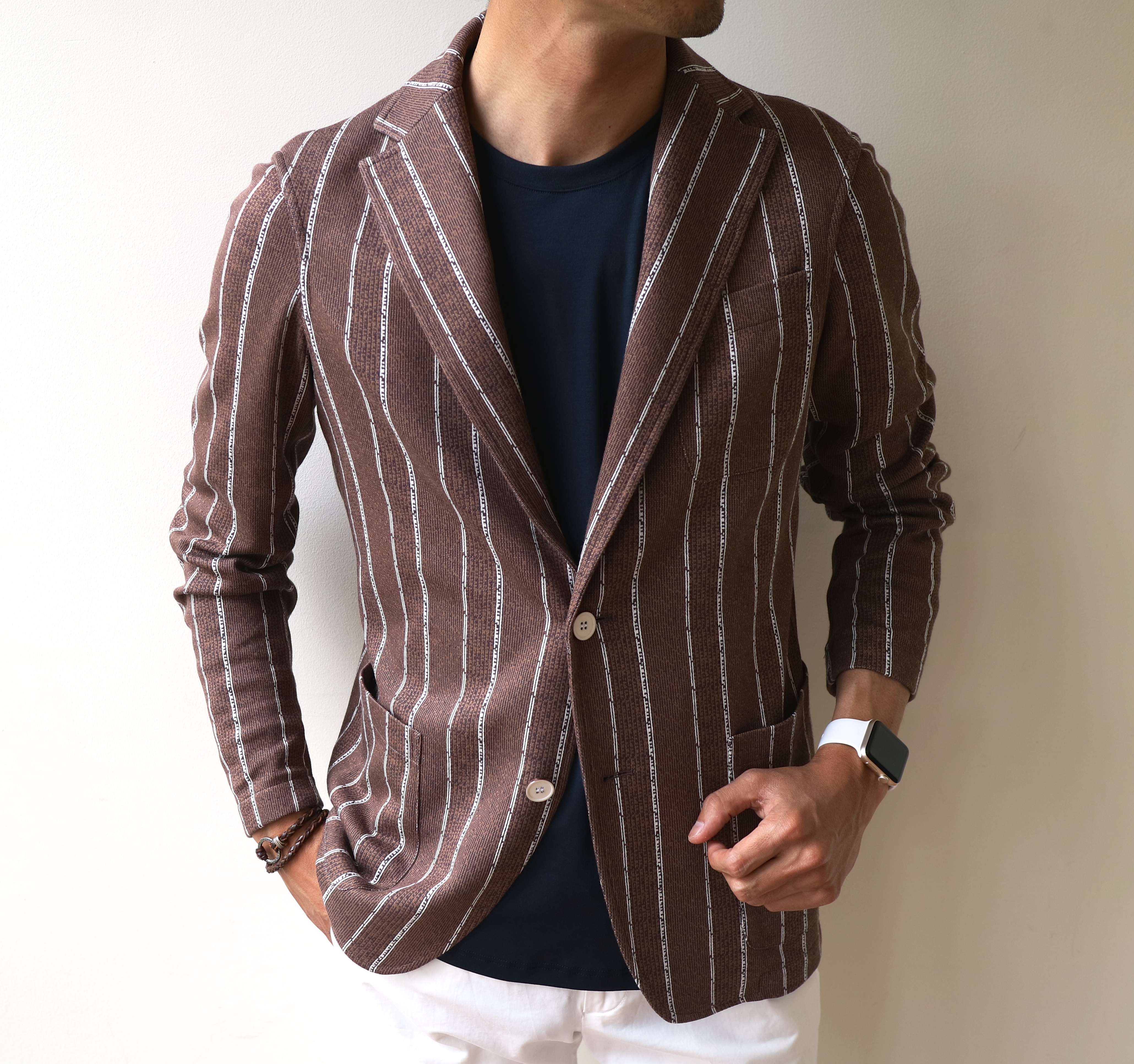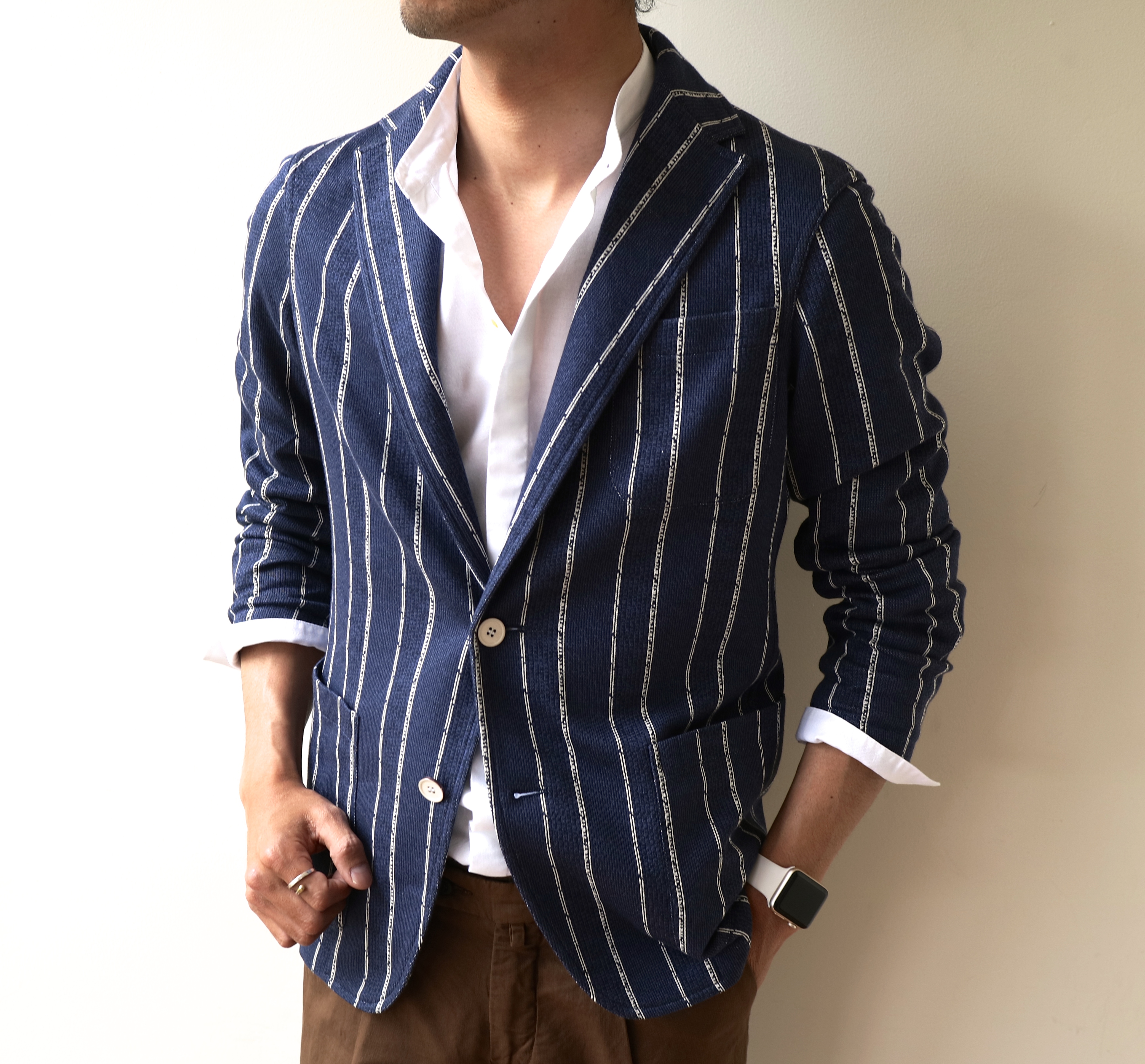 照りつける太陽に、よく映えます。夏はリネン素材のジャケットや、シャツ地のジャケットなど、イロイロあります。本ジャケットは、形はジャケットながら、着心地はカーディガンのような感覚。気軽で・軽快なところを、ウリにしております。