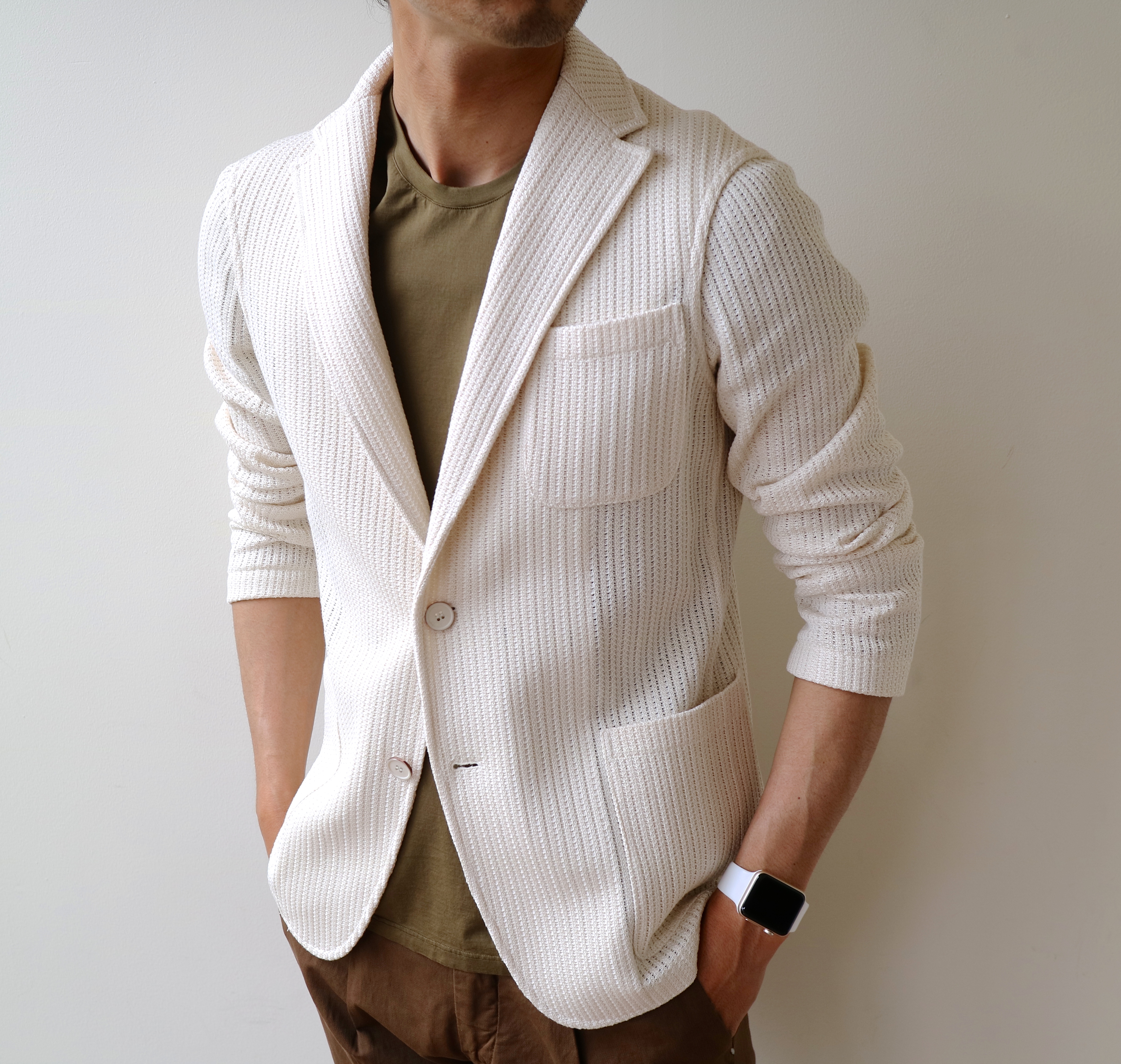 ジャケットの生地は、イレブンティが得意とする春夏仕様のジャージー生地。ニットはコットン100%の、適度に編み感のあるサマーニットとなっております。