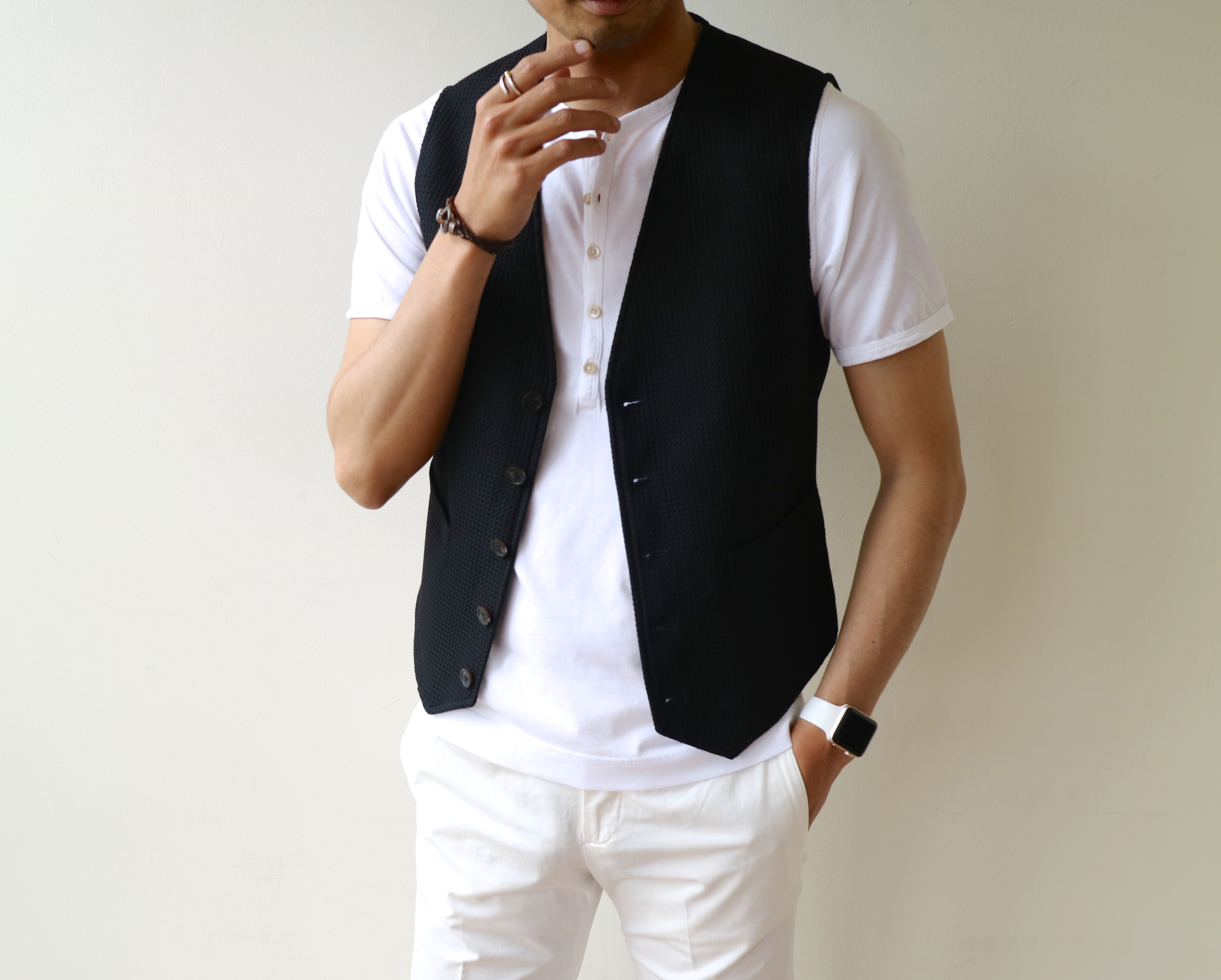 続いて、ジレです。夏場のアウター使いもイメージし、クールなブラックでご用意してみました。Giannettoのバンドカラーのシャツをインに着ています。
