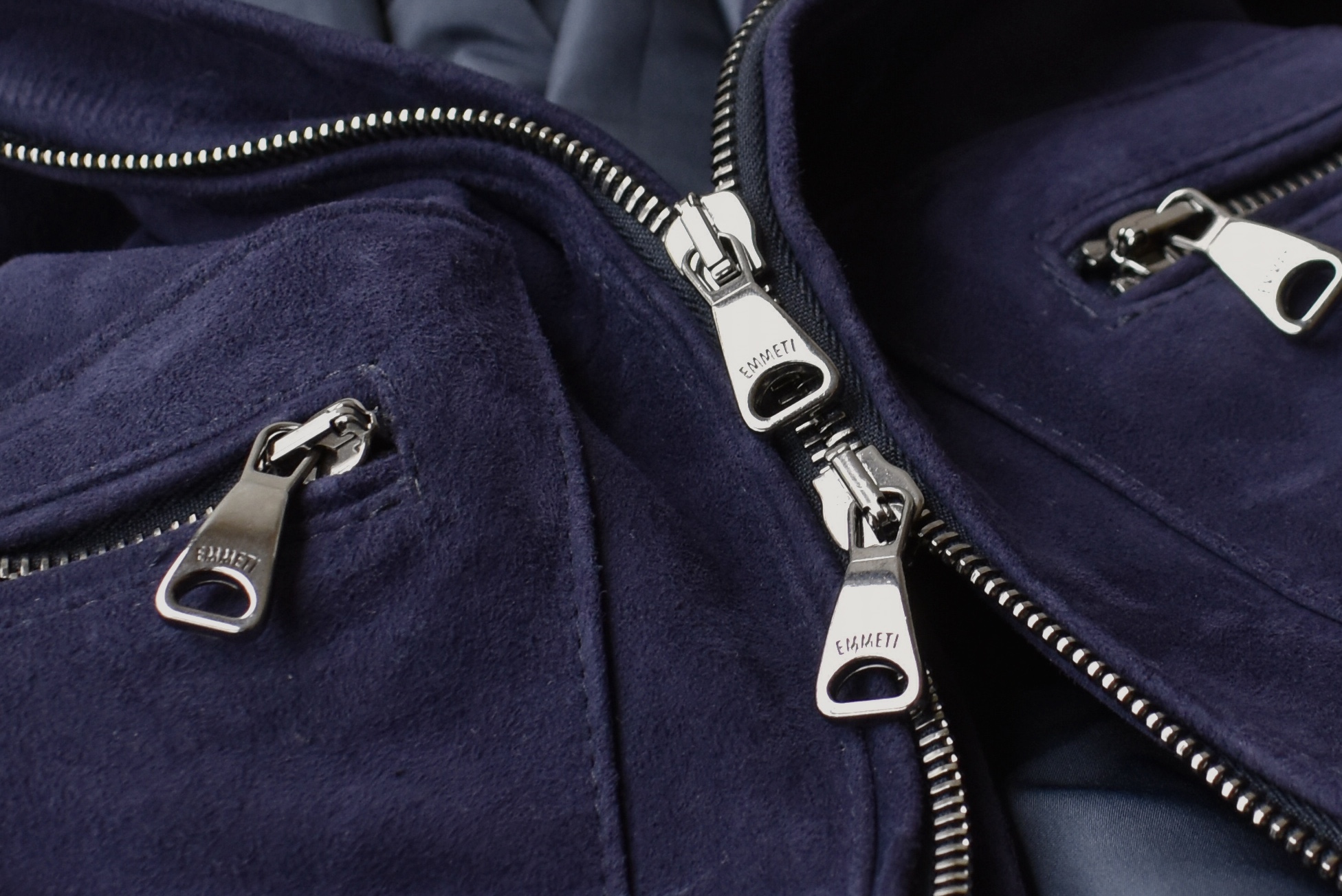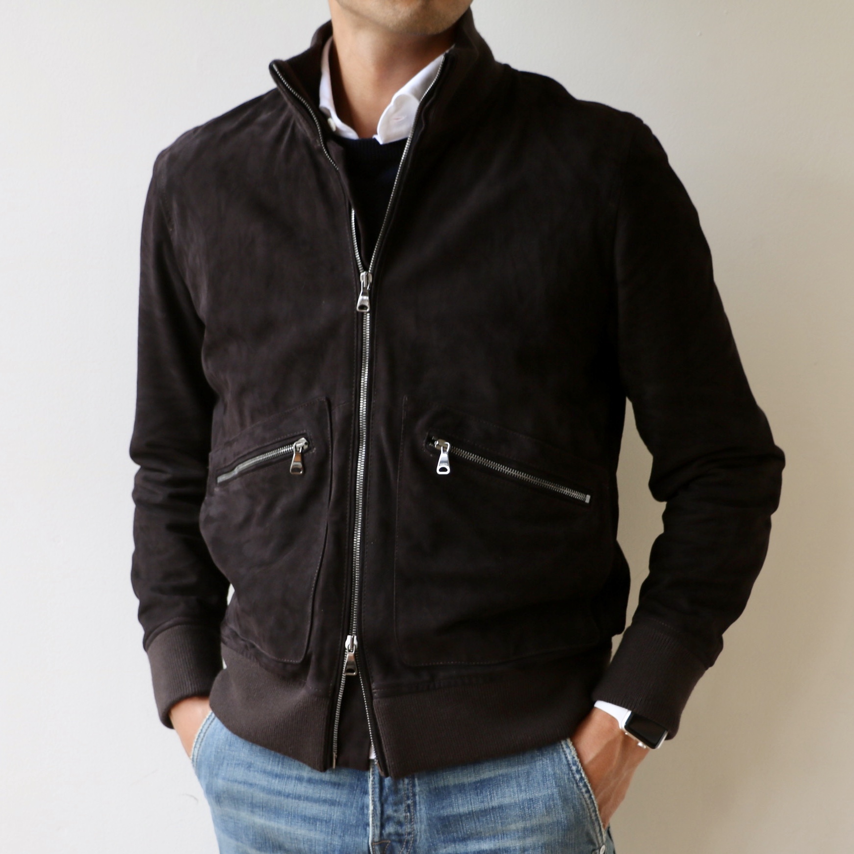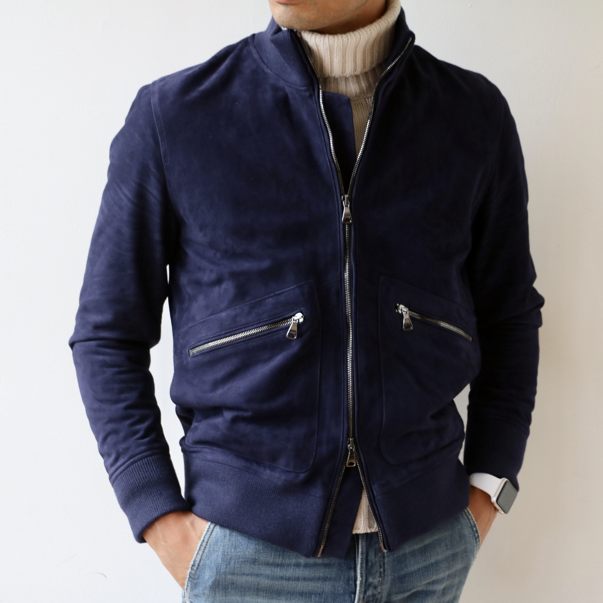 さて。やや厚みのあるゴートスキン(ヤギ革)のスエードは、ムラのある独特の色感。こちらはダークブルーになるのですが、ほんのり紫がかってもいて、魅惑のカラーに。リブの付いたブルゾンデザインで、さり気ないダンディズムを体現するはずです。シングルライダースに比べ、ややアウター的でもあります。