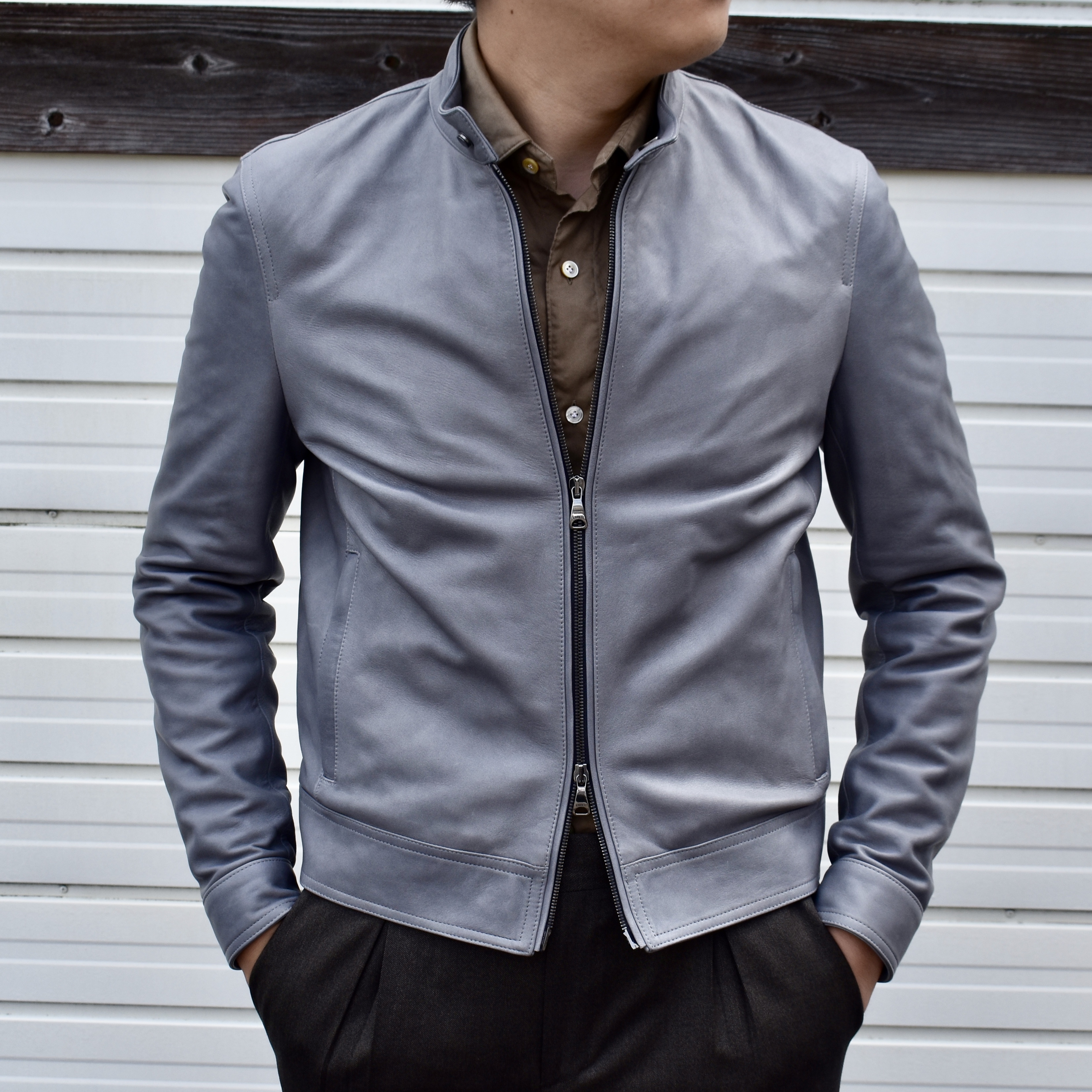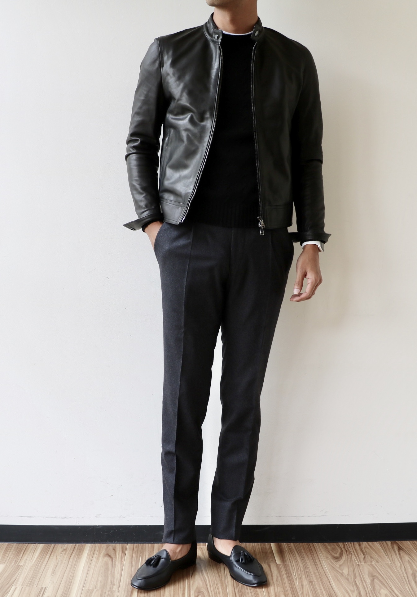 ちょっとここで脱線。レザー歴ではまだ新米ですが、所有してつくづく思うのは、レザーが本当に便利なアイテムということ。ジャケットやブルゾンのように使えて、合わせもしやすいものが殆ど。レザー特有の素材感によって、羽織るだけでサマになるような雰囲気を持ち、革靴のように長持ちもします。一緒に着用するものを工夫すれば、夏以外は着用可能で、自分のワードローブでは大活躍。1着目を手に入れた後、すぐに2着目が欲しくなったことを思い出します。理想は、何パターンか持っておくと、着こなしにかなりの幅が出ること間違いなしです。