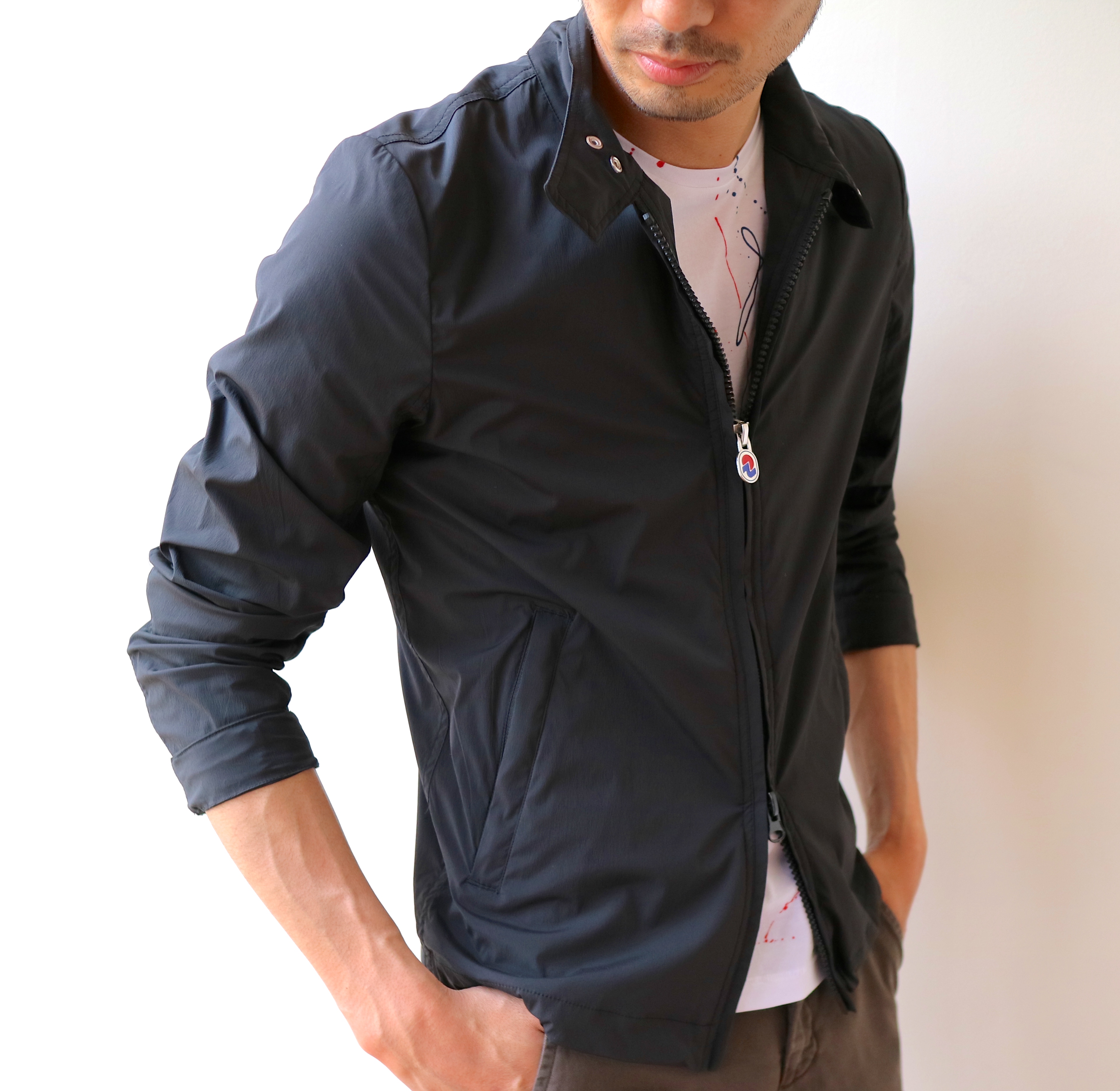 ゴルフやアウトドア、はたまた普段着にと、多目的な着用が見込めるinvictaのブルゾン。ちょっぴりモードな街着っぽく合わせてみました。ジップの締め方・開け方で、幾分か表情も変わります。