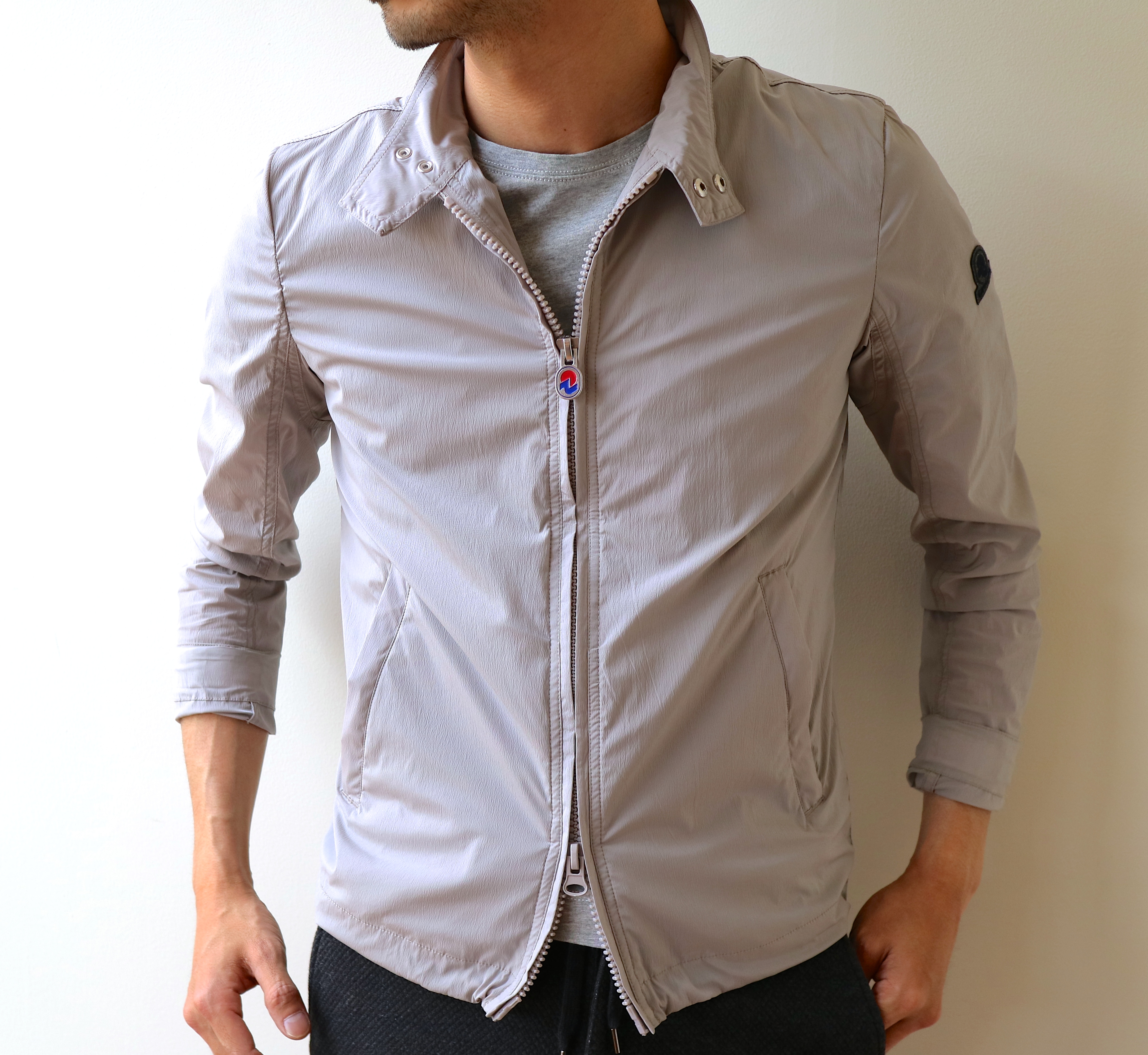 コーディネート写真の前に、少しだけ前置きを。他のブルゾンに比べて非常に薄手の生地を採用し、これからの羽織物として活躍が見込める1着。ツルッとしたナイロン地に比べ、ややざらりとした質感は、実はストレッチ素材で身体によく馴染んでくれそうです。