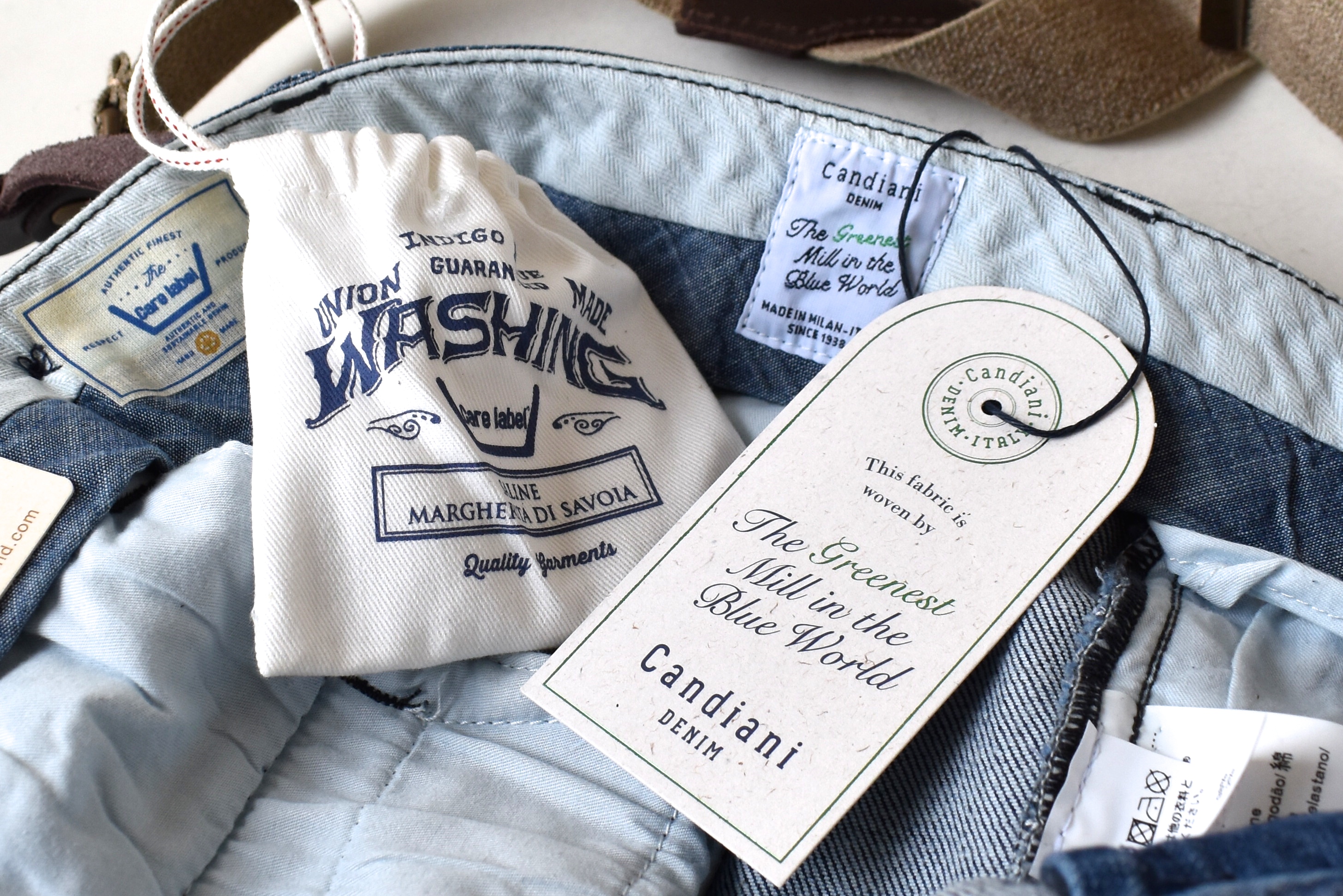イタリアの名門デニムテキスタイルメーカー・Candiani社の「GREEN CAST DENIM」を使用。これまた面白いのは、塩を使って洗いをかけており、これはPITTI会場でもケア レーベルのブースで実演されたそうです。その塩を付属品で付けてくるあたりは、不思議チャンのイタリア人らしいですが、色々と拘りと蘊蓄の詰まったデニムであることは確かです。
