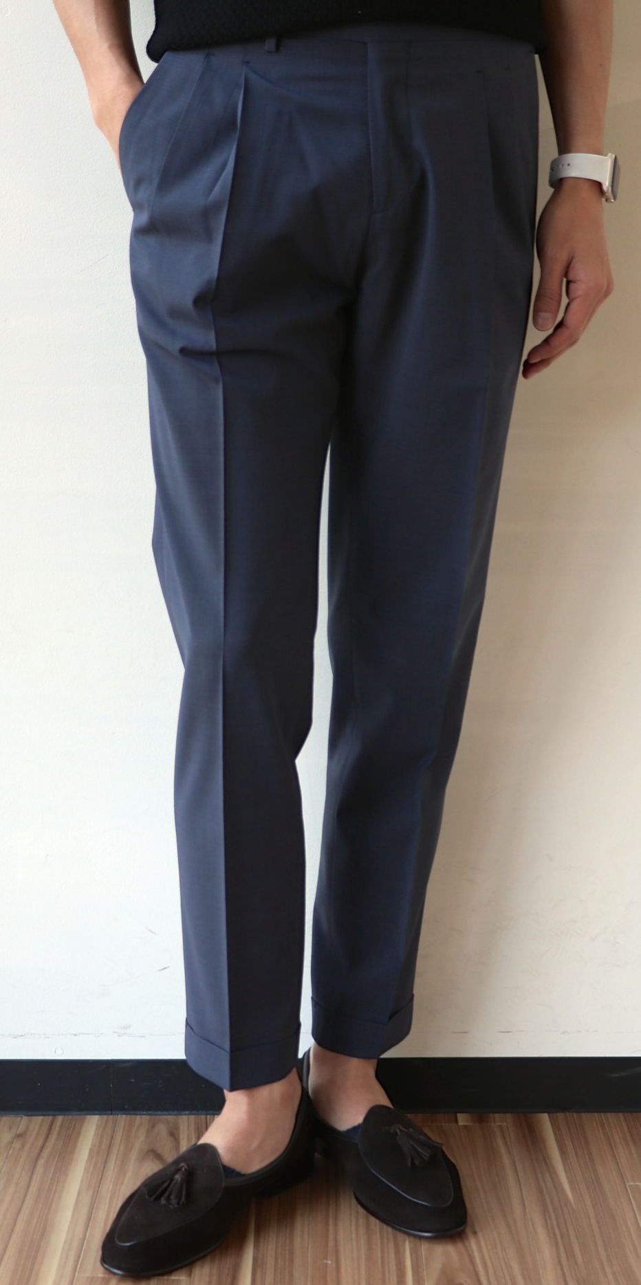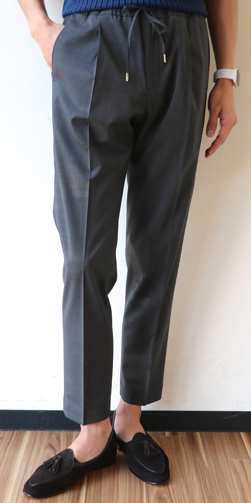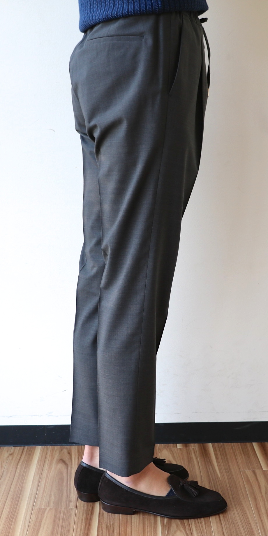 サラサラで、実は最も涼しいかもしれないサマーウール。薄からず濃からずのミディアムグレイと素材の質感が良くマッチしています。ウエストにゴムの入ったシャーリングパンツで、股上は深め。同じく深めのワンプリーツが、全体の表情を引き締めます。