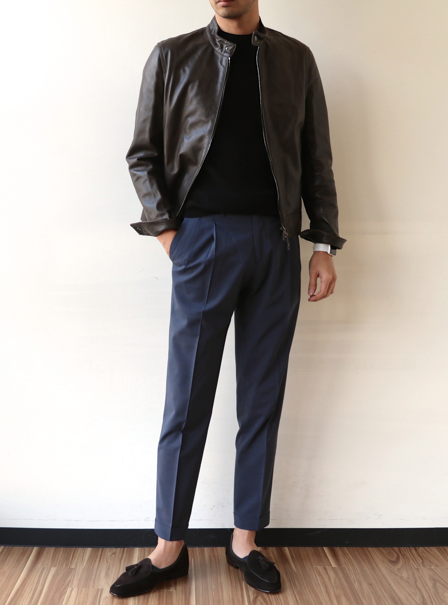 レザー:EMMETI "PETER" ニット:Drumohr(後日ご紹介予定) 靴:BAUDOIN&LANGE