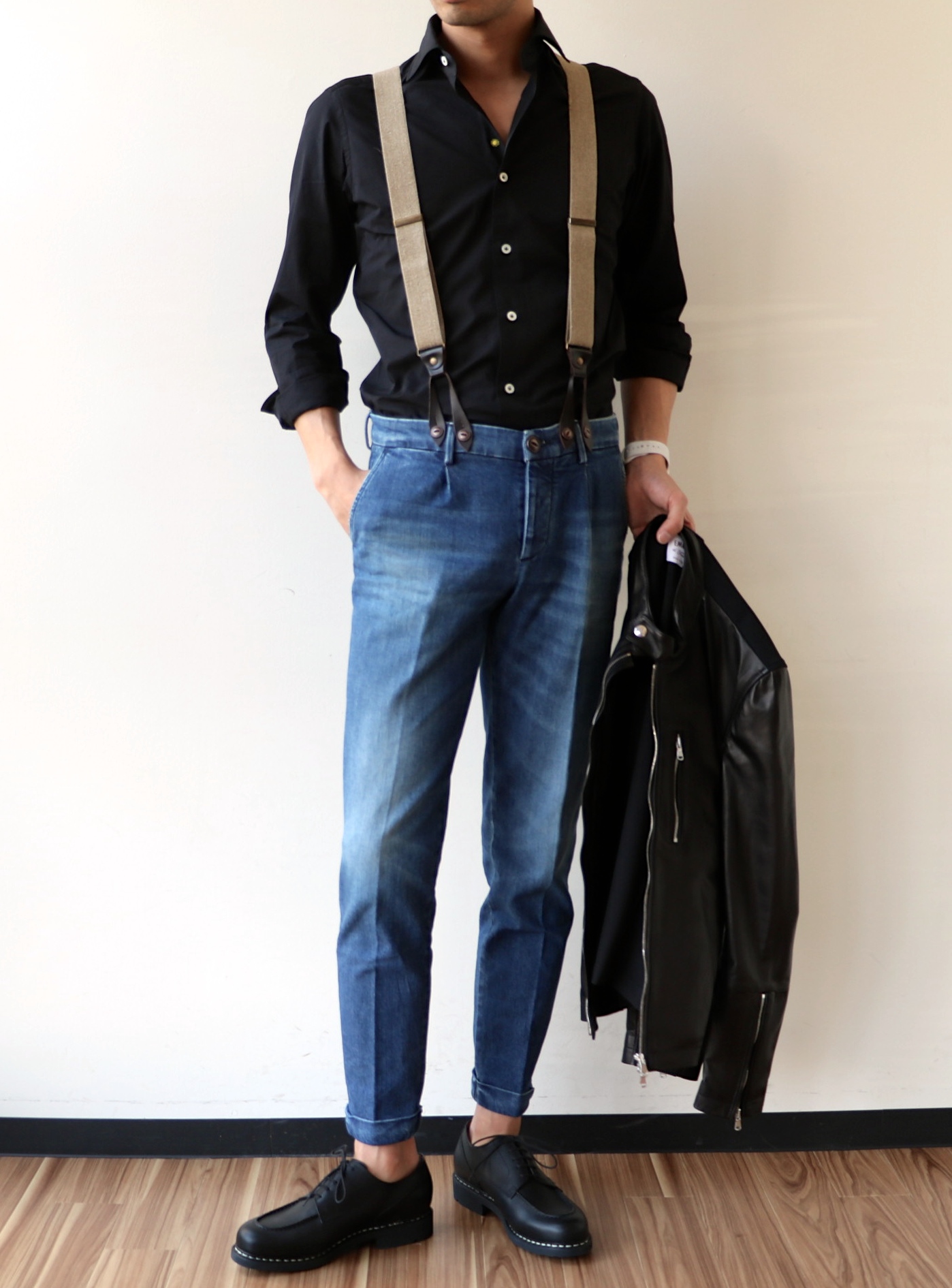 サスペンダーは勿論取外し可能。綺麗なウォッシュドブルーのデニムスラックスです。モデルは身長183cm・体重67kgで、46サイズを着用しています。