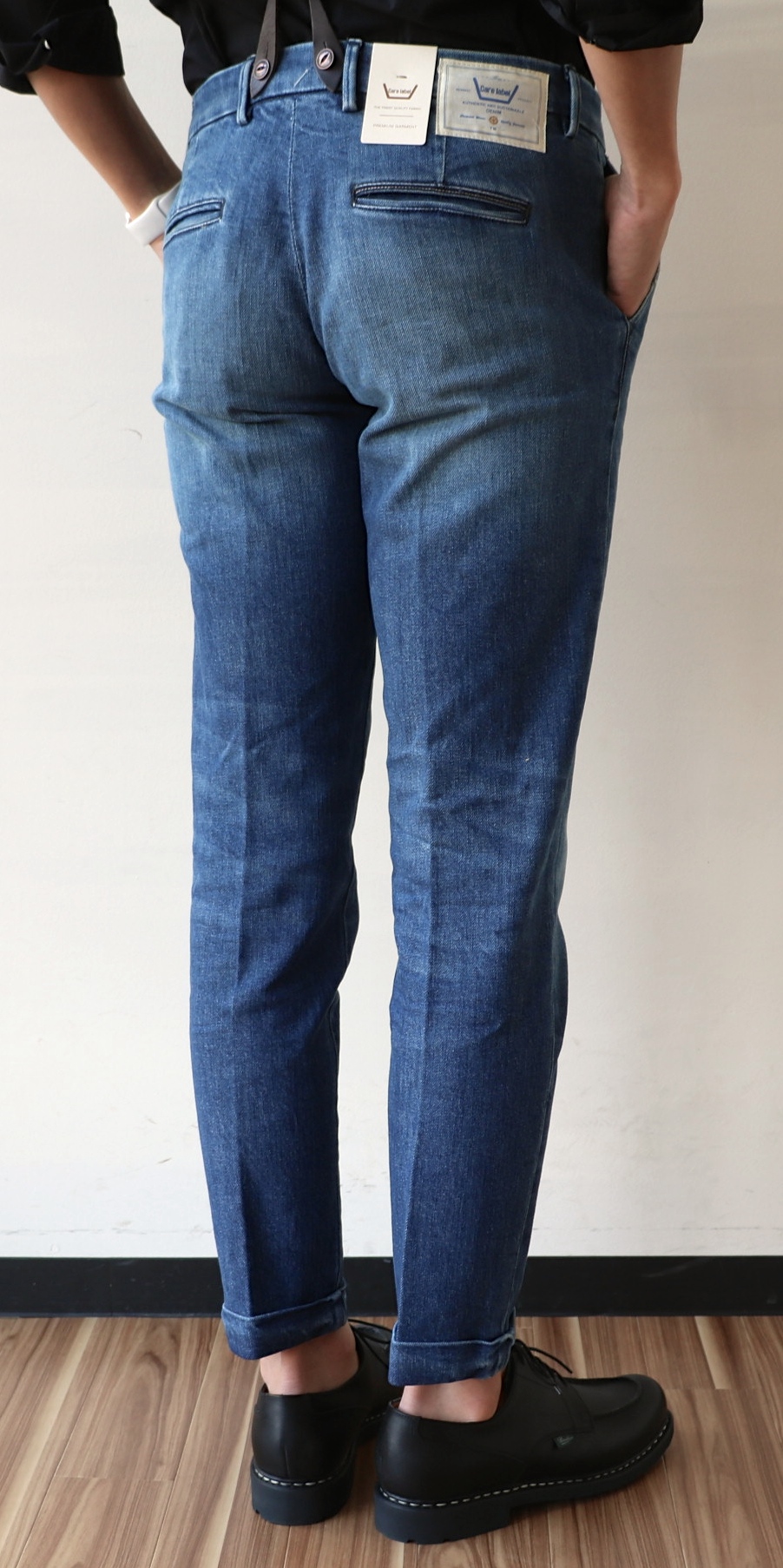 ヒップ周りは、両玉縁のポケットで上品に。イタリアの名門デニム生地メーカー・Candiani/キャンディアーニ社製のデニム生地は、コットン・リヨセル。リヨセルとは再生繊維の一種で、テンセルと同義です。そう言えば、昨日のBRIGLIA 1949の綿パンツにもテンセルの混紡がありました。エコロジカルな繊維であることと、ソフトな風合いに・ハリコシがあって弾力性に富んだ繊維。このデニムも12オンスで肉厚ながら、大変柔らかいのが特徴です。欧州では、持続可能性・サステイナビリティに関心が高いようですね。