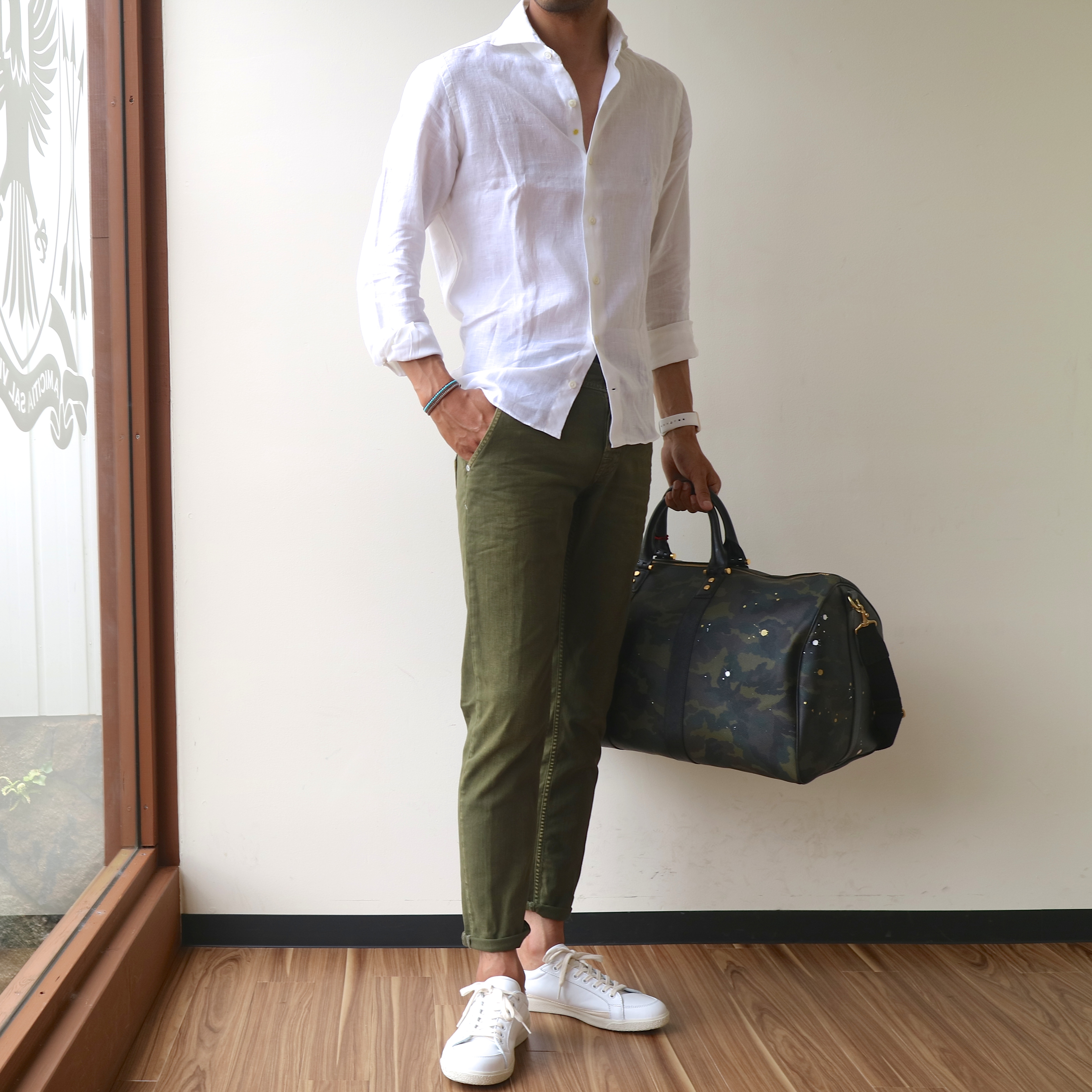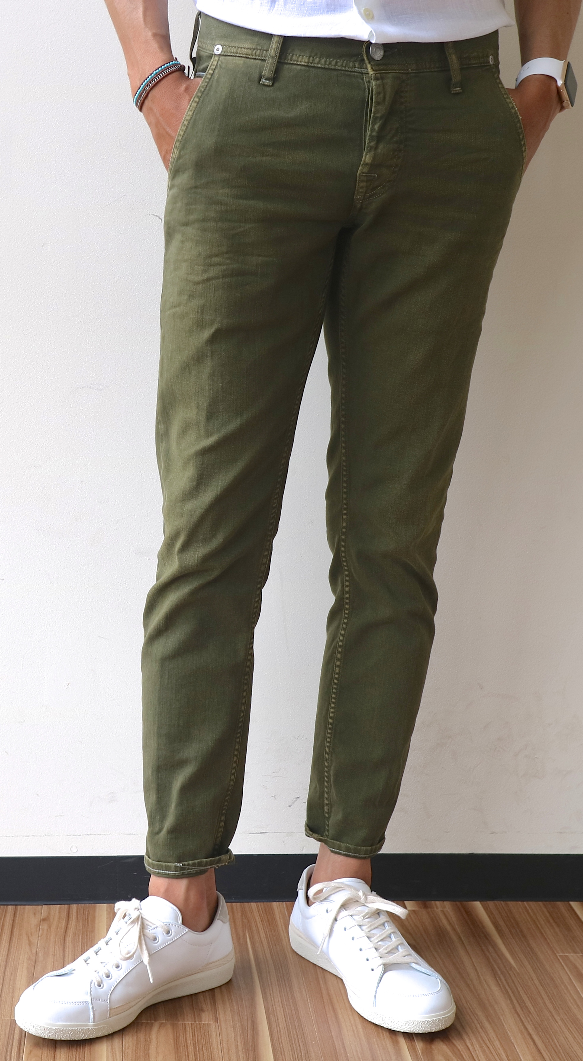 最後に全身をご覧ください。色落ち感のあるオリーブは、白シャツなどのシンプルなアイテムをよく引き立てます。夏のスタイルに、こなれ感と新鮮さもプラスしてくれるはずです。