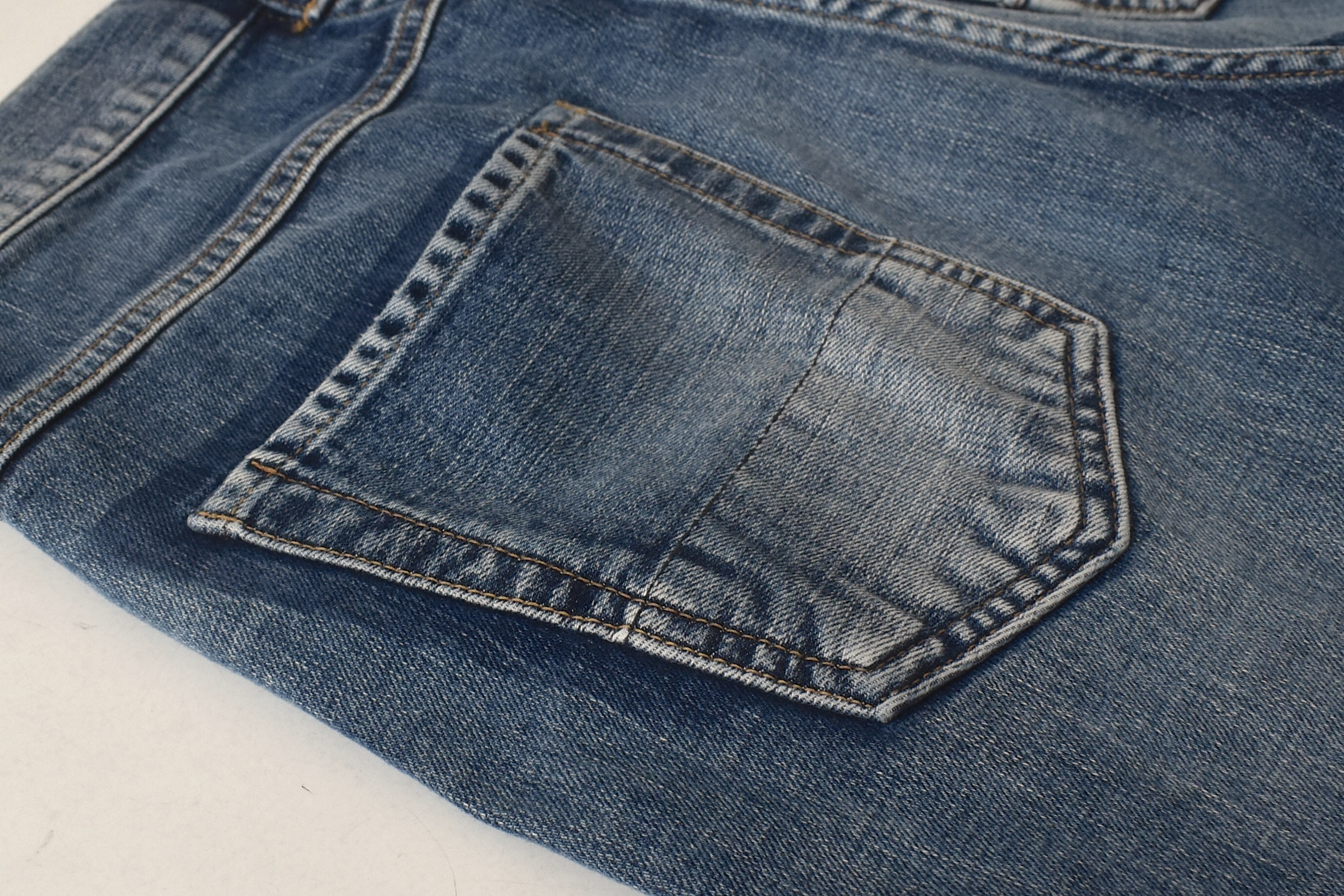 この手の細工は、後ろの左ポケットにも。ポケットを後で移動させたかのような色落ち加工が施されています。