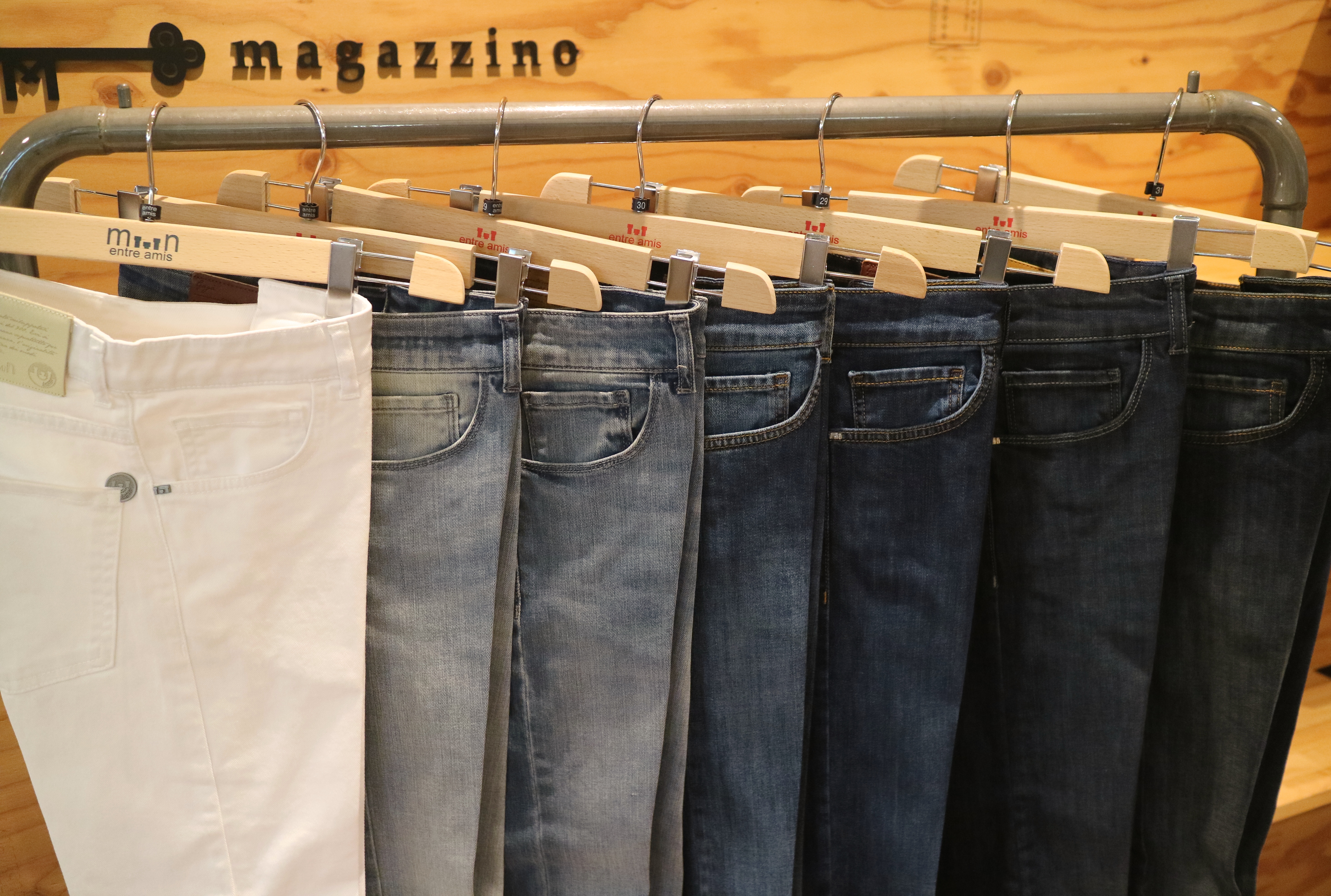 パンツと並び、注目を集める【entre amis /アントレ アミ】のデニムシリーズ。微妙な色落ち具合を比較しながら、お気に入りの1本をお選びいただけるはずです。