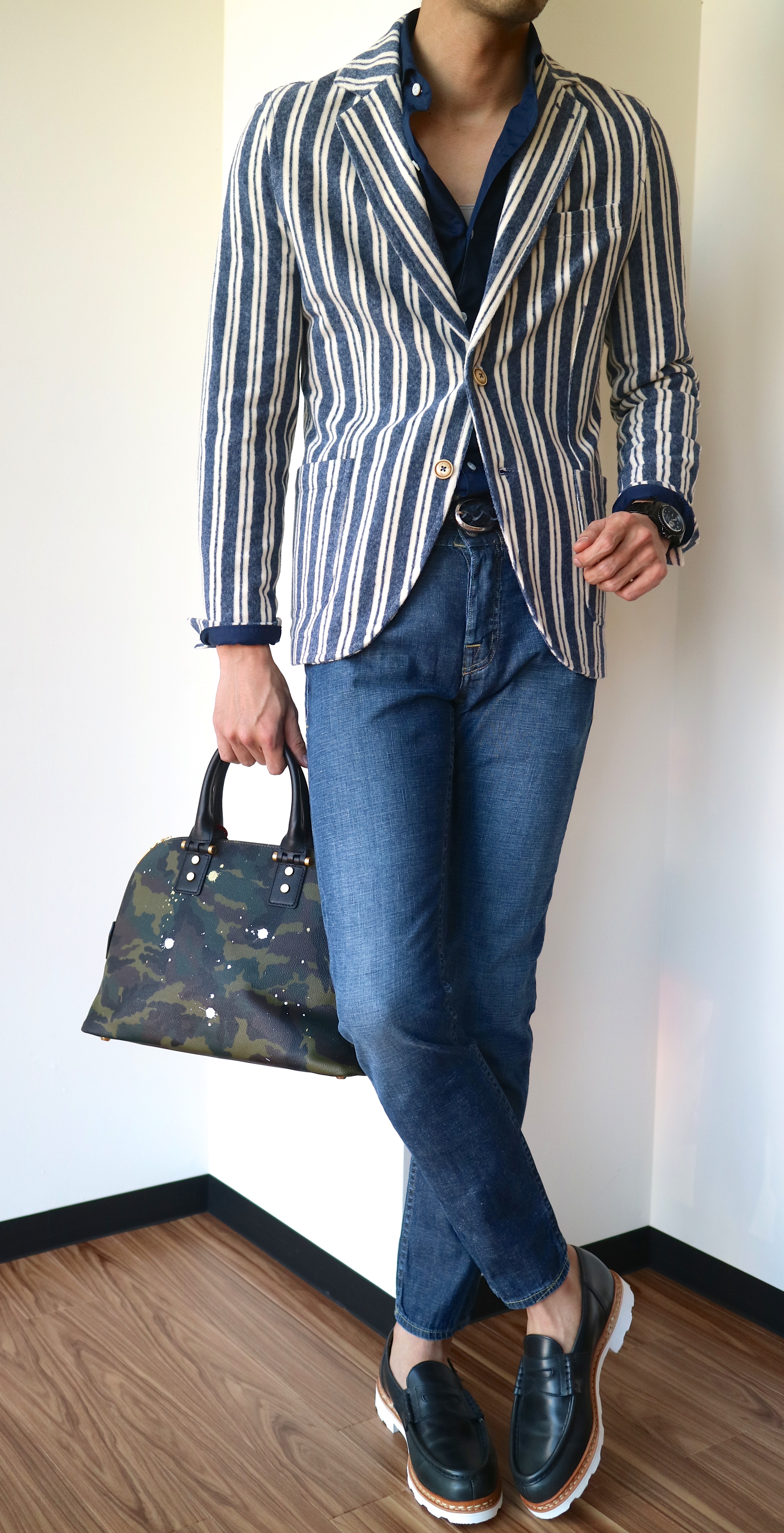インにはFinamoreのブロード無地シャツ(グローリーガイ)を合わせ、ベルトはTIBERIO FERRETTI(グローリーガイ)、靴はParaboot(グローリーガイ)、バッグはGENTIL BANDITのハンドバッグ(再入荷)を持っています。