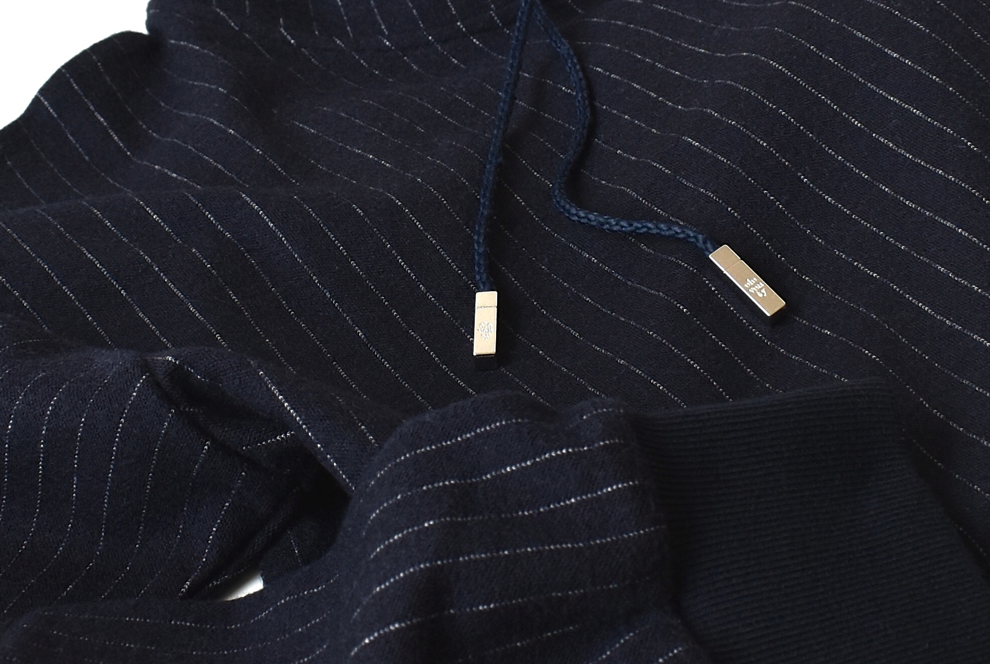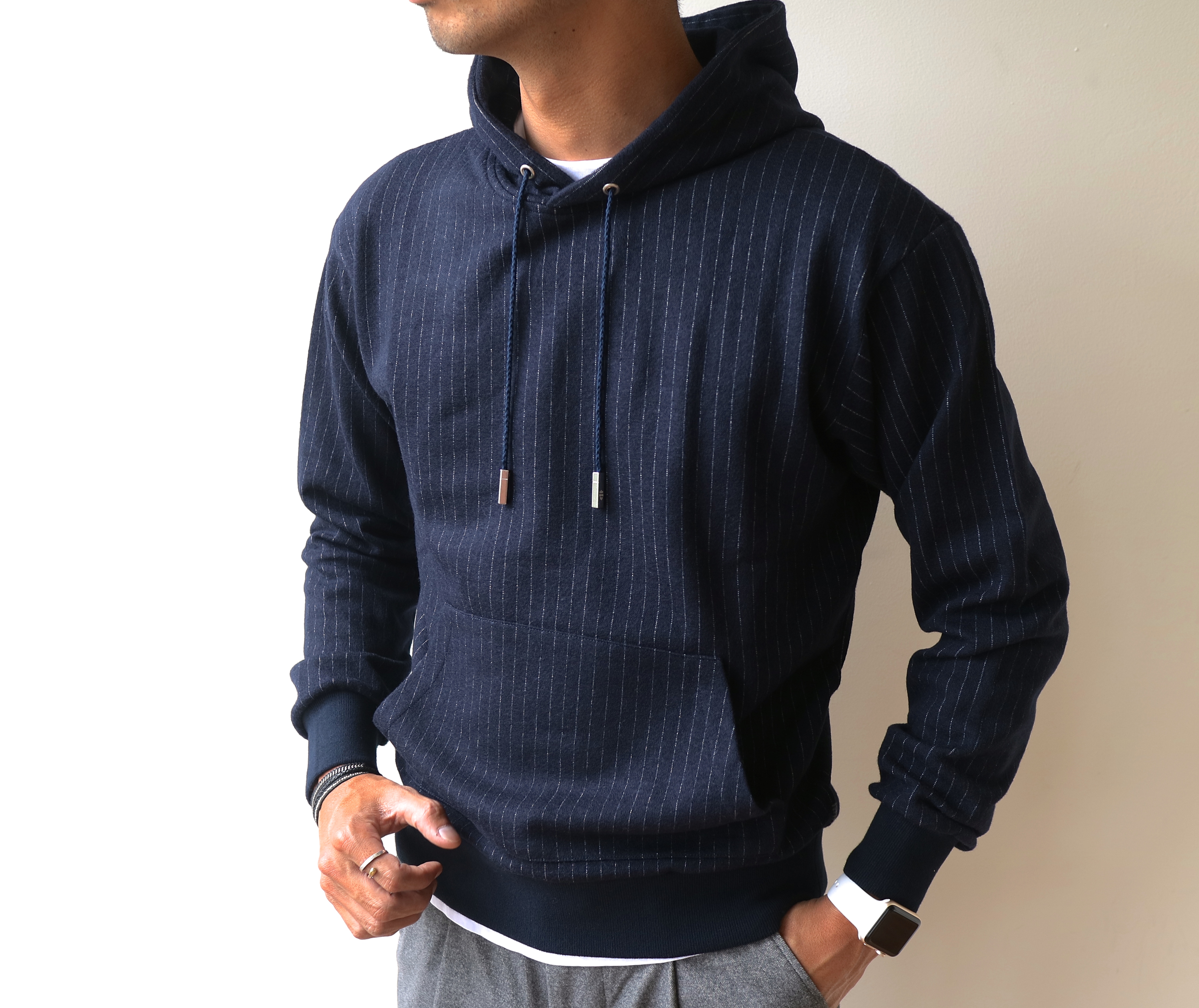 スーツ生地のようなピンストライプ柄が目を引くパーカー。ウールを中心とした素材使いながら、厚みや毛羽立ちも程々で、気に入ってしまったのです。これがあれば、休日着もさり気なく格好を付けられます。