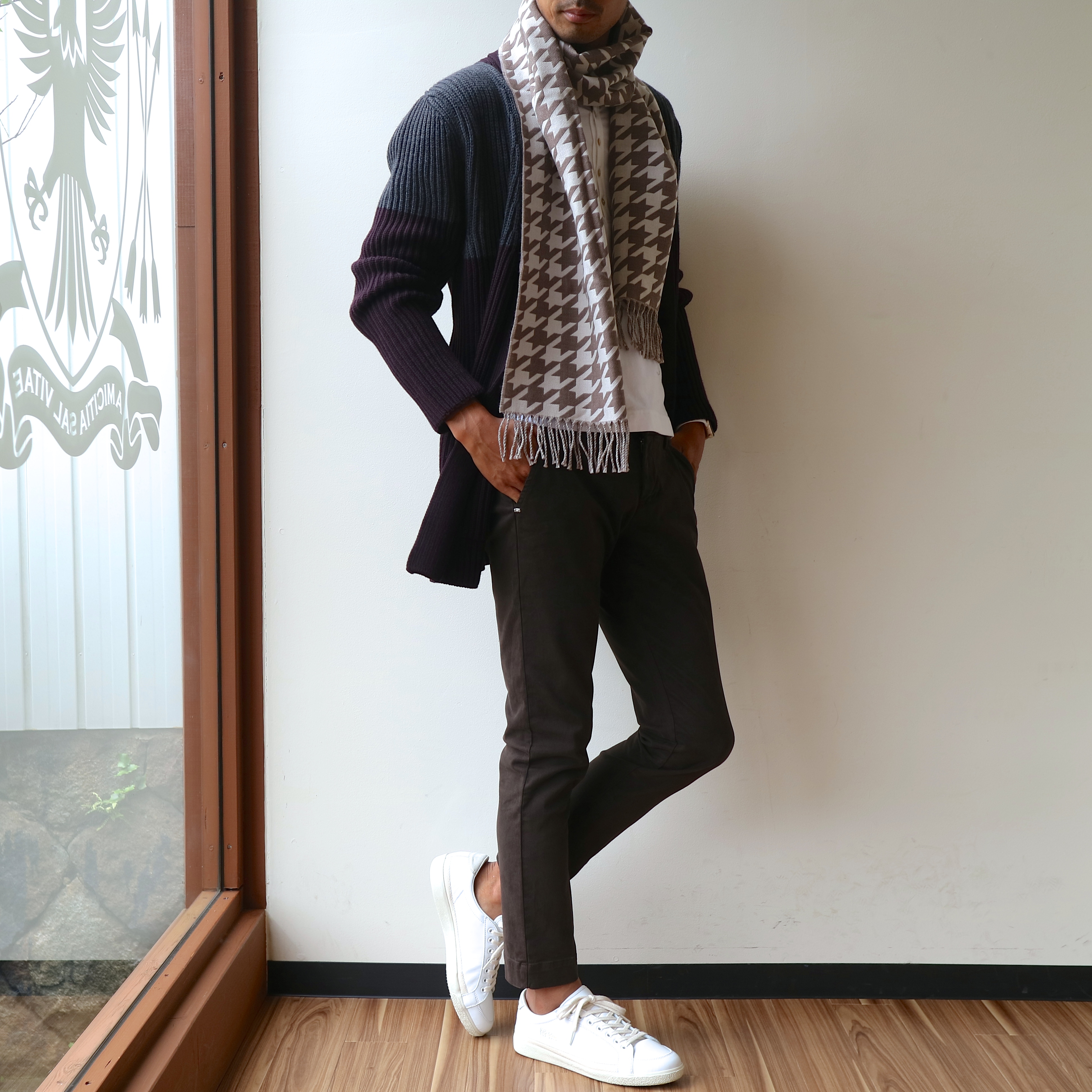 続いては、アルパカウールのヘリンボーン柄のマフラー。しっとり柔らかい肌触りに、漂うのは上質感。クラシックかつキレイめなアイテムとの相性の良さは確かなものがあるはずです。また、ホワイトのフリンジが品の良いアクセントとなっています。
