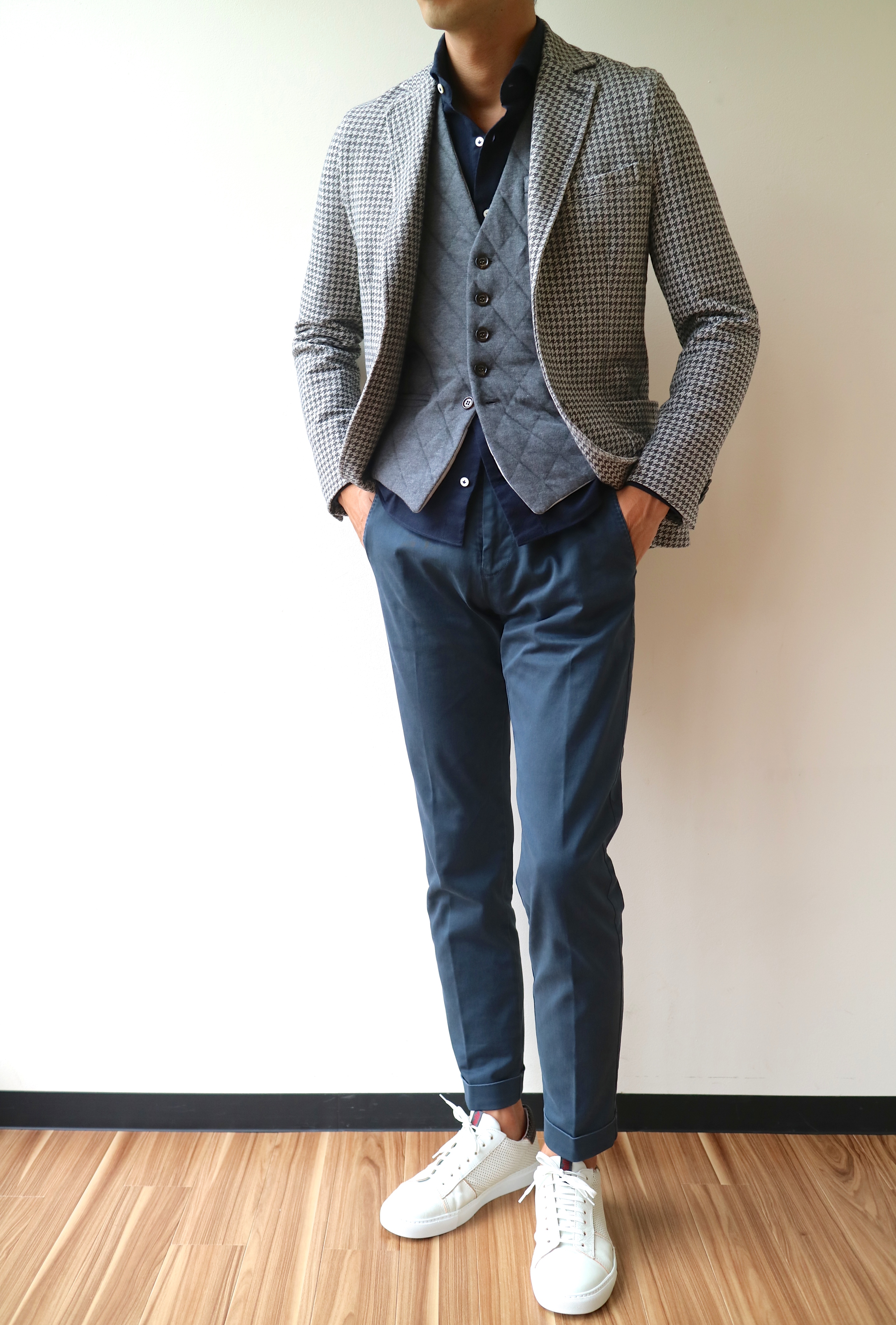 いつものスタイルにも、良い塩梅で変化が付けられます。ジャケットにCIRCOLO 1901のハウンドトゥース柄JKT、インにはGiannettoのネル地ソリッドシャツ(ネイビー)を、パンツはBERWICH、靴はWally Walkerのスニーカーを合わせています。
