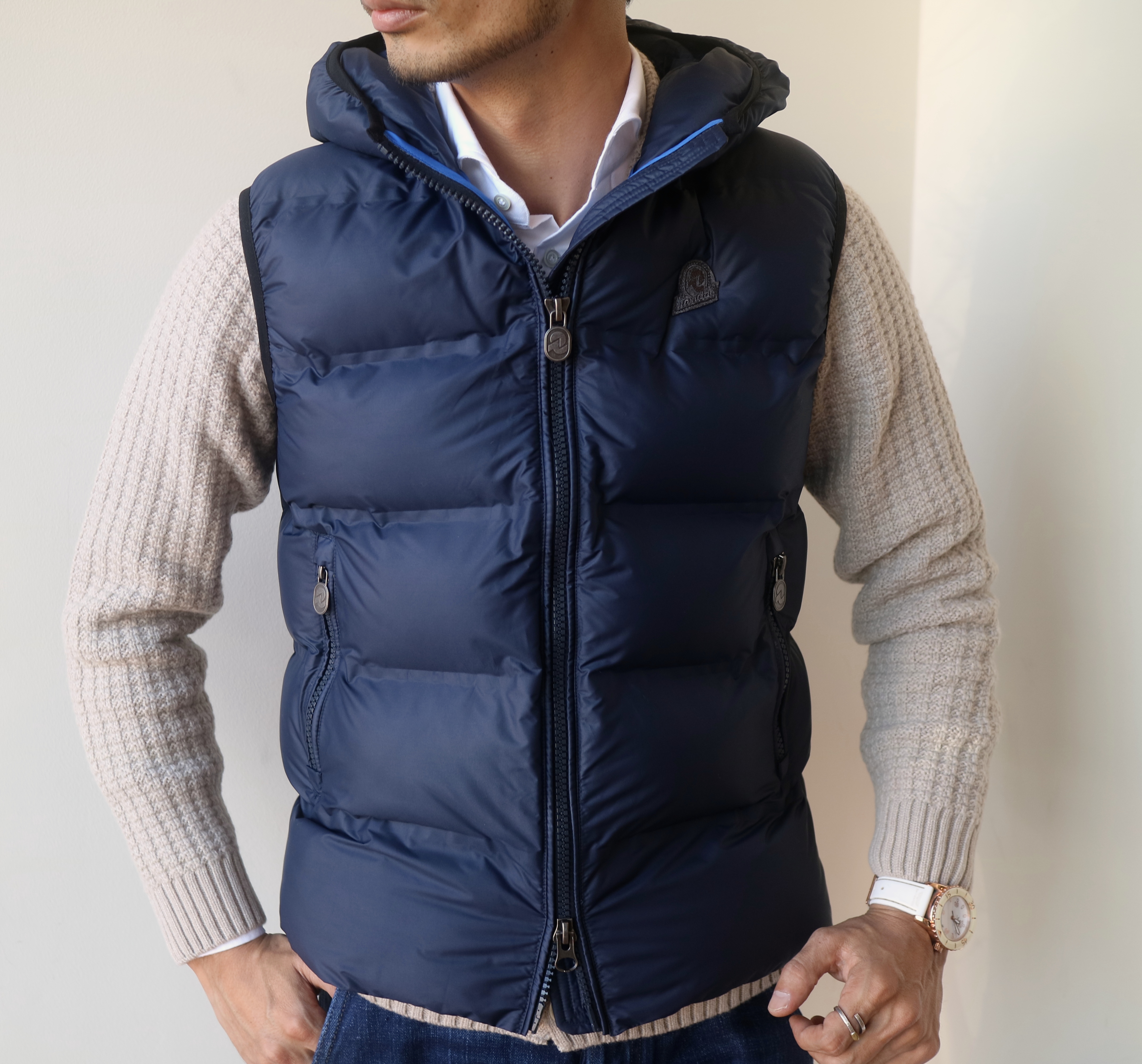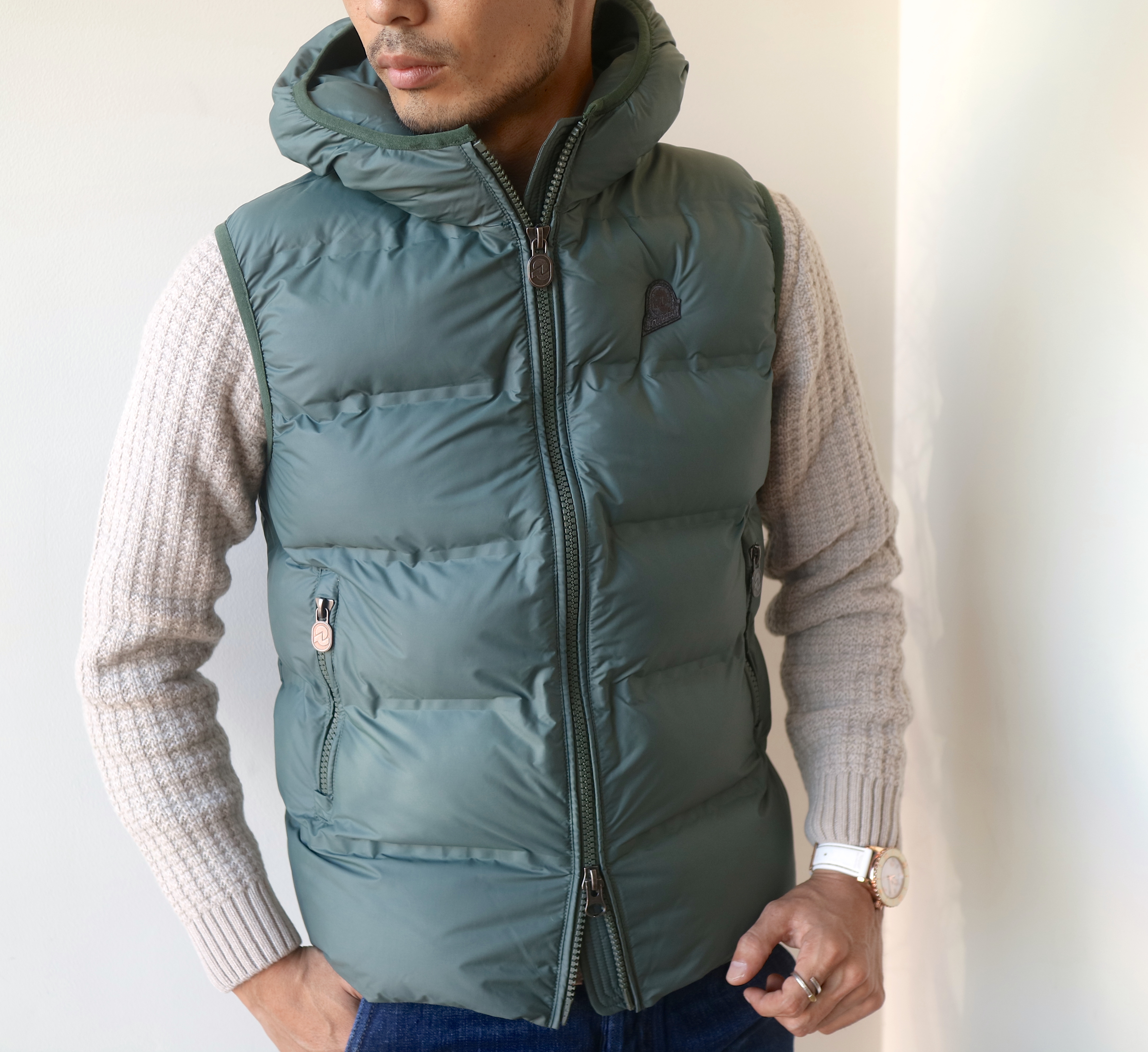 程よくボリュームがあって、着丈の長さを確保したフォルム。だからこそ、ジャケットやブルゾンなどの中肉の衣料と重ねることができます。レザージャケットの上にも良さそうですね。着丈のスッキリしたダウンベストは、グローリーガイのMooRERで取り扱いがあるので、宜しければ見比べてみてください。