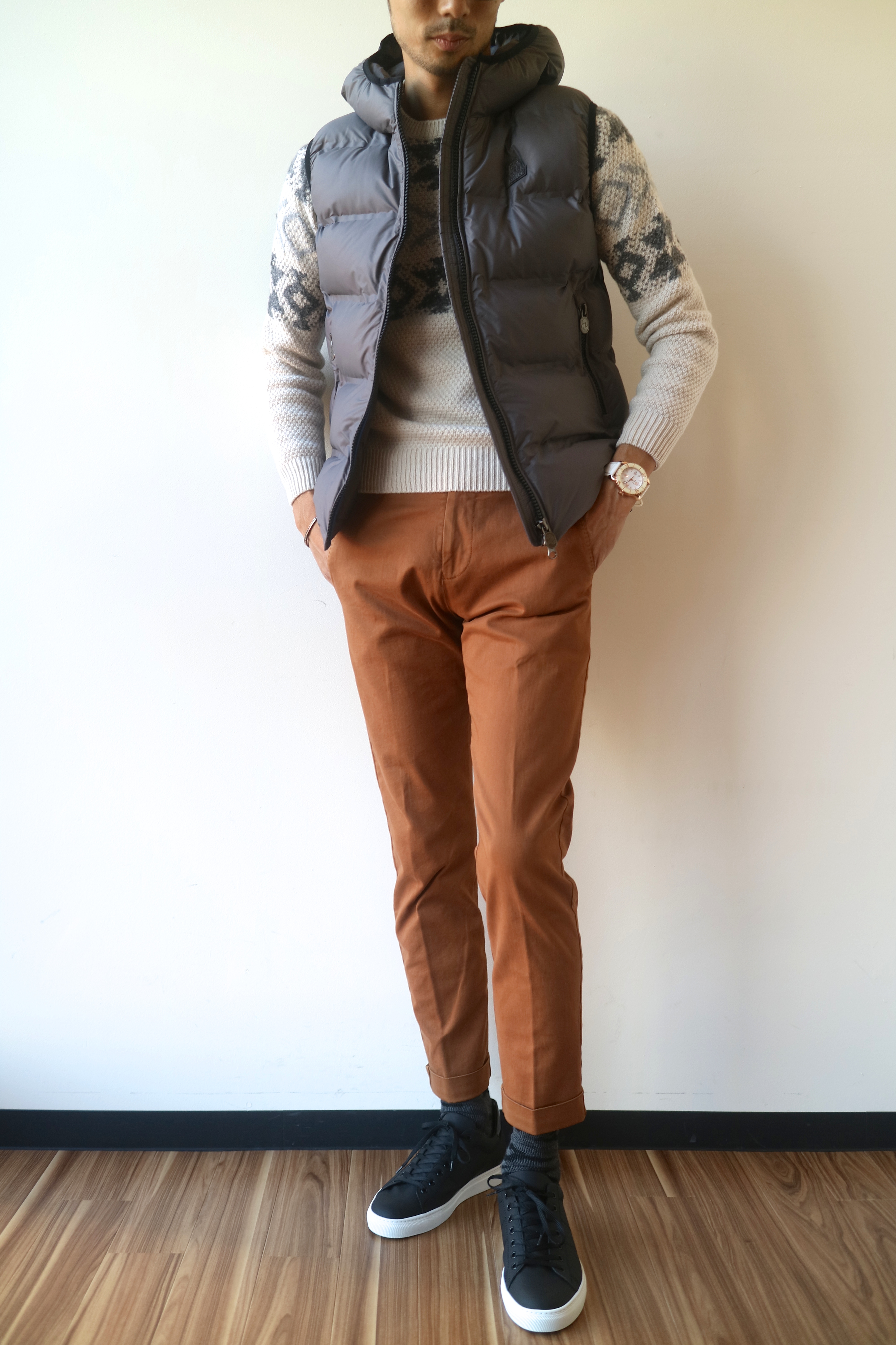 もう少しボリュームダウンするなら、こんなナイロンベスト(eleventy)如何でしょう。真冬感のない、ライトでコンパクトなベスト。きっと重宝しそうです。いざ真冬になれば、インナー使いも出来ますし...。インには同じくeleventyのプルオーバーニット。実は30%のカシミア混で、例えばシャツの上に着たりすることで、かなり長い期間使えるスグレモノなんです。パンツには注目のパンツファクトリー・BERWICHのコットンパンツ、注目カラーのテラコッタを。靴は同じくParabootです。