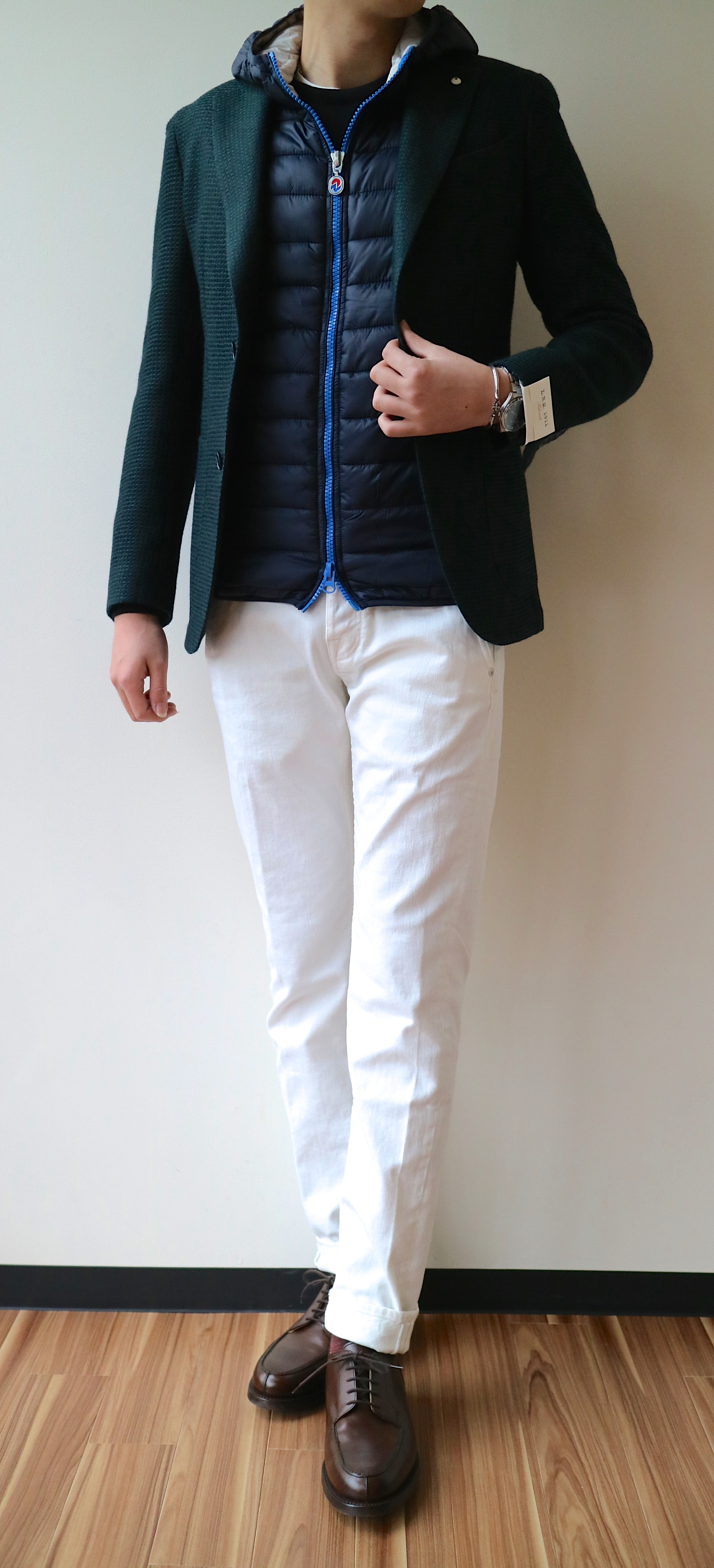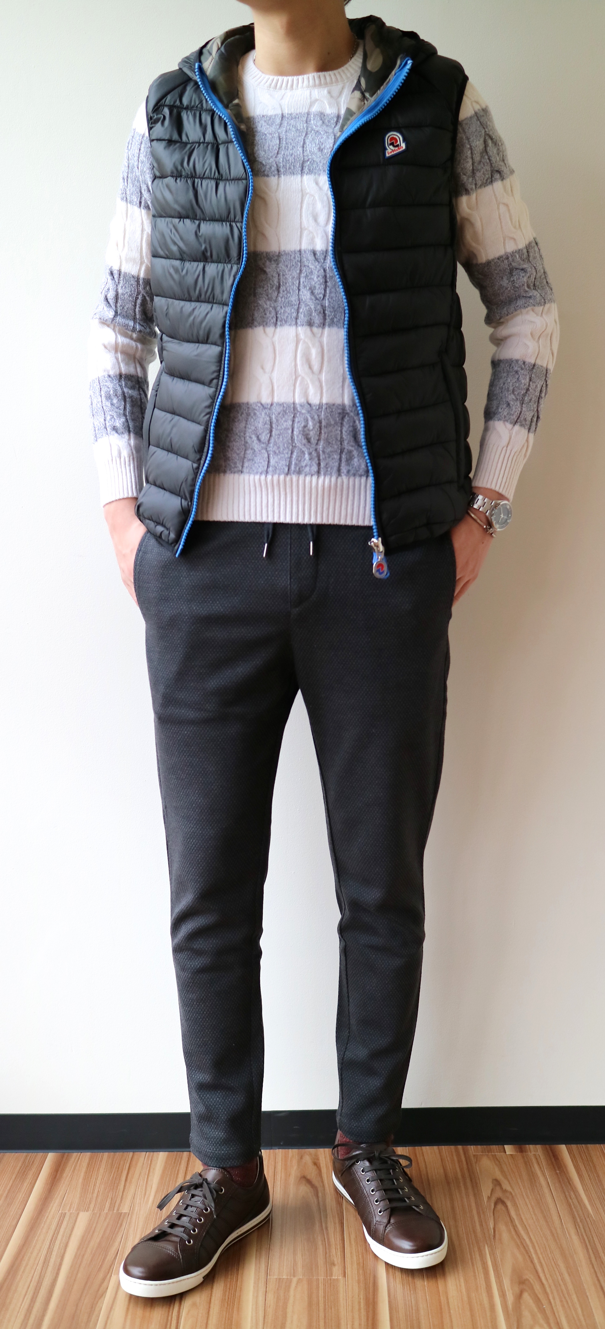 顔出し、1年に1回くらいは新鮮で良いですね。さて。よりスポーティに見せたいときに役立つのは、ダウンベスト。イレブンティで良い物を見つけております。抜け感のあるCIRCOLO 1901のジャケットなんかと一緒に重ねてみてはどうでしょうか。その他はmorganoのタートルネック、entre amisのブラックデニム、Wally Walkerのスニーカーを合わせています。キャップは最後にご紹介します。