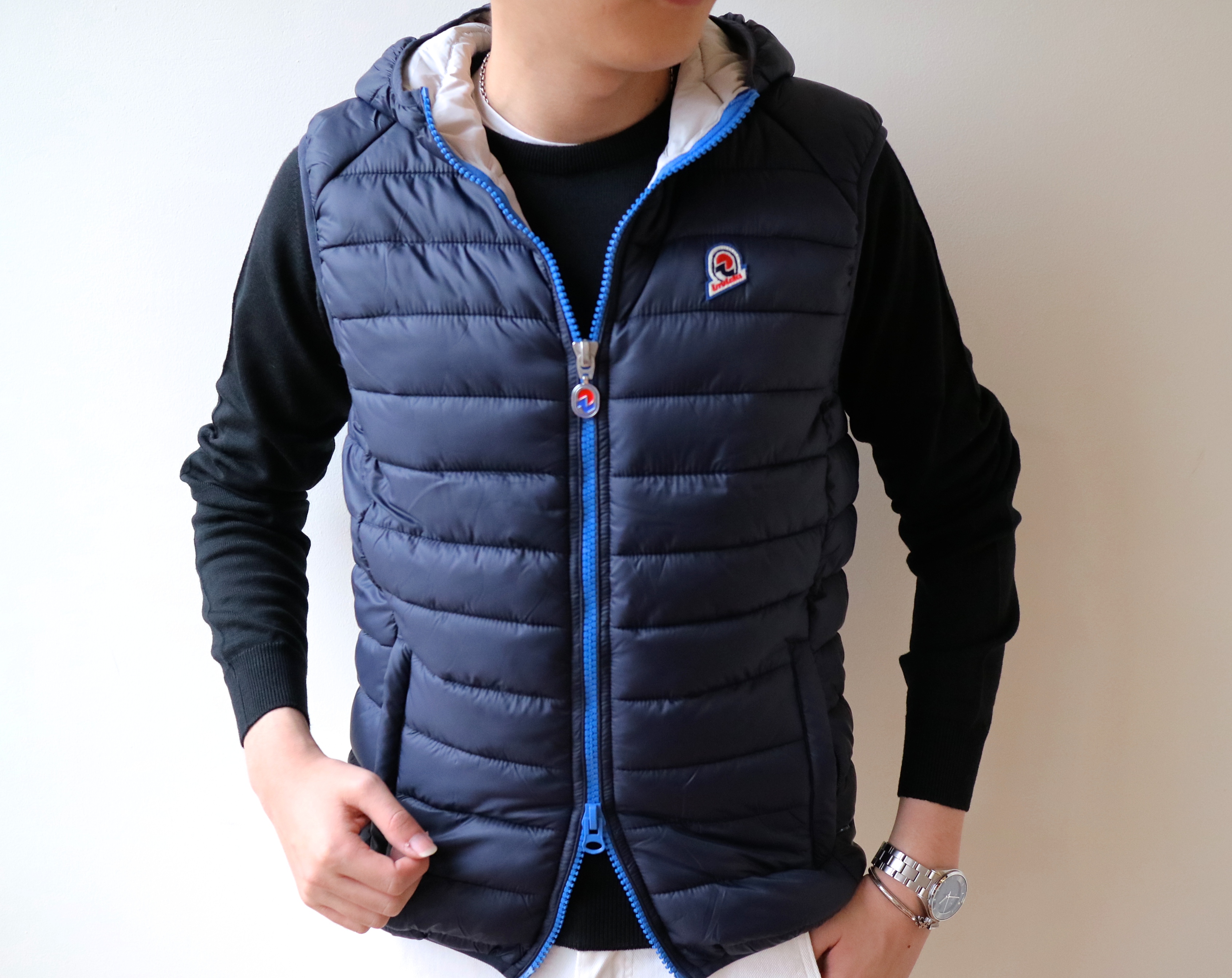 説明ばかりしていてもいけません。まずは目で見てみましょう。ご案内のトップバッターは、ダブルジップで・中綿入りのフーデットベスト。昨年辺りから感じるのは、シンプルなアウターへの関心の高まり。ハイスペックなアウターとは別なカテゴリーで考えれば、面白い存在になりそうです。