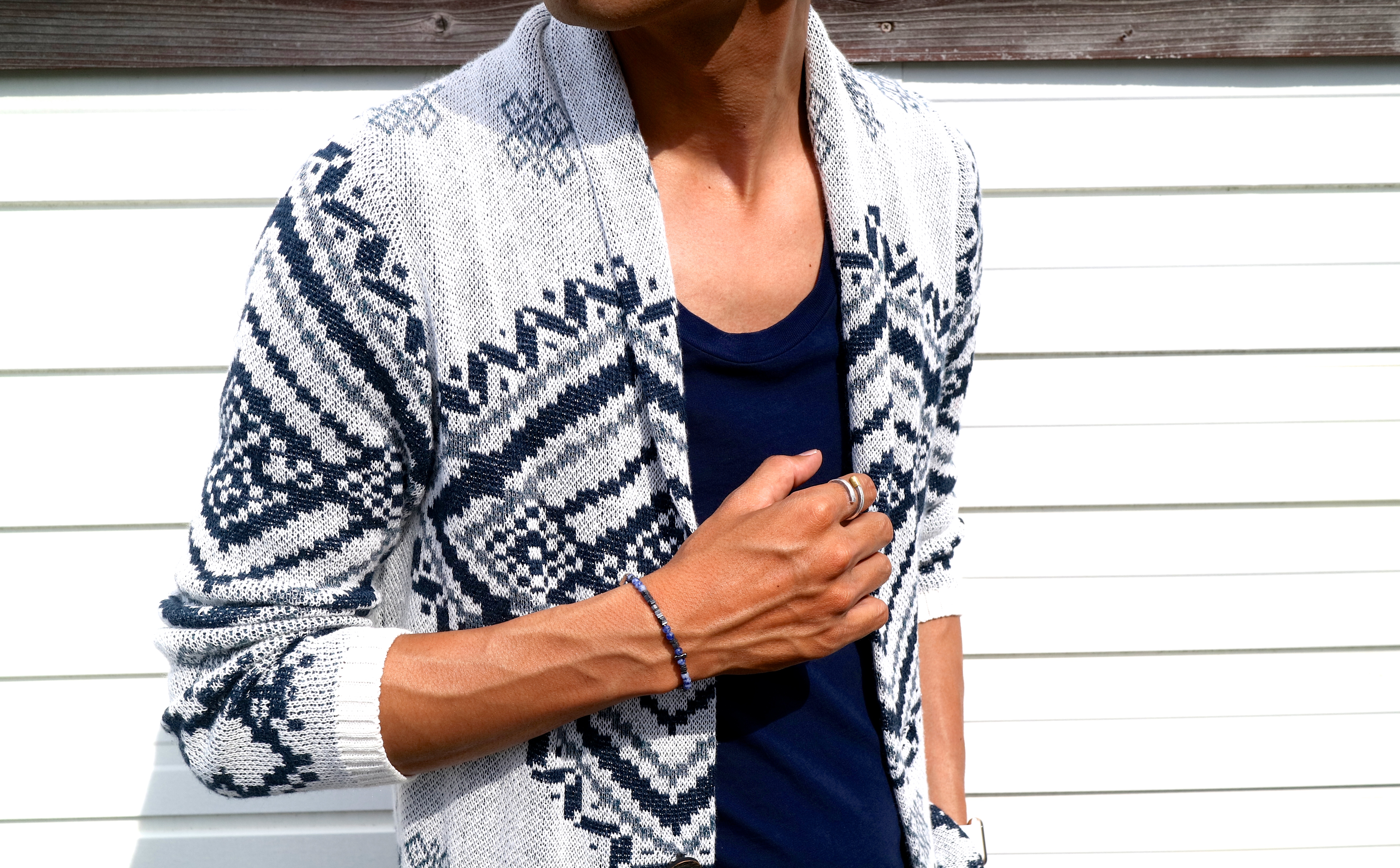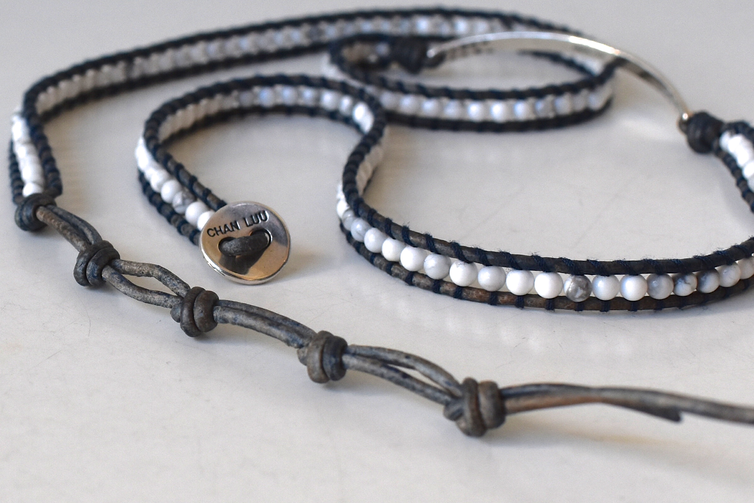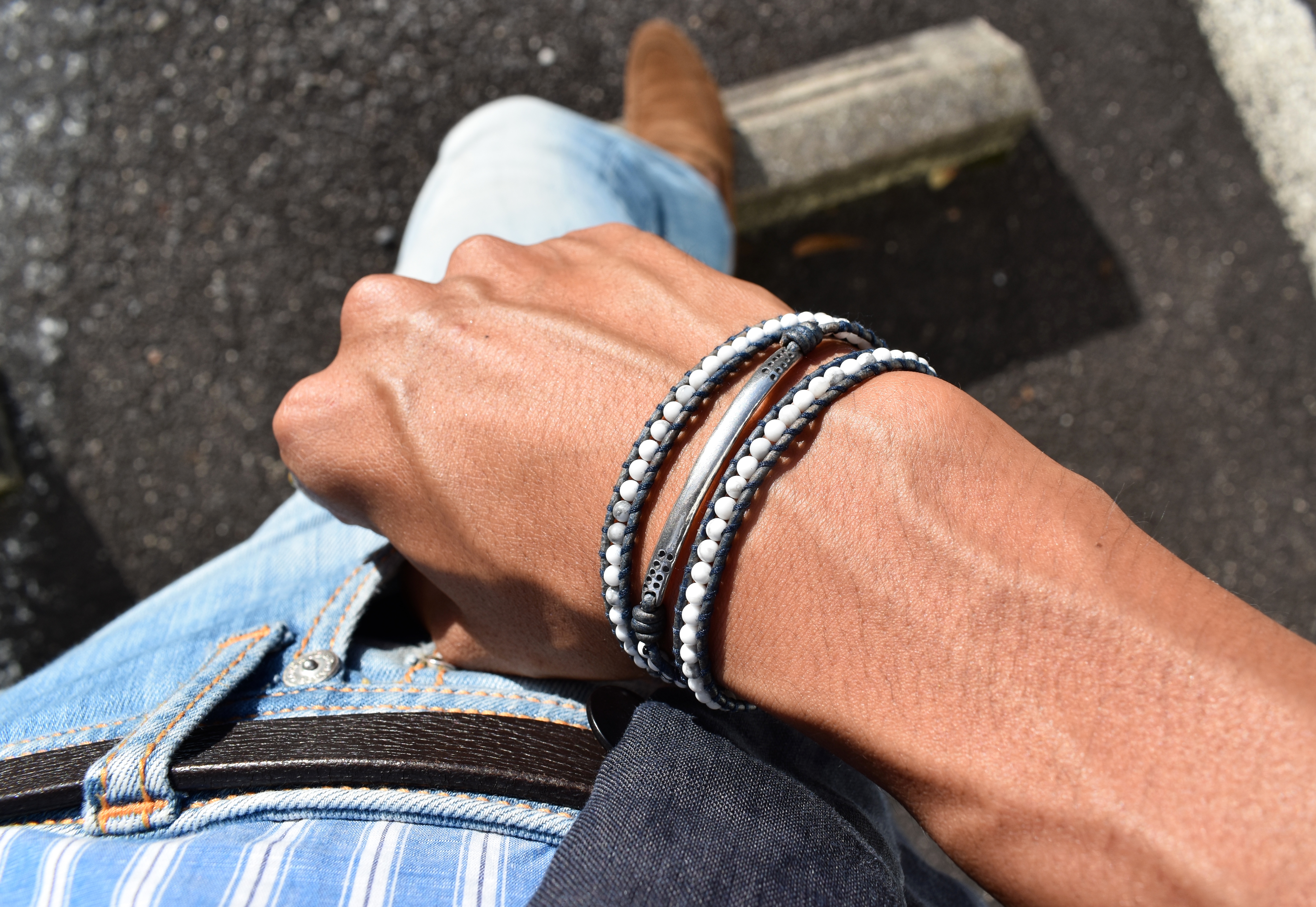 個別に見ていきましょう。ホワイトとダークブルーの組み合わせに惹かれる、3連ブレスレット。オトコの定番であるネイビージャケットや白シャツ・白Tシャツとも、すんなり馴染みそうな顔つき。ワンポイントでプレートも付いています。実は、前回ご紹介のターコイズ3連タイプの色違いとなります。