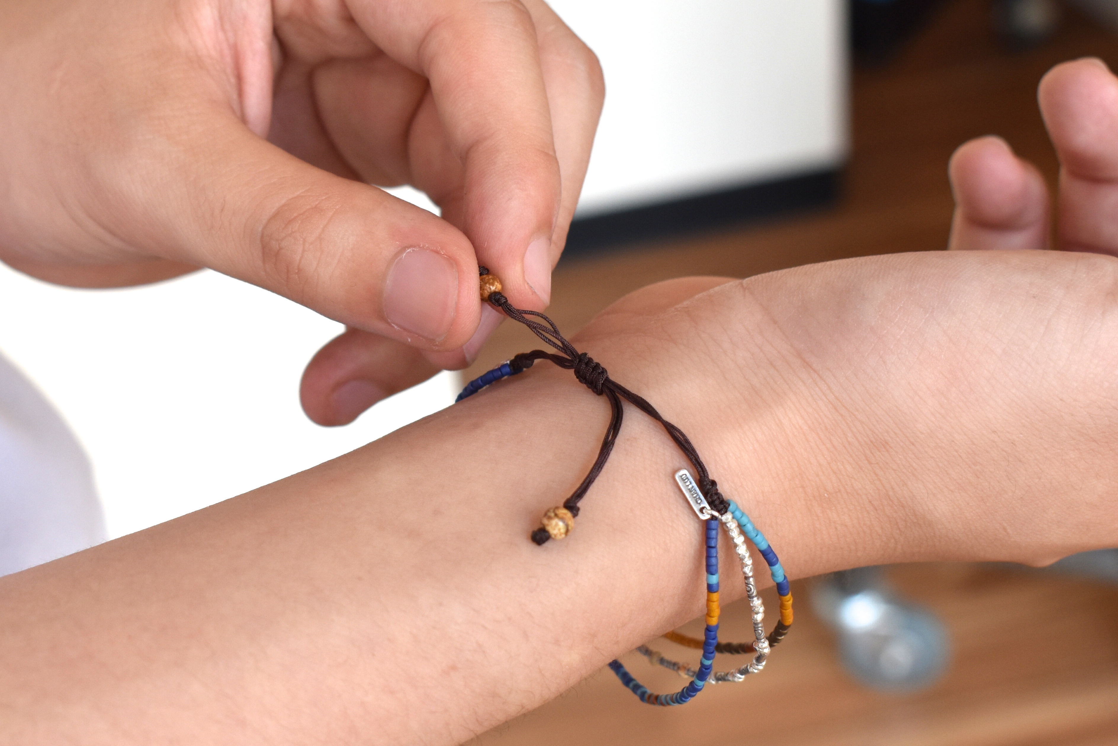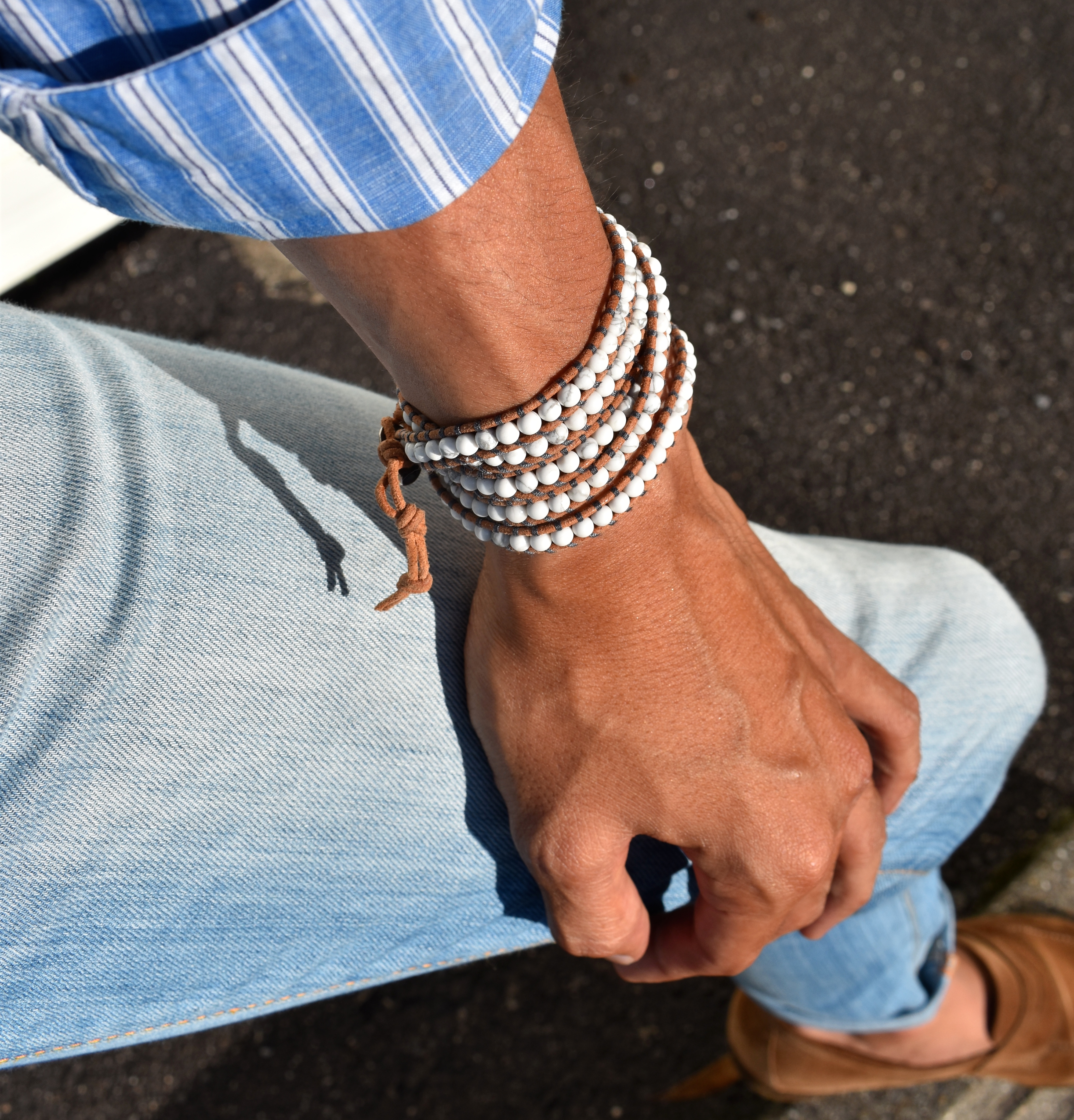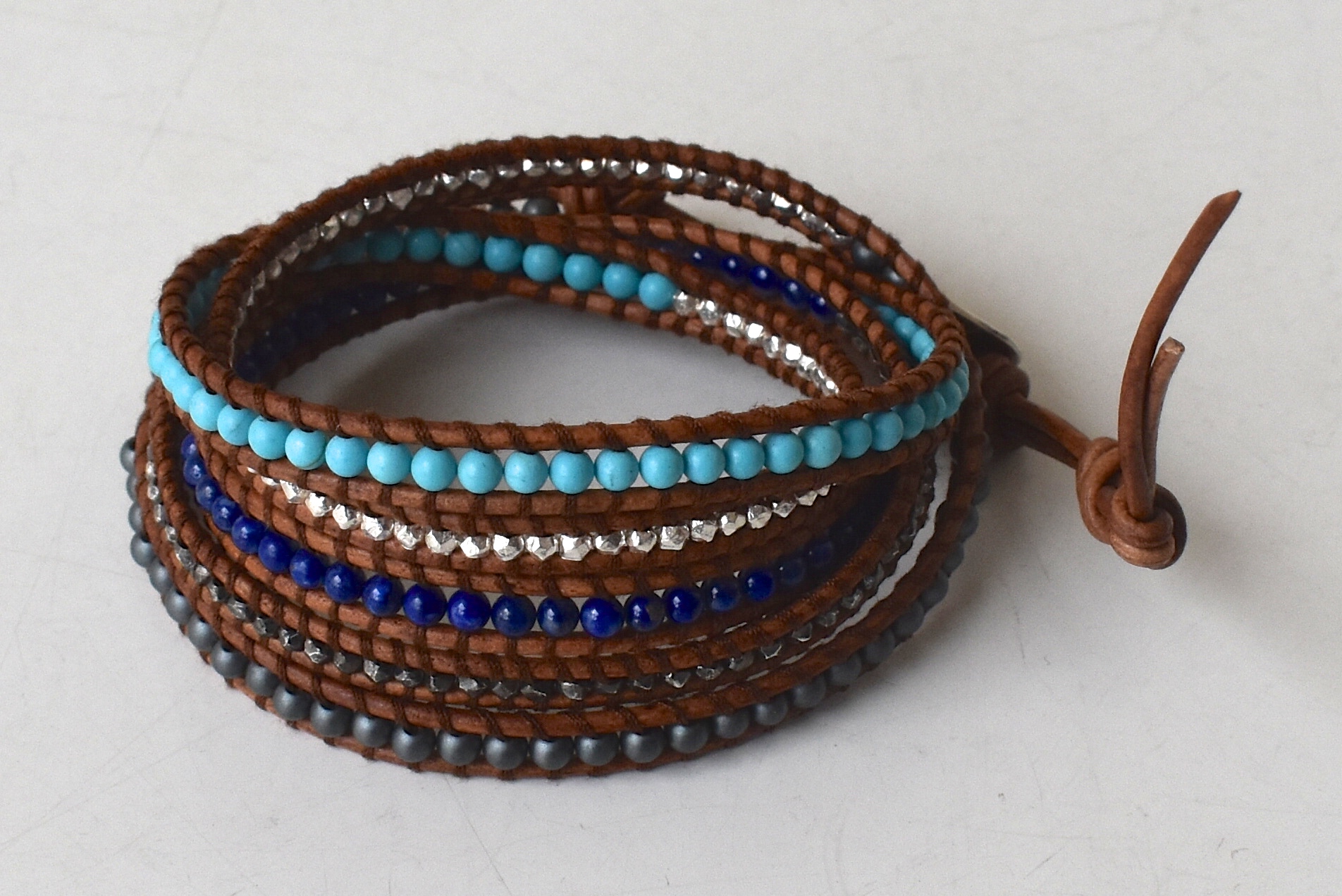 上から、水色の石がマグネサイトターコイズ、真ん中の青色はラピス、一番下の灰色の石はマットヘマタイン。これだけミックスされていれば、手首周りの表情はバッチリ。夏は特に嬉しいですね。
