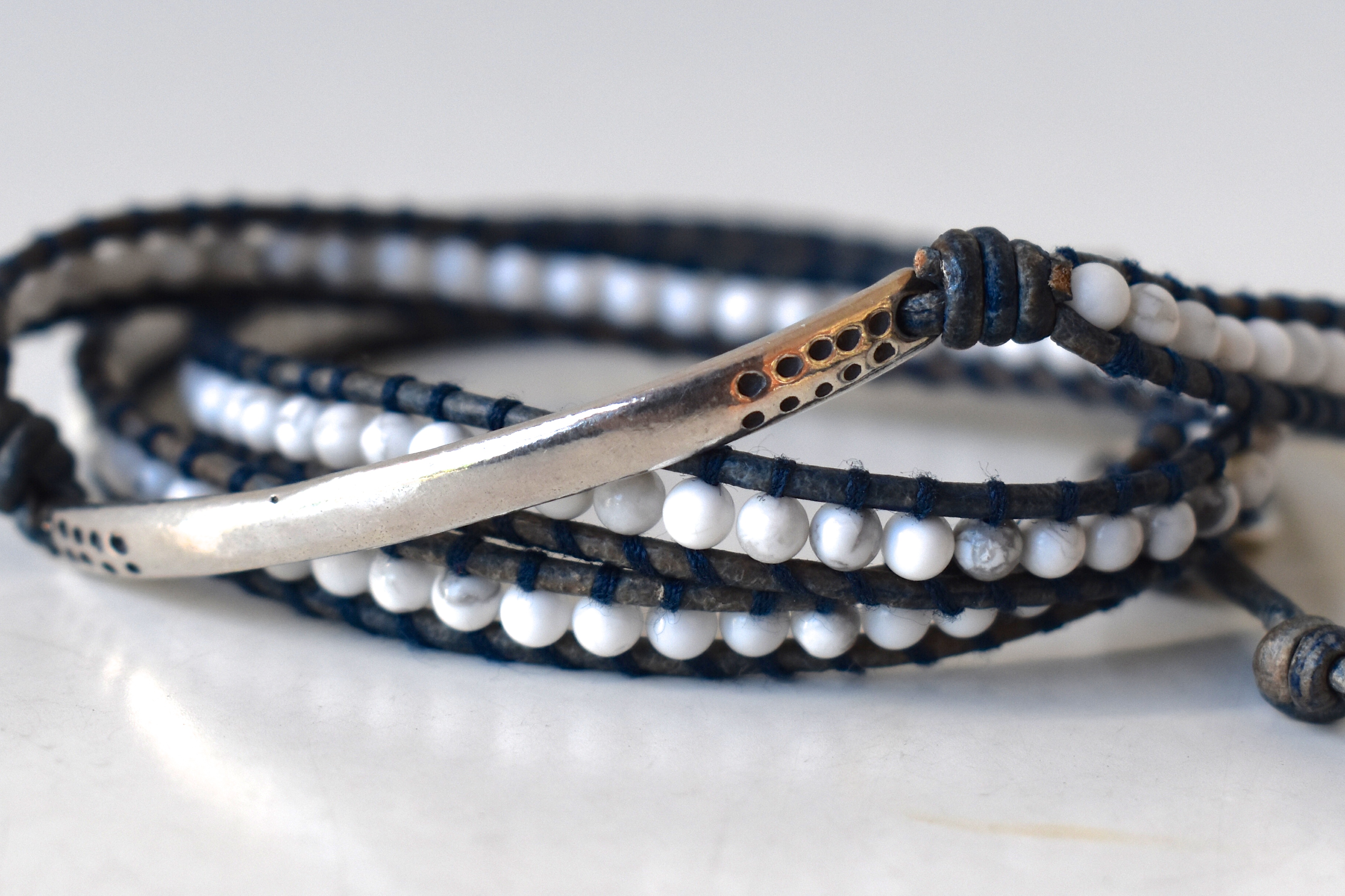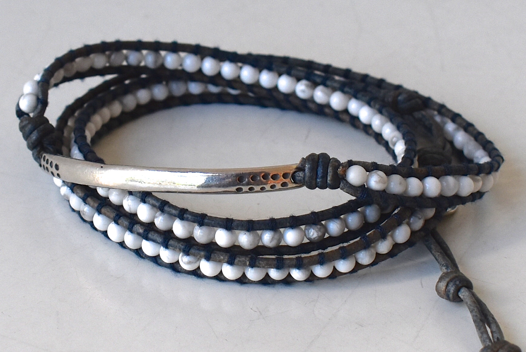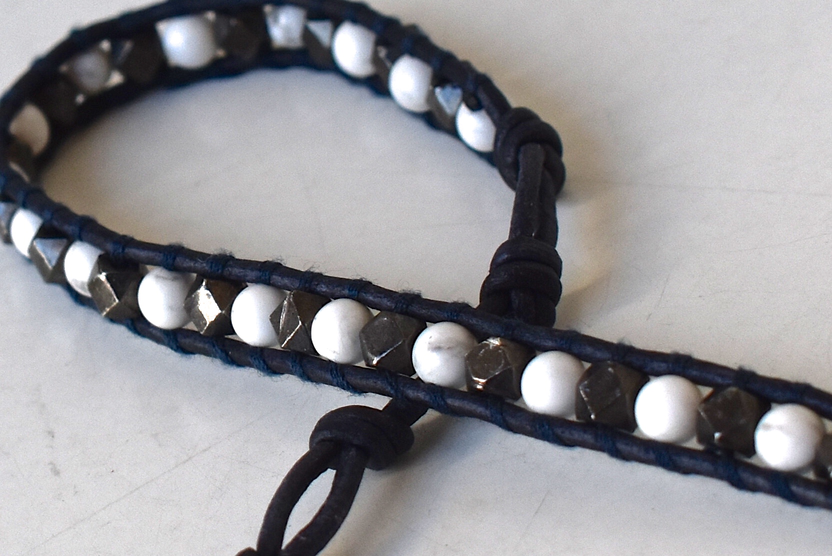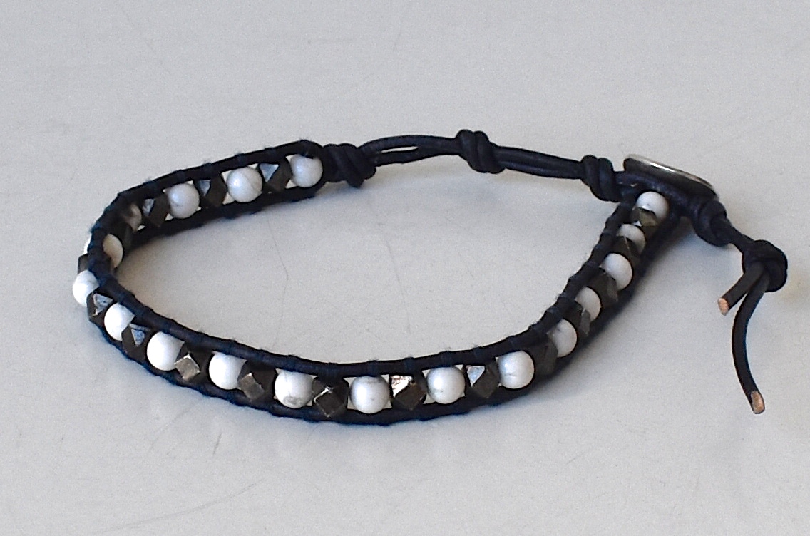 最後は、スッキリ1連タイプ。ハウライトのホワイトストーンに、角張ったシルバー調のビーズを組み合わせた1本。配色は前述の3連タイプと同じく、ホワイトとダークブルーのコンビになります。