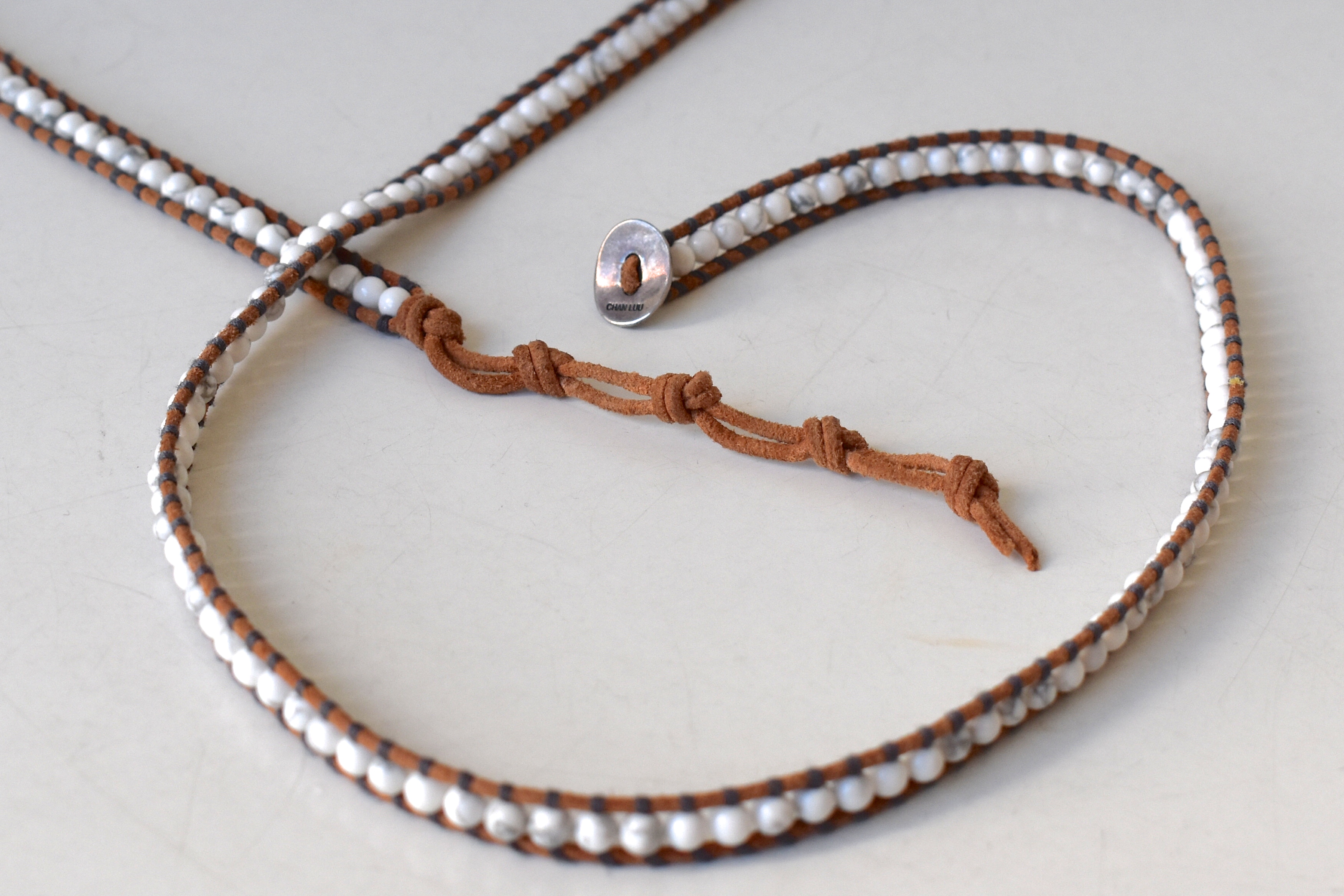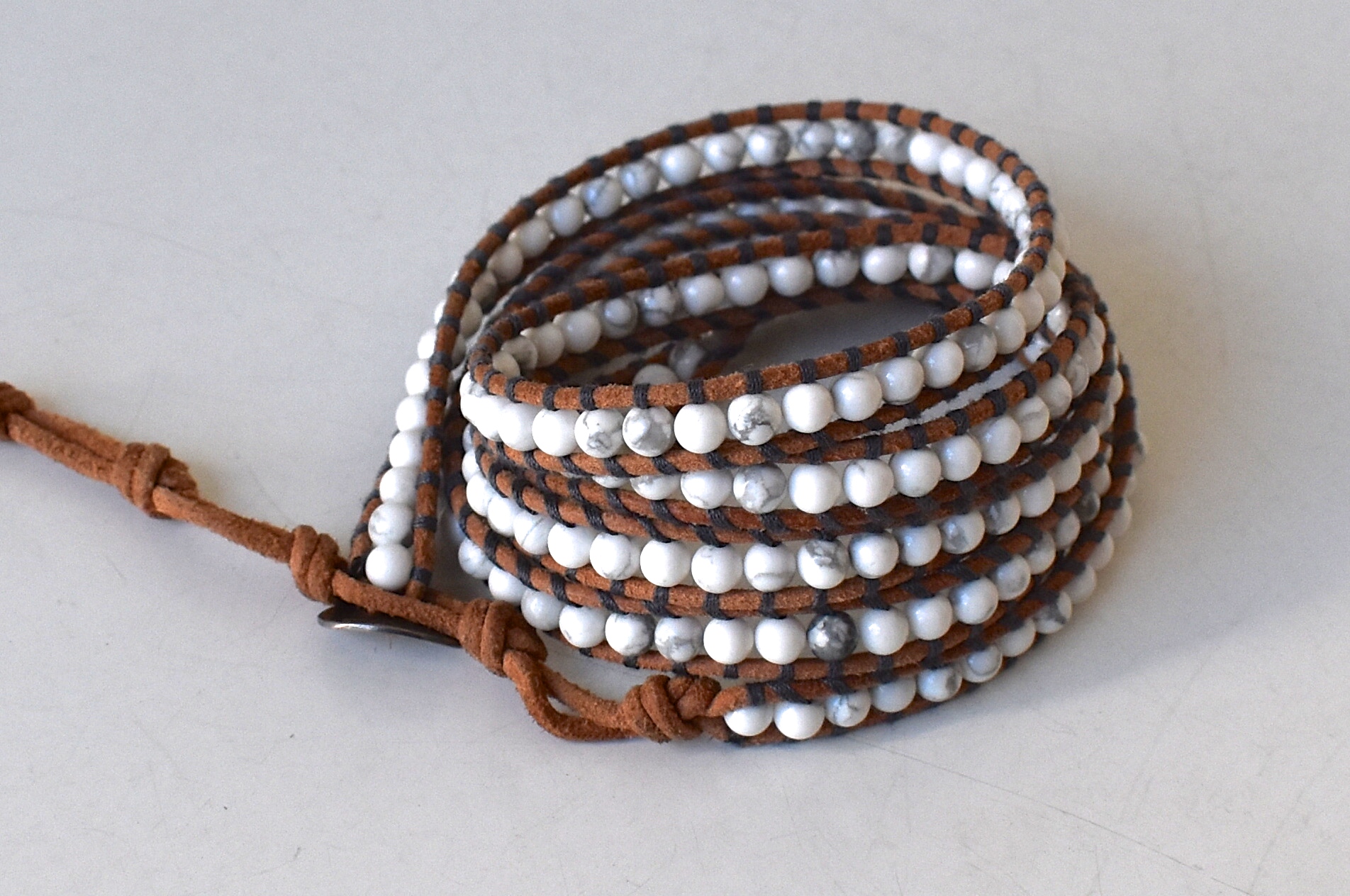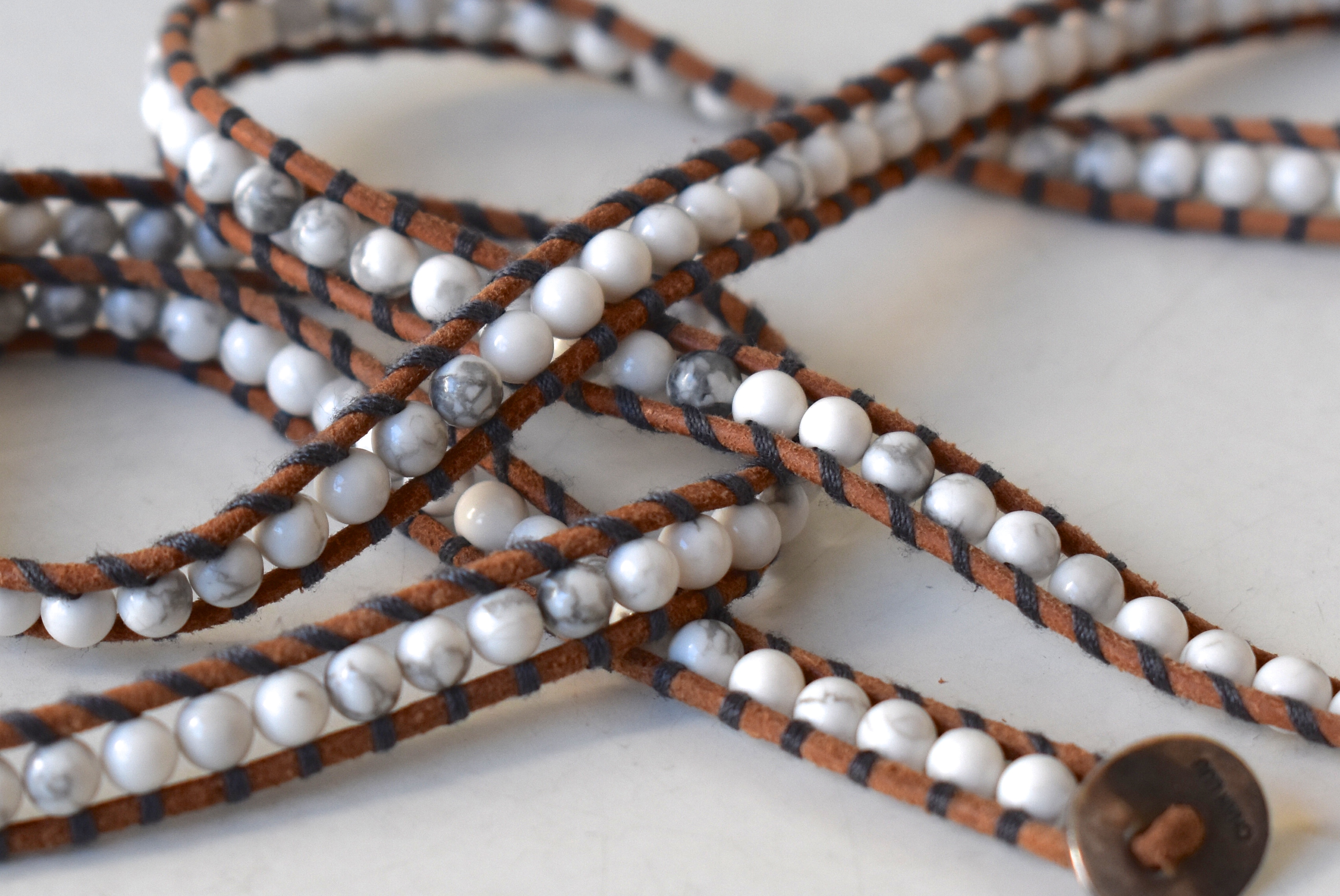 素材は同じくハウライト。白い石のなかには、時折グレイの色むらが入ったストーンが混ざっています。