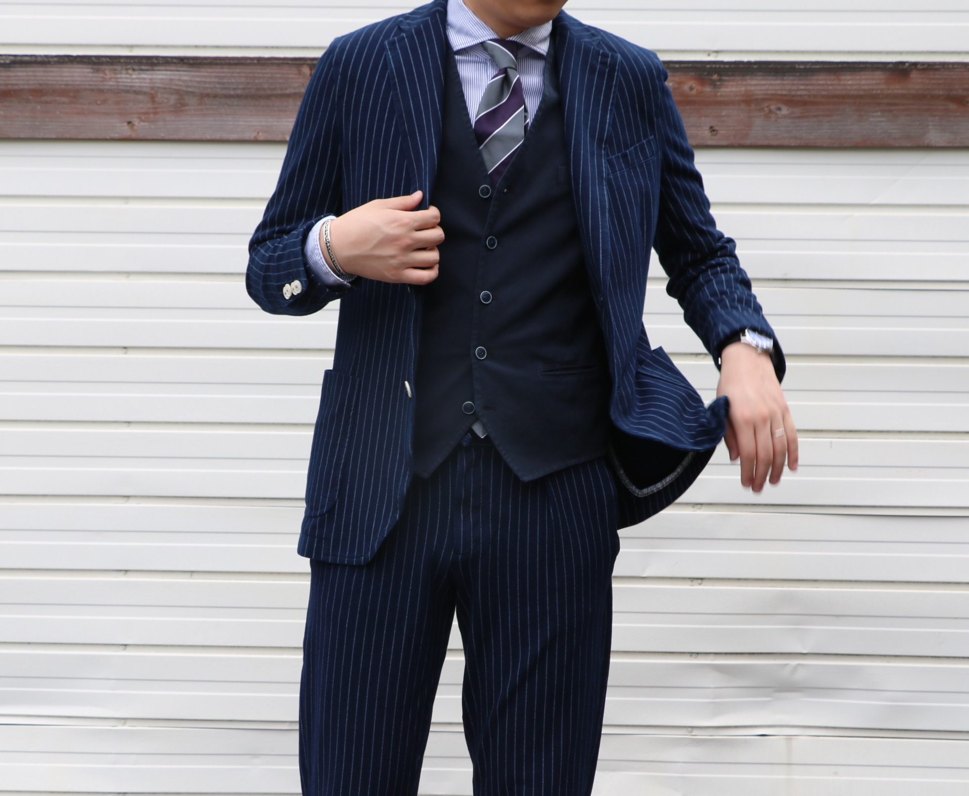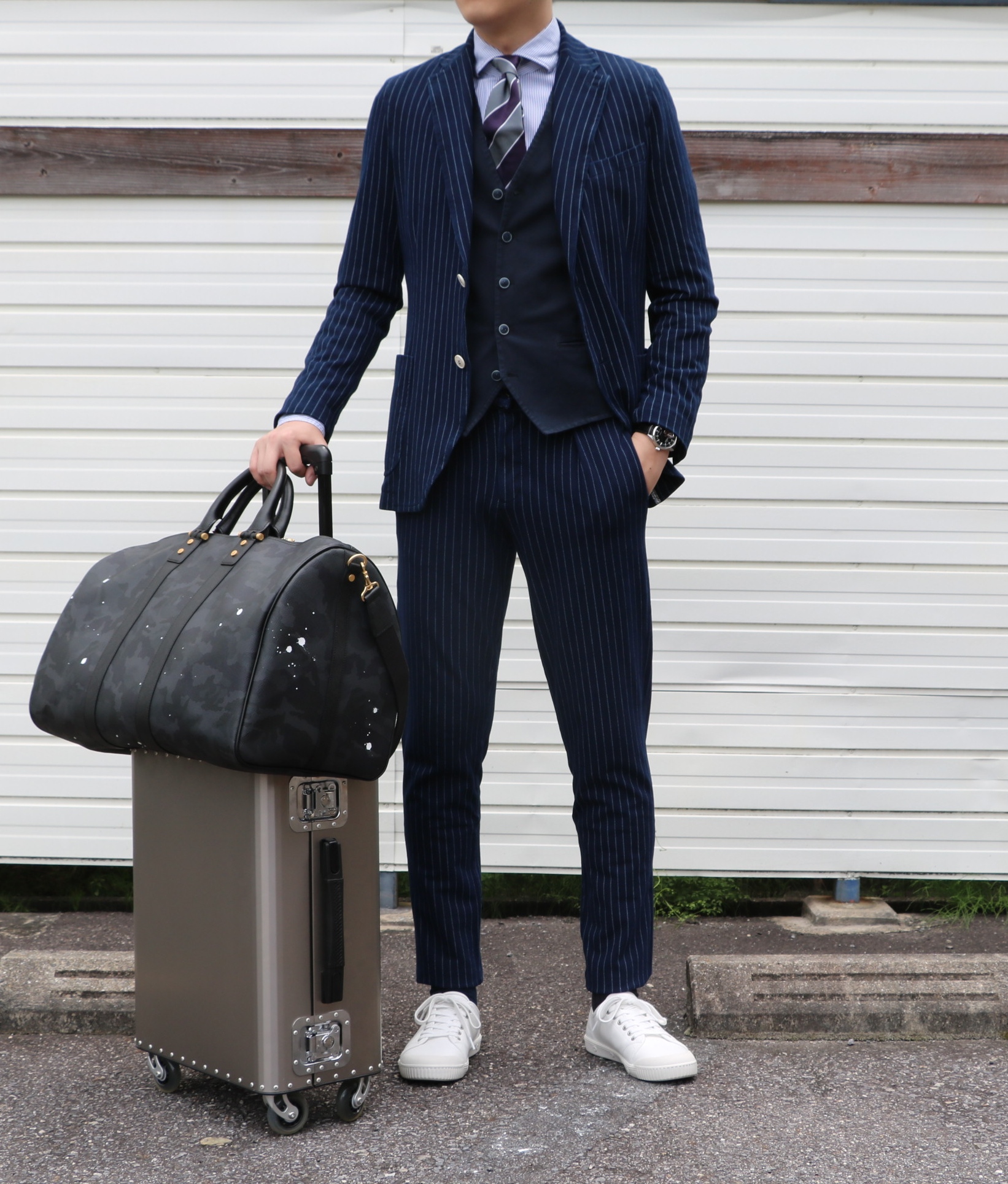 合わせたジレは、CIRCOLO1901、合わせたネクタイは、Holliday&Brown手に持っているボストンバックは、GENTILBANDIT、スーツケースはTecknomonsterです。他は私物になります。