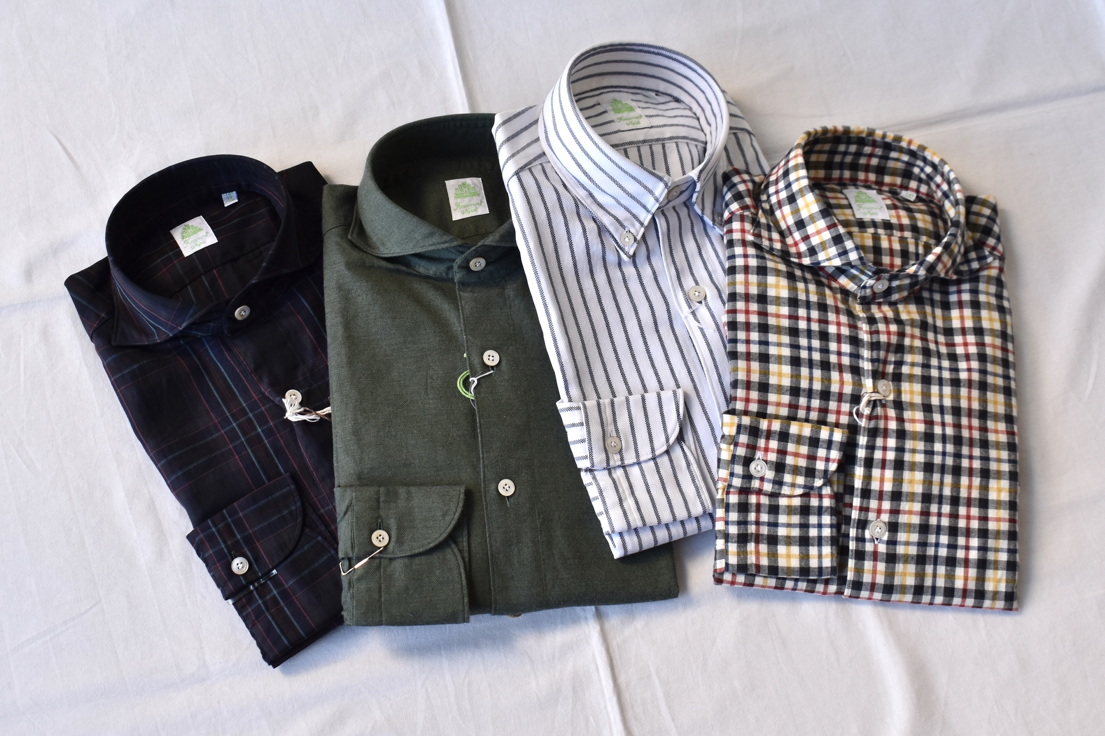 【Finamore/フィナモレ】のシャツです。こちらは、すべて37サイズ。右から、マルチチェック柄、ボタンダウンのストライプ、メランジのツイル無地、ダークトーンのチェック柄。目ぼしいものがあれば、今の内に手に入れておくと良さそうです。