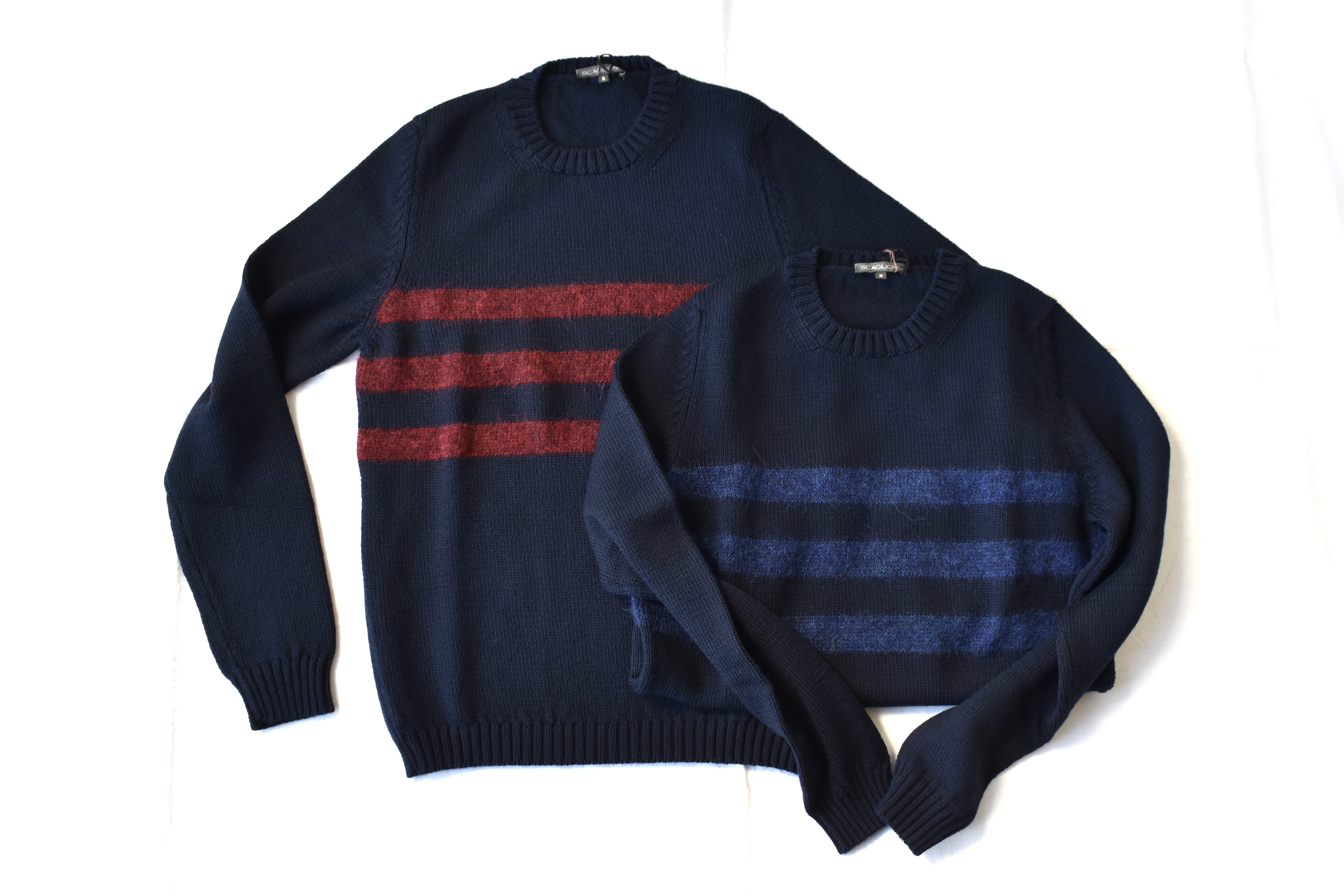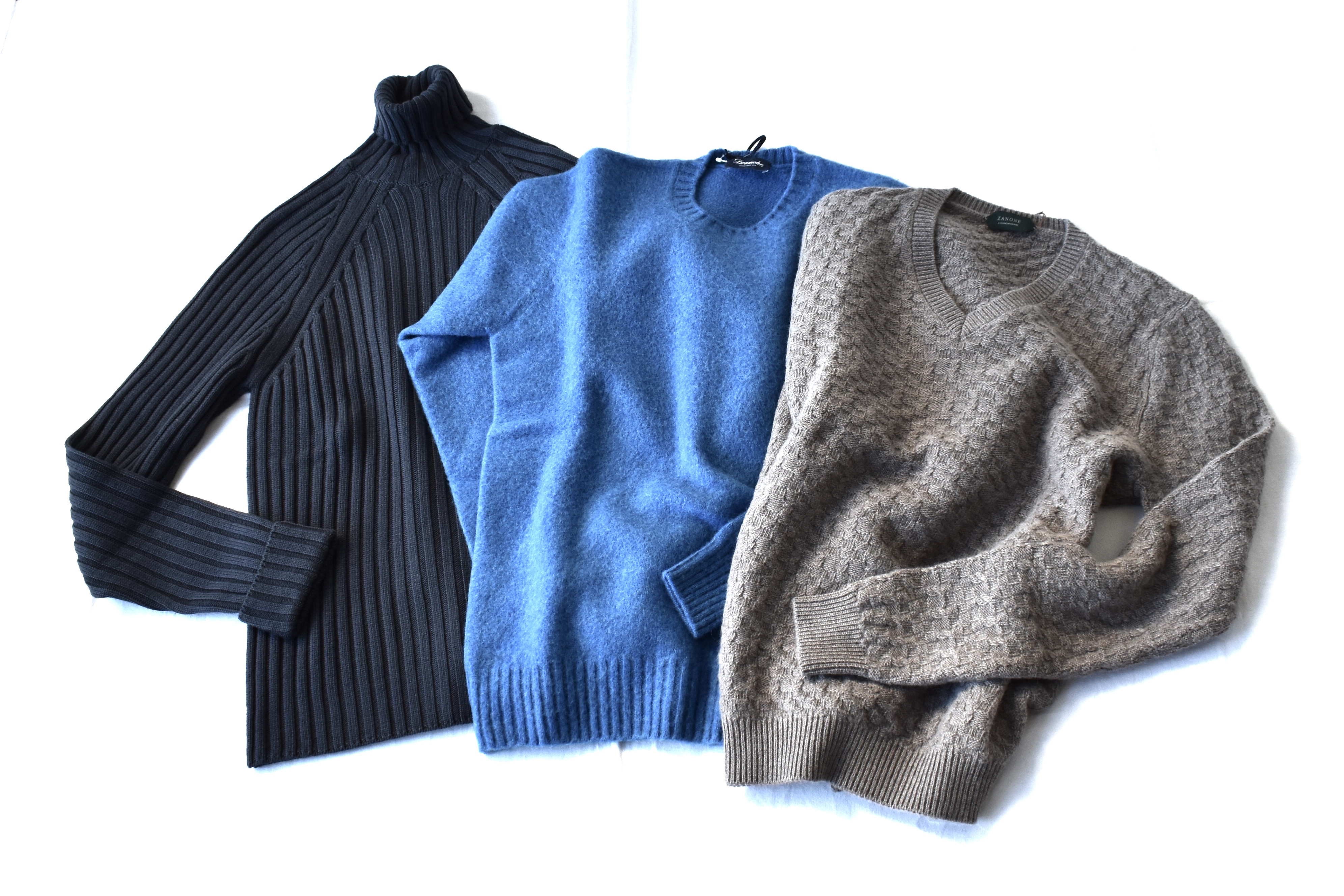 右から、ZANONE/ザノーネのアンゴラ混Vネック。編み柄とベージュの色味が目を引きます。46サイズですが、コンパクトなザノーネですので、44~46サイズの方にお勧め。左の2つは、Drumohr/ドルモア。綺麗なコバルトブルーのシャギーニットに、ほんのり青みを帯びたグレイのリブ編みタートルネック。両者ともに44サイズです。