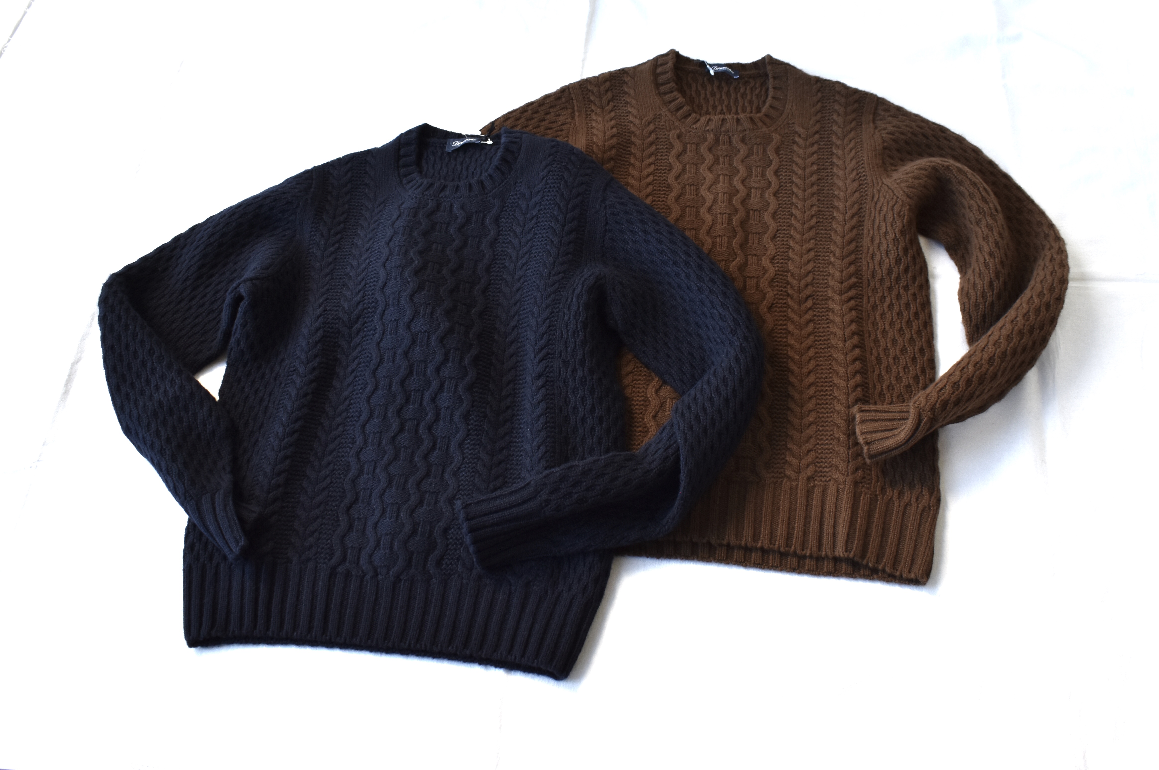 ケーブル編みのクルーネックは、Drumohr/ドルモアから。雰囲気の出るニットだけに、アウターを脱いだ後の店内着や、年末年始の室内着としても活躍しそうです。ブラウンは46サイズが、ネイビーは42と46サイズの在庫があります。