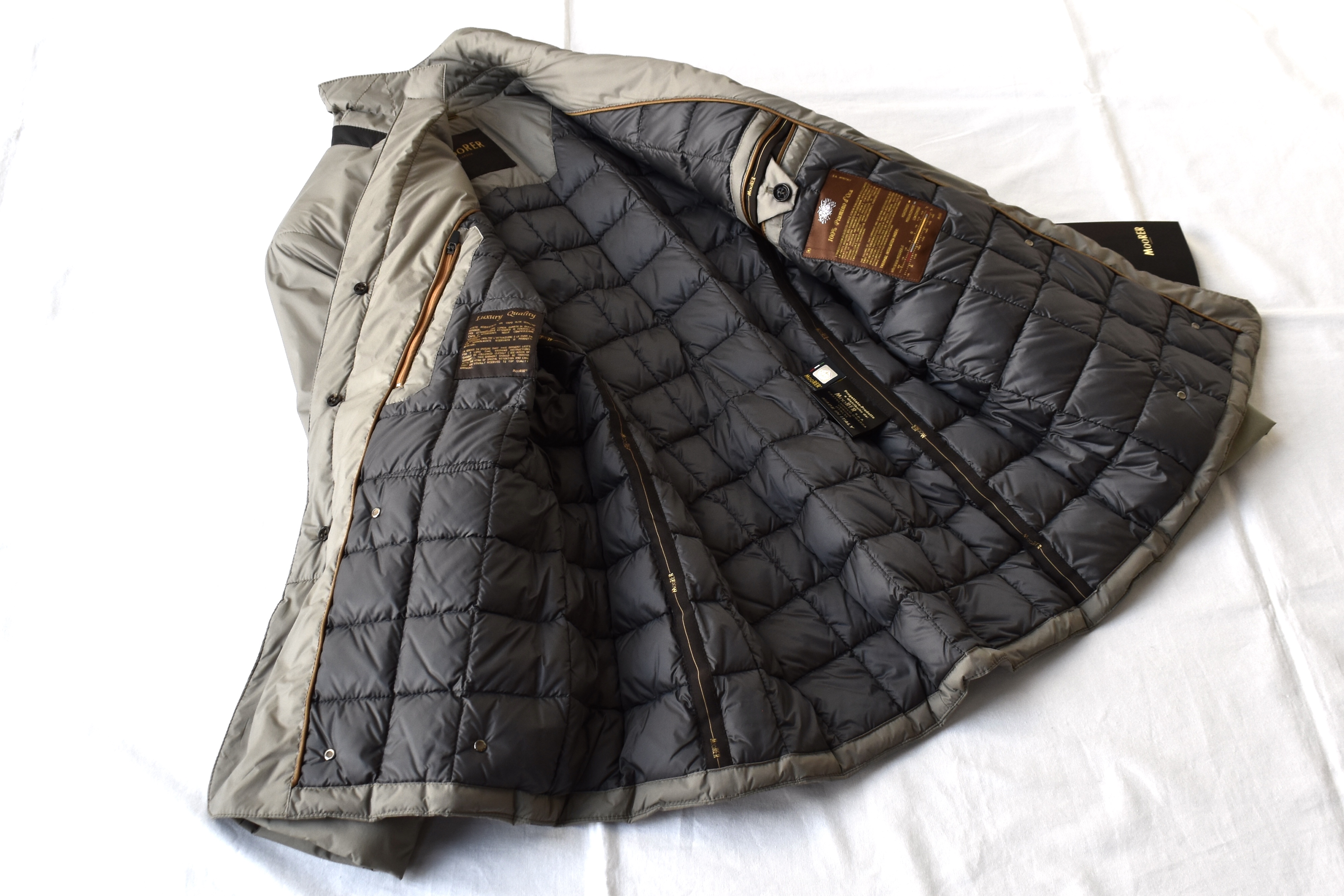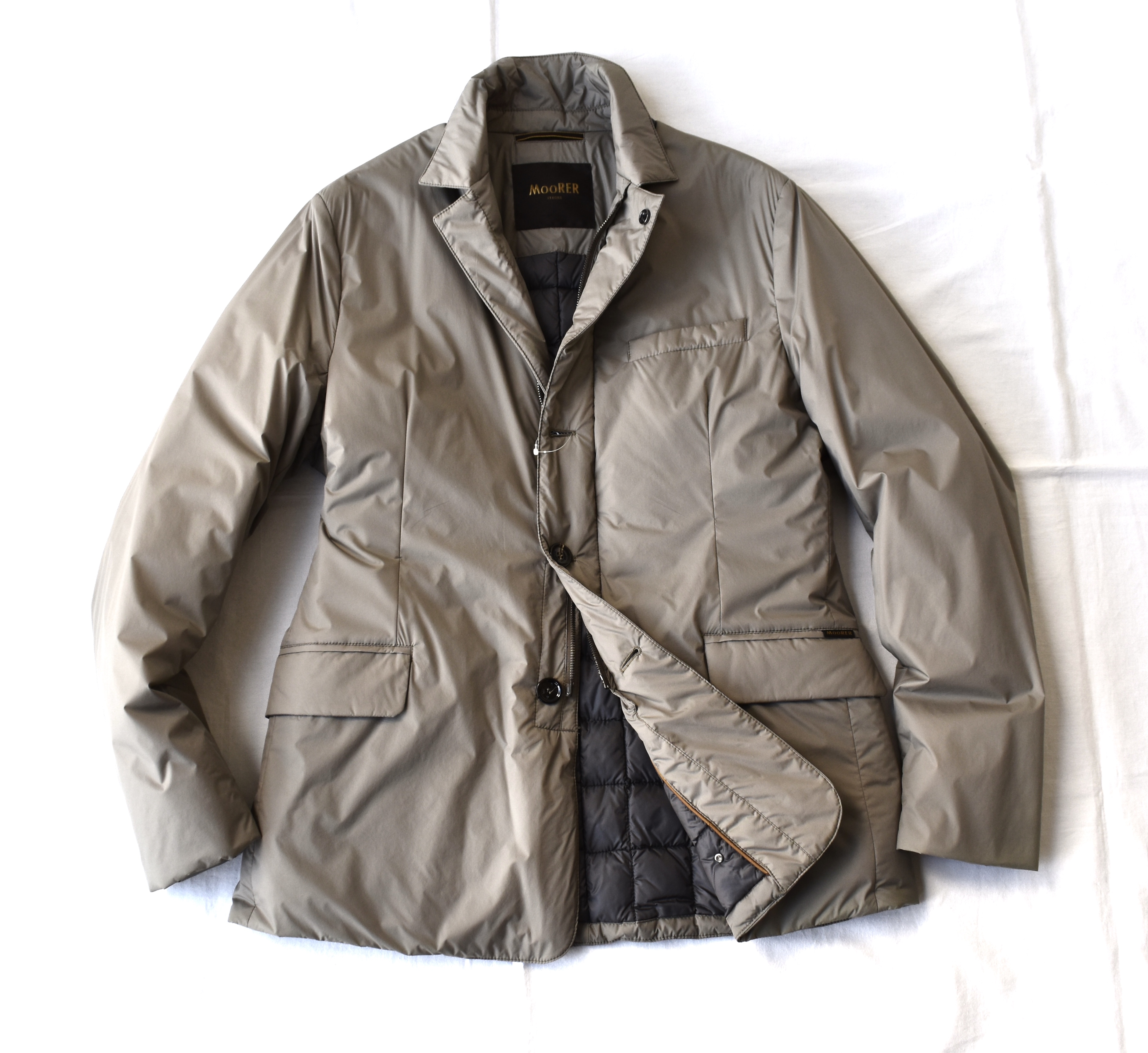 至高のダウンアウターと言えば、MooRER/ムーレー。ジャケット型ブルゾンで、中にダウンが詰められています。ベージュの色味が渋く、アダルトな雰囲気を醸し出します。車移動の多い方にもお勧めでしょうか。